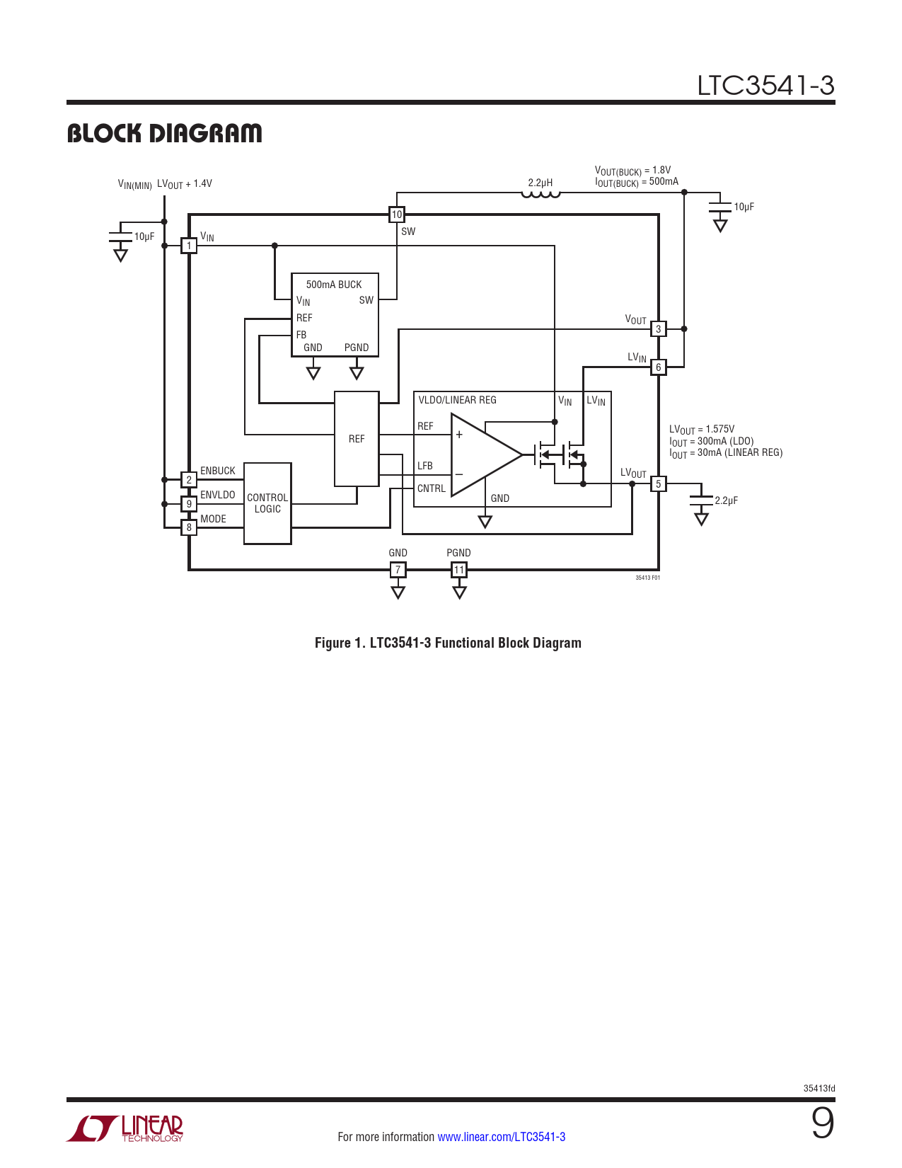VOUT(BUCK) = 1.8V V 2.2μH I IN(MIN) LVOUT + 1.4V OUT(BUCK) = 500mA 10μF 10 10μF V SW IN 1 500mA BUCK VIN SW REF VOUT FB 3 GND PGND LVIN 6 VLDO/LINEAR REG VIN LVIN REF REF + LVOUT = 1.575V IOUT = 300mA (LDO) IOUT = 30mA (LINEAR REG) LFB ENBUCK – LVOUT 2 5 ENVLDO CNTRL CONTROL GND 2.2μF 9 LOGIC MODE 8 GND PGND 7 11 35413 F01