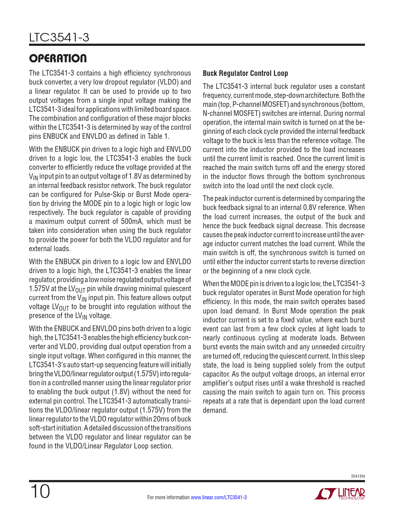 LTC3541-3 OPERATION The LTC3541-3 contains a high efficiency synchronous Buck Regulator Control Loop buck converter, a very low dropout regulator (VLDO) and The LTC3541-3 internal buck regulator uses a constant a linear regulator. It can be used to provide up to two frequency, current mode, step-down architecture. Both the output voltages from a single input voltage making the main (top, P-channel MOSFET) and synchronous (bottom, LTC3541-3 ideal for applications with limited board space. N-channel MOSFET) switches are internal. During normal The combination and configuration of these major blocks operation, the internal main switch is turned on at the be- within the LTC3541-3 is determined by way of the control ginning of each clock cycle provided the internal feedback pins ENBUCK and ENVLDO as defined in Table 1. voltage to the buck is less than the reference voltage. The With the ENBUCK pin driven to a logic high and ENVLDO current into the inductor provided to the load increases driven to a logic low, the LTC3541-3 enables the buck until the current limit is reached. Once the current limit is converter to efficiently reduce the voltage provided at the reached the main switch turns off and the energy stored VIN input pin to an output voltage of 1.8V as determined by in the inductor flows through the bottom synchronous an internal feedback resistor network. The buck regulator switch into the load until the next clock cycle. can be configured for Pulse-Skip or Burst Mode opera- The peak inductor current is determined by comparing the tion by driving the MODE pin to a logic high or logic low buck feedback signal to an internal 0.8V reference. When respectively. The buck regulator is capable of providing the load current increases, the output of the buck and a maximum output current of 500mA, which must be hence the buck feedback signal decrease. This decrease taken into consideration when using the buck regulator causes the peak inductor current to increase until the aver- to provide the power for both the VLDO regulator and for age inductor current matches the load current. While the external loads. main switch is off, the synchronous switch is turned on With the ENBUCK pin driven to a logic low and ENVLDO until either the inductor current starts to reverse direction driven to a logic high, the LTC3541-3 enables the linear or the beginning of a new clock cycle. regulator, providing a low noise regulated output voltage of When the MODE pin is driven to a logic low, the LTC3541-3 1.575V at the LVOUT pin while drawing minimal quiescent buck regulator operates in Burst Mode operation for high current from the VIN input pin. This feature allows output efficiency. In this mode, the main switch operates based voltage LVOUT to be brought into regulation without the upon load demand. In Burst Mode operation the peak presence of the LVIN voltage. inductor current is set to a fixed value, where each burst With the ENBUCK and ENVLDO pins both driven to a logic event can last from a few clock cycles at light loads to high, the LTC3541-3 enables the high efficiency buck con- nearly continuous cycling at moderate loads. Between verter and VLDO, providing dual output operation from a burst events the main switch and any unneeded circuitry single input voltage. When configured in this manner, the are turned off, reducing the quiescent current. In this sleep LTC3541-3’s auto start-up sequencing feature will initially state, the load is being supplied solely from the output bring the VLDO/linear regulator output (1.575V) into regula- capacitor. As the output voltage droops, an internal error tion in a controlled manner using the linear regulator prior amplifier’s output rises until a wake threshold is reached to enabling the buck output (1.8V) without the need for causing the main switch to again turn on. This process external pin control. The LTC3541-3 automatically transi- repeats at a rate that is dependant upon the load current tions the VLDO/linear regulator output (1.575V) from the demand. linear regulator to the VLDO regulator within 20ms of buck soft-start initiation. A detailed discussion of the transitions between the VLDO regulator and linear regulator can be found in the VLDO/Linear Regulator Loop section. 35413fd 10 For more information www.linear.com/LTC3541-3 Document Outline Features Applications Typical Application Description Absolute Maximum Ratings Order Information Pin Configuration Electrical Characteristics Typical Performance Characteristics Pin Functions Block Diagram Operation Applications Information Package Description Revision History Related Parts