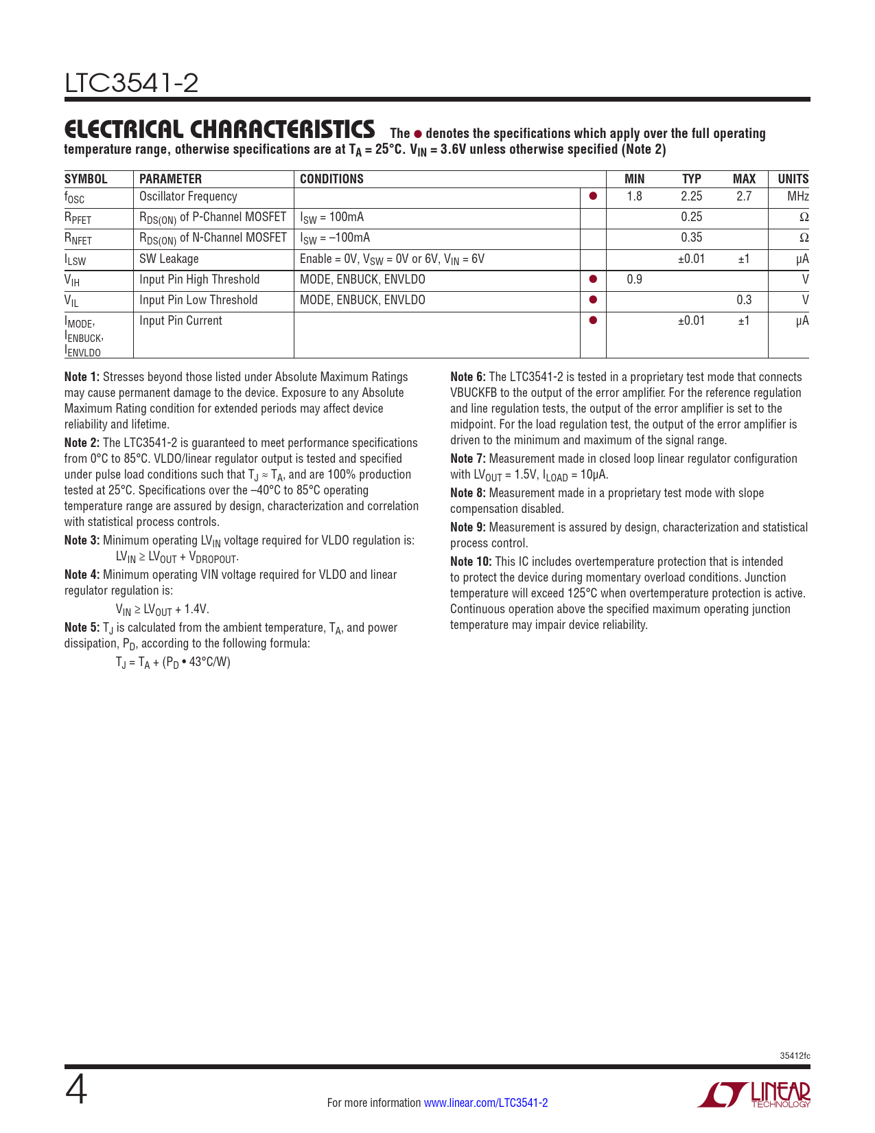 LTC3541-2 ELECTRICAL CHARACTERISTICSThe l denotes the specifications which apply over the full operatingtemperature range, otherwise specifications are at TA = 25°C. VIN = 3.6V unless otherwise specified (Note 2)SYMBOLPARAMETERCONDITIONSMINTYPMAXUNITS fOSC Oscillator Frequency l 1.8 2.25 2.7 MHz RPFET RDS(ON) of P-Channel MOSFET ISW = 100mA 0.25 Ω RNFET RDS(ON) of N-Channel MOSFET ISW = –100mA 0.35 Ω ILSW SW Leakage Enable = 0V, VSW = 0V or 6V, VIN = 6V ±0.01 ±1 μA VIH Input Pin High Threshold MODE, ENBUCK, ENVLDO l 0.9 V VIL Input Pin Low Threshold MODE, ENBUCK, ENVLDO l 0.3 V IMODE, Input Pin Current l ±0.01 ±1 μA IENBUCK, IENVLDO Note 1: Stresses beyond those listed under Absolute Maximum Ratings Note 6: The LTC3541-2 is tested in a proprietary test mode that connects may cause permanent damage to the device. Exposure to any Absolute VBUCKFB to the output of the error amplifier. For the reference regulation Maximum Rating condition for extended periods may affect device and line regulation tests, the output of the error amplifier is set to the reliability and lifetime. midpoint. For the load regulation test, the output of the error amplifier is Note 2: The LTC3541-2 is guaranteed to meet performance specifications driven to the minimum and maximum of the signal range. from 0°C to 85°C. VLDO/linear regulator output is tested and specified Note 7: Measurement made in closed loop linear regulator configuration under pulse load conditions such that TJ ≈ TA, and are 100% production with LVOUT = 1.5V, ILOAD = 10µA. tested at 25°C. Specifications over the –40°C to 85°C operating Note 8: Measurement made in a proprietary test mode with slope temperature range are assured by design, characterization and correlation compensation disabled. with statistical process controls. Note 9: Measurement is assured by design, characterization and statistical Note 3: Minimum operating LVIN voltage required for VLDO regulation is: process control. LVIN ≥ LVOUT + VDROPOUT. Note 10: This IC includes overtemperature protection that is intended Note 4: Minimum operating VIN voltage required for VLDO and linear to protect the device during momentary overload conditions. Junction regulator regulation is: temperature will exceed 125°C when overtemperature protection is active. VIN ≥ LVOUT + 1.4V. Continuous operation above the specified maximum operating junction Note 5: T temperature may impair device reliability. J is calculated from the ambient temperature, TA, and power dissipation, PD, according to the following formula: TJ = TA + (PD • 43°C/W) 35412fc 4 For more information www.linear.com/LTC3541-2 Document Outline Features Applications Typical Application Description Absolute Maximum Ratings Order Information Pin Configuration Electrical Characteristics Typical Performance Characteristics Pin Functions Block Diagram Operation Operation Applications Information Package Description Revision History Related Parts