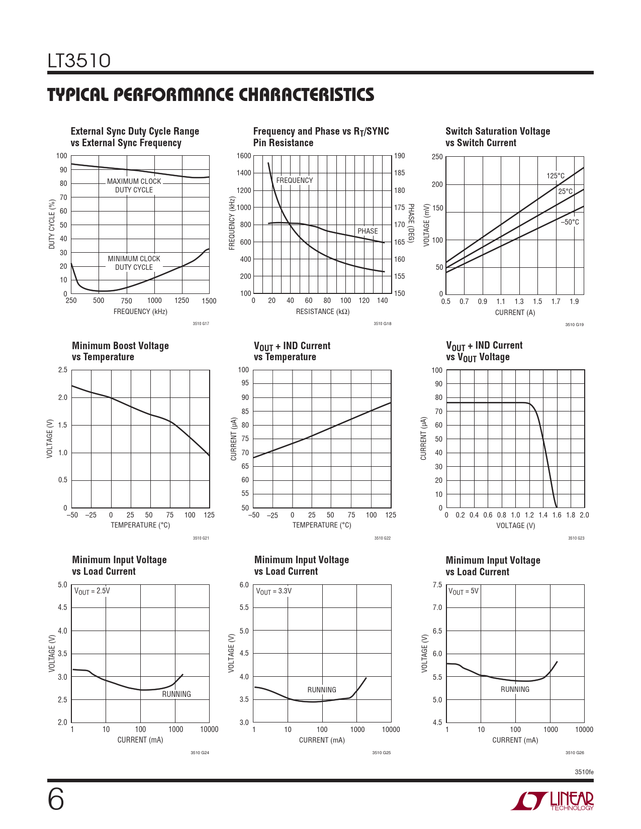 100 1600 190 250 90 1400 185 125°C 80 MAXIMUM CLOCK FREQUENCY 200 DUTY CYCLE 1200 180 25°C 70 PHASE (DEG) 1000 175 60 150 50 800 170 –50°C PHASE Y CYCLE (%) TAGE (mV) 40 600 165 100 DUT FREQUENCY (kHz) VOL 30 MINIMUM CLOCK 400 160 20 DUTY CYCLE 50 200 155 10 0 100 150 0 250 500 750 1000 1250 1500 0 20 40 60 80 100 120 140 0.5 0.7 0.9 1.1 1.3 1.5 1.7 1.9 FREQUENCY (kHz) RESISTANCE (kΩ) CURRENT (A) 3510 G17 3510 G18 3510 G19