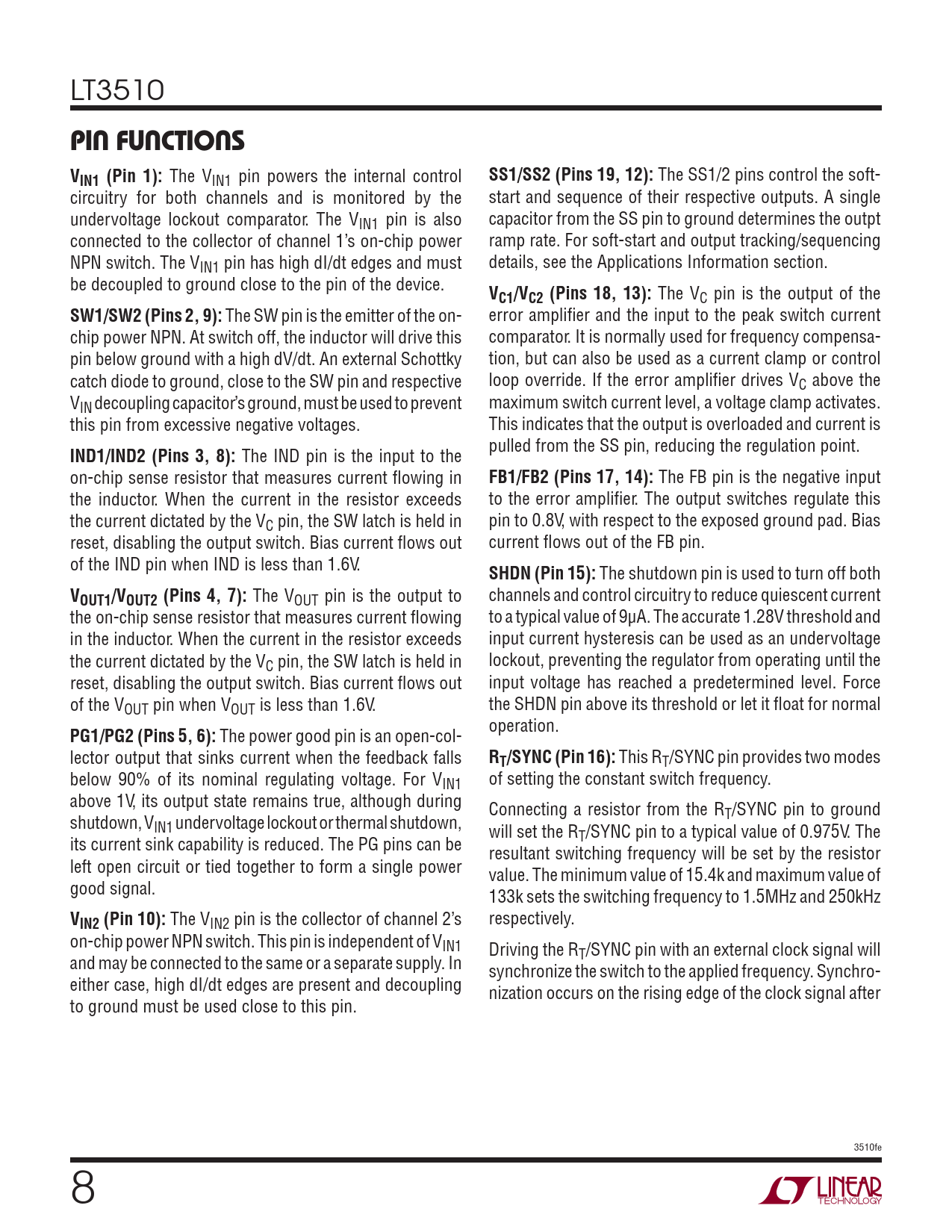 The VIN2 pin is the collector of channel 2’s respectively. on-chip power NPN switch. This pin is independent of VIN1 Driving the R and may be connected to the same or a separate supply. In T/SYNC pin with an external clock signal will synchronize the switch to the applied frequency. Synchro- either case, high dI/dt edges are present and decoupling nization occurs on the rising edge of the clock signal after to ground must be used close to this pin. 3510fe 8 Document Outline FEATURES DESCRIPTION APPLICATIONS TYPICAL APPLICATION ABSOLUTE MAXIMUM RATINGS PIN CONFIGURATION ORDER INFORMATION ELECTRICAL CHARACTERISTICS TYPICAL PERFORMANCE CHARACTERISTICS PIN FUNCTIONS BLOCK DIAGRAM APPLICATIONS INFORMATION TYPICAL APPLICATIONS PACKAGE DESCRIPTION REVISION HISTORY RELATED PARTS