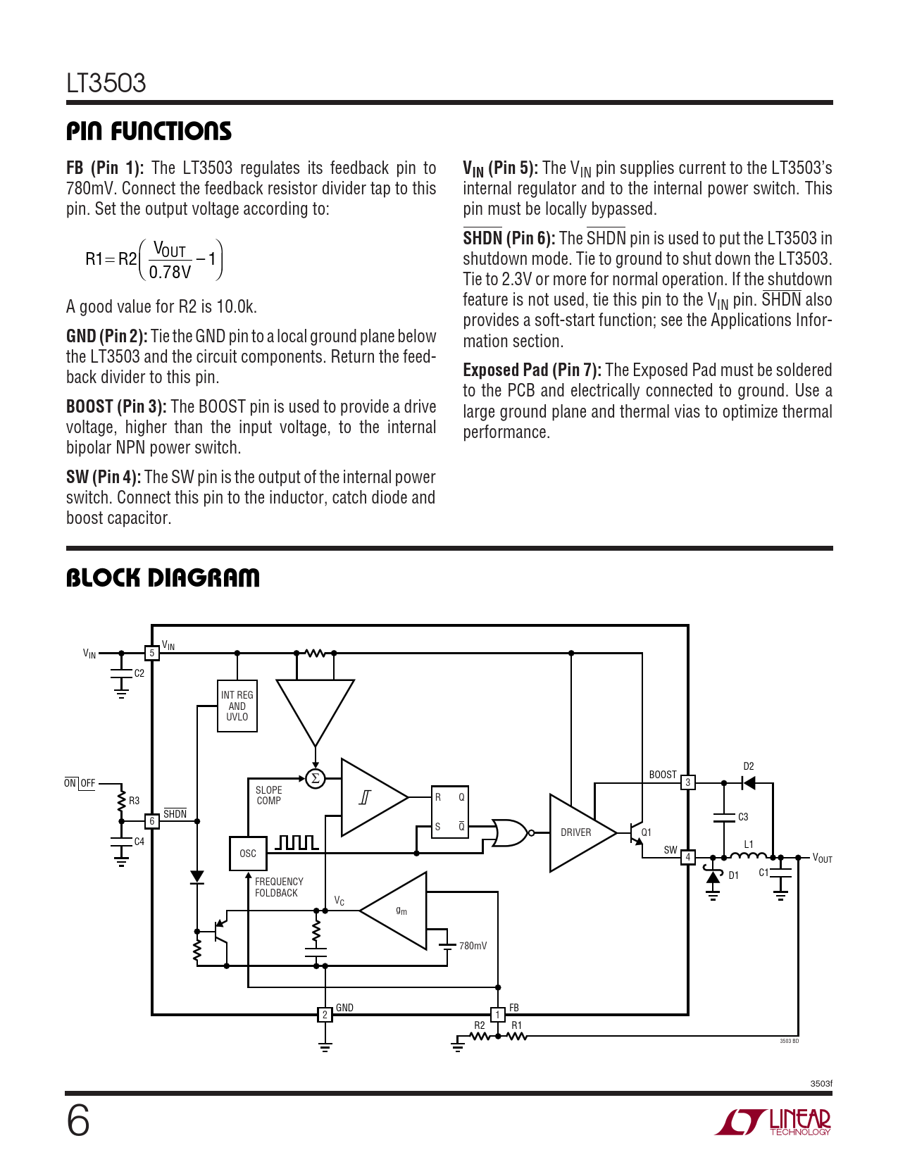 The VIN pin supplies current to the LT3503’s 780mV. Connect the feedback resistor divider tap to this internal regulator and to the internal power switch. This pin. Set the output voltage according to: pin must be locally bypassed.