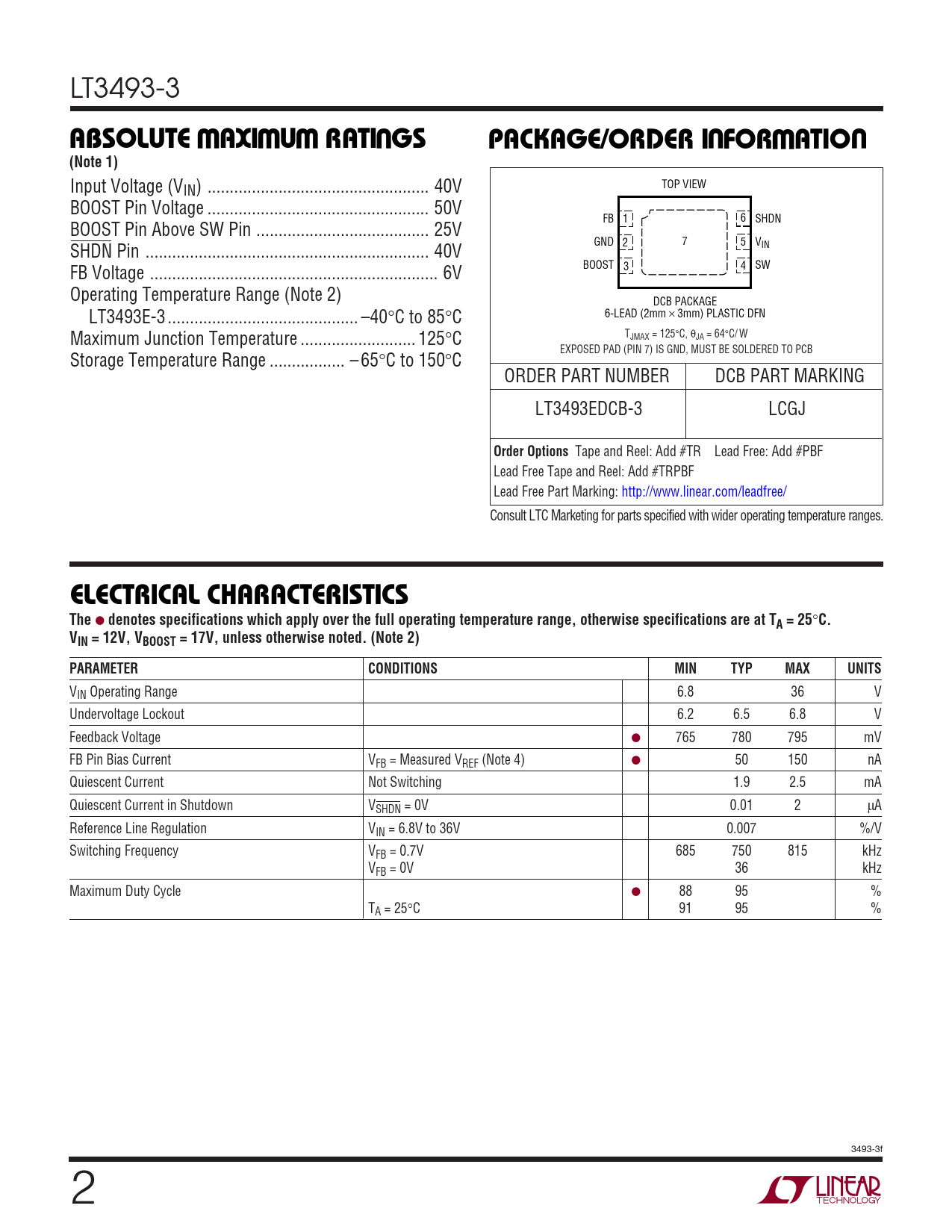 LT3493-3 WWWUUWUABSOLUTE AXI U RATI GSPACKAGE/ORDER I FOR ATIO(Note 1) Input Voltage (VIN) .. 40V TOP VIEW BOOST Pin Voltage .. 50V FB 1 6 SHDN BOOST Pin Above SW Pin ... 25V GND 2 7 5 V SHDN Pin .. 40V IN FB Voltage ... 6V BOOST 3 4 SW Operating Temperature Range (Note 2) DCB PACKAGE LT3493E-3 ... –40°C to 85°C 6-LEAD (2mm × 3mm) PLASTIC DFN Maximum Junction Temperature .. 125°C TJMAX = 125°C, θJA = 64°C/ W EXPOSED PAD (PIN 7) IS GND, MUST BE SOLDERED TO PCB Storage Temperature Range ... – 65°C to 150°C ORDER PART NUMBER DCB PART MARKING LT3493EDCB-3 LCGJ Order Options Tape and Reel: Add #TR Lead Free: Add #PBF Lead Free Tape and Reel: Add #TRPBF Lead Free Part Marking: http://www.linear.com/leadfree/ Consult LTC Marketing for parts specified with wider operating temperature ranges. ELECTRICAL CHARACTERISTICSThe ● denotes specifications which apply over the full operating temperature range, otherwise specifications are at TA = 25 ° C. VIN = 12V, VBOOST = 17V, unless otherwise noted. (Note 2)PARAMETERCONDITIONSMINTYPMAXUNITS VIN Operating Range 6.8 36 V Undervoltage Lockout 6.2 6.5 6.8 V Feedback Voltage ● 765 780 795 mV FB Pin Bias Current VFB = Measured VREF (Note 4) ● 50 150 nA Quiescent Current Not Switching 1.9 2.5 mA Quiescent Current in Shutdown VSHDN = 0V 0.01 2 µA Reference Line Regulation VIN = 6.8V to 36V 0.007 %/V Switching Frequency VFB = 0.7V 685 750 815 kHz VFB = 0V 36 kHz Maximum Duty Cycle ● 88 95 % TA = 25°C 91 95 % 3493-3f 2