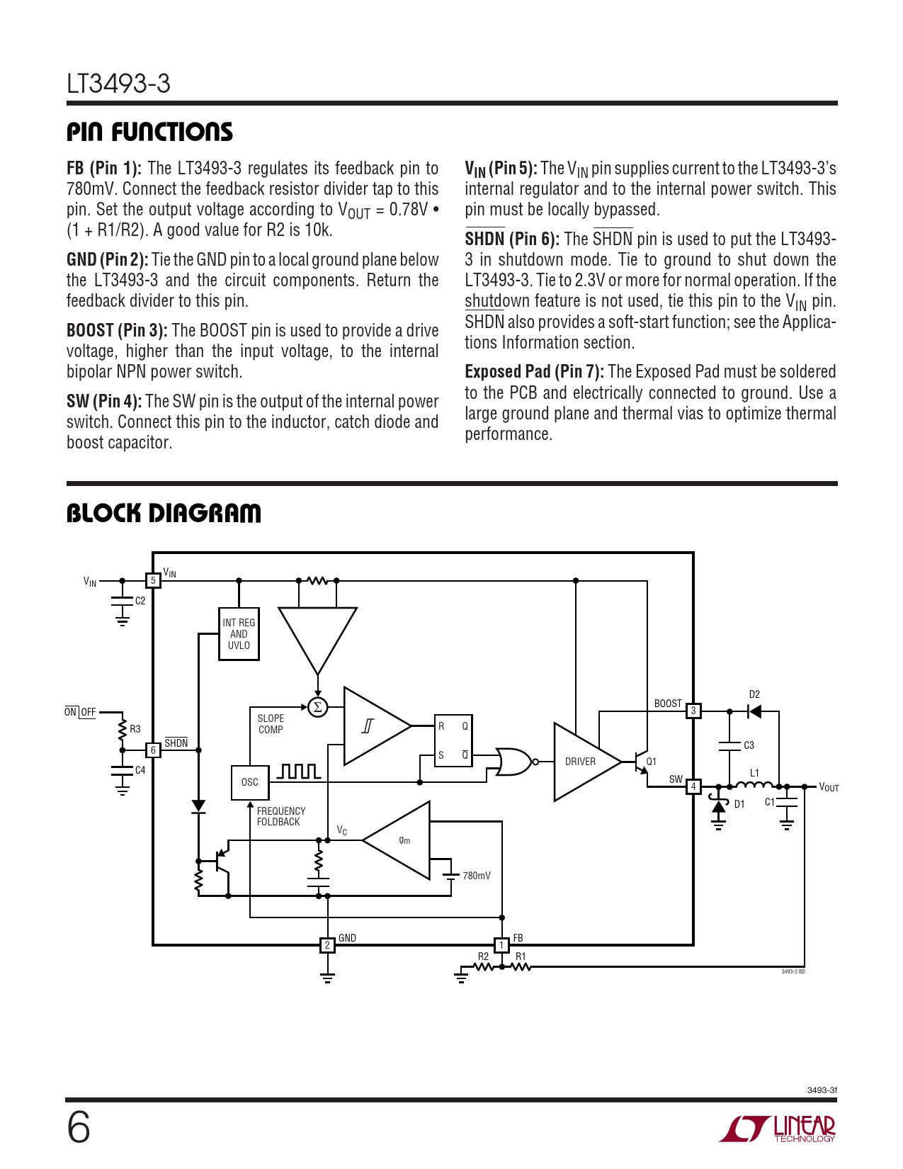 VIN V 5 IN C2 INT REG AND UVLO D2 ON OFF Σ BOOST 3 SLOPE R R3 COMP Q SHDN 6 C3 S Q DRIVER Q1 C4 L1 OSC SW 4 VOUT C1 D1 FREQUENCY FOLDBACK VC gm 780mV GND FB 2 1 R2 R1 3493-3 BD 3493-3f 6