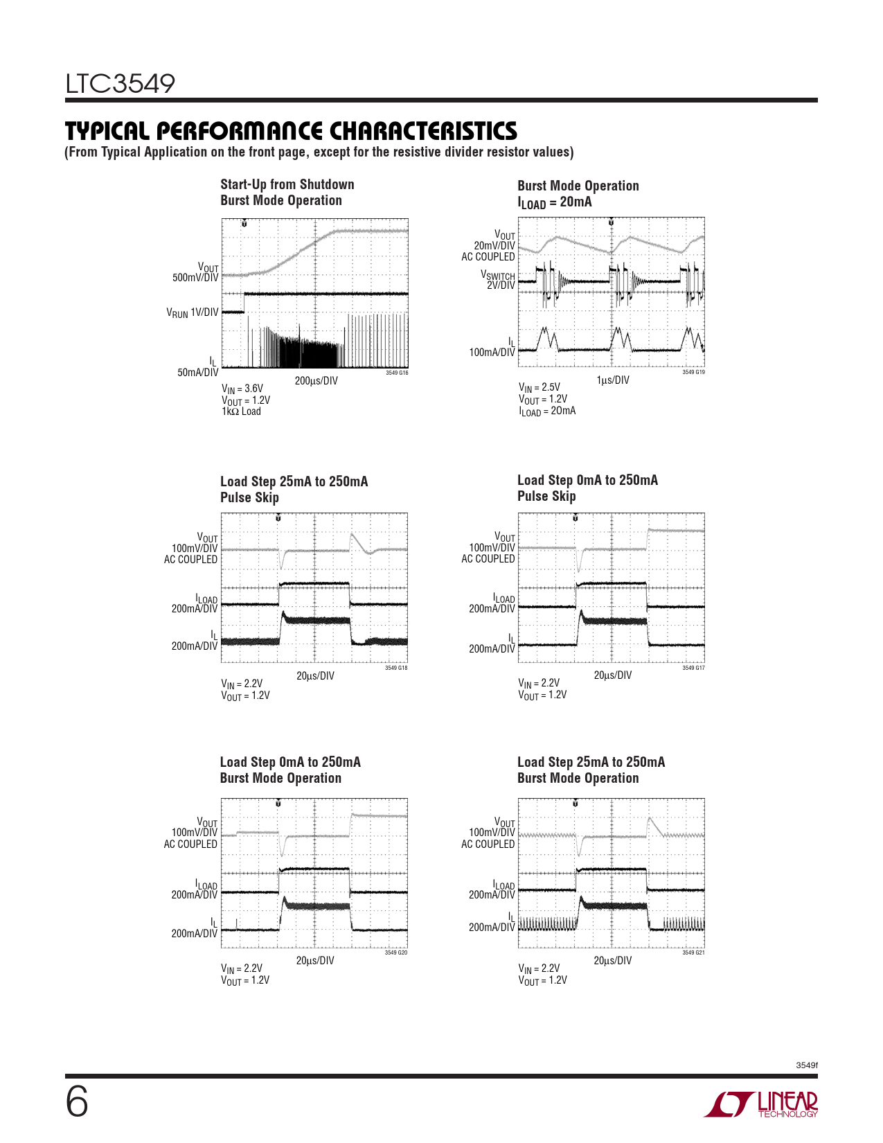 V V OUT OUT 100mV/DIV 100mV/DIV AC COUPLED AC COUPLED I I LOAD LOAD 200mA/DIV 200mA/DIV IL IL 200mA/DIV 200mA/DIV 3549 G18 3549 G17 20µs/DIV 20µs/DIV V V IN = 2.2V IN = 2.2V V V OUT = 1.2V OUT = 1.2V