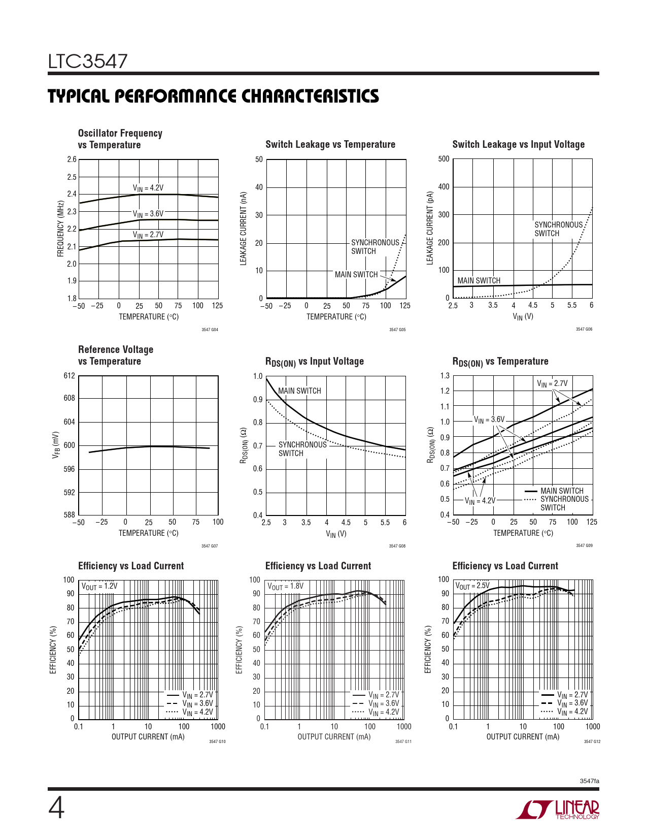 2.6 50 500 2.5 VIN = 4.2V 40 400 2.4 2.3 VIN = 3.6V 30 300 SYNCHRONOUS 2.2 V SWITCH IN = 2.7V 20 SYNCHRONOUS 200 2.1 FREQUENCY (MHz) SWITCH 2.0 LEAKAGE CURRENT (nA) LEAKAGE CURRENT (pA) 10 100 MAIN SWITCH 1.9 MAIN SWITCH 1.8 0 0 – 50 – 25 0 25 50 75 100 125 – 50 – 25 0 25 50 75 100 125 2.5 3 3.5 4 4.5 5 5.5 6 TEMPERATURE (°C) TEMPERATURE (°C) VIN (V) 3547 G04 3547 G05 3547 G06