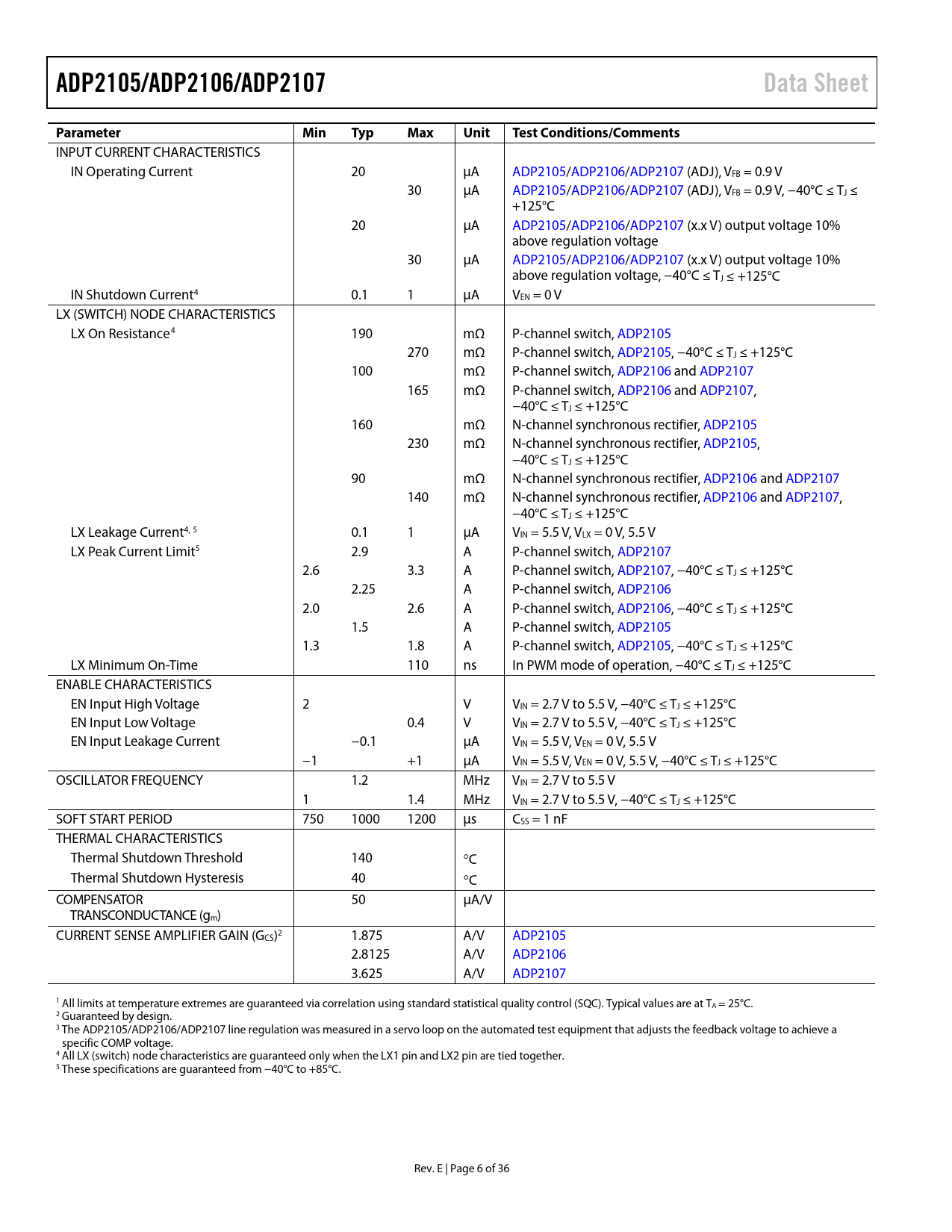 | Pages / Page | 36 / 6 — ADP2105/ADP2106/ADP2107. Data Sheet. Parameter. Min. Typ. Max. Unit. Test … |
