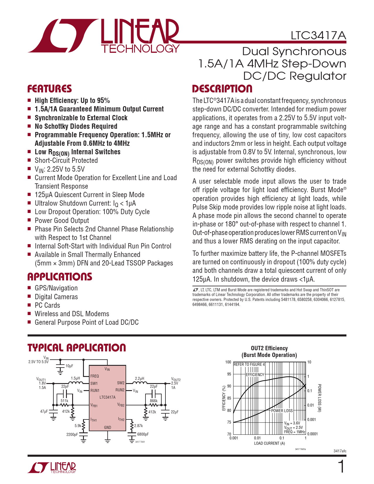 LTC3417A Dual Synchronous 1.5A/1A 4MHz Step-Down DC/DC Regulator FeaTuresDescripTion n High Efficiency: Up to 95% The LTC®3417A is a dual constant frequency, synchronous n 1.5A/1A Guaranteed Minimum Output Current step-down DC/DC converter. Intended for medium power n Synchronizable to External Clock applications, it operates from a 2.25V to 5.5V input volt- n No Schottky Diodes Required age range and has a constant programmable switching n Programmable Frequency Operation: 1.5MHz or frequency, allowing the use of tiny, low cost capacitors Adjustable From 0.6MHz to 4MHz and inductors 2mm or less in height. Each output voltage n Low RDS(ON) Internal Switches is adjustable from 0.8V to 5V. Internal, synchronous, low n Short-Circuit Protected RDS(ON) power switches provide high efficiency without n VIN: 2.25V to 5.5V the need for external Schottky diodes. n Current Mode Operation for Excellent Line and Load A user selectable mode input allows the user to trade Transient Response off ripple voltage for light load efficiency. Burst Mode® n 125µA Quiescent Current in Sleep Mode operation provides high efficiency at light loads, while n Ultralow Shutdown Current: IQ < 1µA Pulse Skip mode provides low ripple noise at light loads. n Low Dropout Operation: 100% Duty Cycle A phase mode pin allows the second channel to operate n Power Good Output in-phase or 180° out-of-phase with respect to channel 1. n Phase Pin Selects 2nd Channel Phase Relationship Out-of-phase operation produces lower RMS current on VIN with Respect to 1st Channel and thus a lower RMS derating on the input capacitor. n Internal Soft-Start with Individual Run Pin Control n Available in Small Thermally Enhanced To further maximize battery life, the P-channel MOSFETs (5mm × 3mm) DFN and 20-Lead TSSOP Packages are turned on continuously in dropout (100% duty cycle) applicaTions and both channels draw a total quiescent current of only 125µA. In shutdown, the device draws <1µA. n GPS/Navigation L, LT, LTC, LTM and Burst Mode are registered trademarks and Hot Swap and ThinSOT are trademarks of Linear Technology Corporation. All other trademarks are the property of their n Digital Cameras respective owners. Protected by U.S. Patents including 5481178, 6580258, 6304066, 6127815, n PC Cards 6498466, 6611131, 6144194. n Wireless and DSL Modems n General Purpose Point of Load DC/DC Typical applicaTionOUT2 Efficiency(Burst Mode Operation) VIN 2.5V TO 5.5V 100 10 10µF REFER TO FIGURE 4 VIN FREQ 95 EFFICIENCY 1 V 1.5µH 2.2µH OUT1 VOUT2 1.8V SW1 SW2 2.5V POWER LOSS (W) 22pF 22pF 1.5A 1A 90 VIN RUN1 RUN2 VIN 0.1 LTC3417A 85 511k 866k VFB1 VFB2 0.01 47µF 412k EFFICIENCY (%) 412k 22µF 80 POWER LOSS ITH1 ITH2 0.001 75 V 5.9k IN = 3.6V GND 2.87k VOUT = 2.5V FREQ = 1MHz 2200pF 6800pF 70 0.0001 0.001 0.01 0.1 1 3417 TA01 LOAD CURRENT (A) 3417 TA01a 3417afc 1 Document Outline Features Description Applications Typical Application Absolute Maximum Ratings Pin Configuration Electrical Characteristics Typical Performance Characteristics Pin Functions Functional Diagram Operation Applications Information Package Description Revision History Related Parts