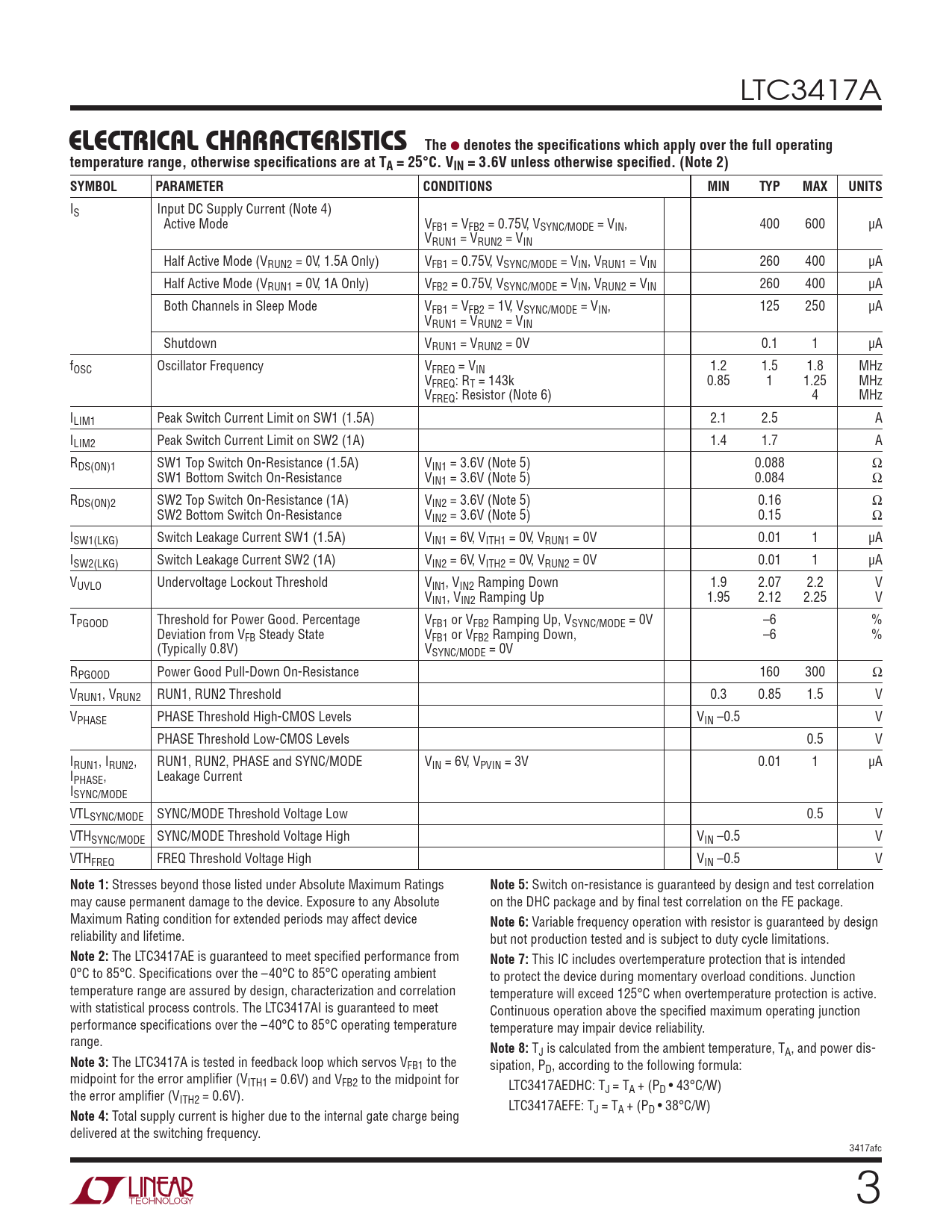 LTC3417A elecTrical characTerisTicsThe l denotes the specifications which apply over the full operatingtemperature range, otherwise specifications are at TA = 25°C. VIN = 3.6V unless otherwise specified. (Note 2) SYMBOLPARAMETERCONDITIONSMINTYPMAXUNITS IS Input DC Supply Current (Note 4) Active Mode VFB1 = VFB2 = 0.75V, VSYNC/MODE = VIN, 400 600 µA VRUN1 = VRUN2 = VIN Half Active Mode (VRUN2 = 0V, 1.5A Only) VFB1 = 0.75V, VSYNC/MODE = VIN, VRUN1 = VIN 260 400 µA Half Active Mode (VRUN1 = 0V, 1A Only) VFB2 = 0.75V, VSYNC/MODE = VIN, VRUN2 = VIN 260 400 µA Both Channels in Sleep Mode VFB1 = VFB2 = 1V, VSYNC/MODE = VIN, 125 250 µA VRUN1 = VRUN2 = VIN Shutdown VRUN1 = VRUN2 = 0V 0.1 1 µA fOSC Oscillator Frequency VFREQ = VIN 1.2 1.5 1.8 MHz VFREQ: RT = 143k 0.85 1 1.25 MHz VFREQ: Resistor (Note 6) 4 MHz ILIM1 Peak Switch Current Limit on SW1 (1.5A) 2.1 2.5 A ILIM2 Peak Switch Current Limit on SW2 (1A) 1.4 1.7 A RDS(ON)1 SW1 Top Switch On-Resistance (1.5A) VIN1 = 3.6V (Note 5) 0.088 Ω SW1 Bottom Switch On-Resistance VIN1 = 3.6V (Note 5) 0.084 Ω RDS(ON)2 SW2 Top Switch On-Resistance (1A) VIN2 = 3.6V (Note 5) 0.16 Ω SW2 Bottom Switch On-Resistance VIN2 = 3.6V (Note 5) 0.15 Ω ISW1(LKG) Switch Leakage Current SW1 (1.5A) VIN1 = 6V, VITH1 = 0V, VRUN1 = 0V 0.01 1 µA ISW2(LKG) Switch Leakage Current SW2 (1A) VIN2 = 6V, VITH2 = 0V, VRUN2 = 0V 0.01 1 µA VUVLO Undervoltage Lockout Threshold VIN1, VIN2 Ramping Down 1.9 2.07 2.2 V VIN1, VIN2 Ramping Up 1.95 2.12 2.25 V TPGOOD Threshold for Power Good. Percentage VFB1 or VFB2 Ramping Up, VSYNC/MODE = 0V –6 % Deviation from VFB Steady State VFB1 or VFB2 Ramping Down, –6 % (Typically 0.8V) VSYNC/MODE = 0V RPGOOD Power Good Pull-Down On-Resistance 160 300 Ω VRUN1, VRUN2 RUN1, RUN2 Threshold 0.3 0.85 1.5 V VPHASE PHASE Threshold High-CMOS Levels VIN –0.5 V PHASE Threshold Low-CMOS Levels 0.5 V IRUN1, IRUN2, RUN1, RUN2, PHASE and SYNC/MODE VIN = 6V, VPVIN = 3V 0.01 1 µA IPHASE, Leakage Current ISYNC/MODE VTLSYNC/MODE SYNC/MODE Threshold Voltage Low 0.5 V VTHSYNC/MODE SYNC/MODE Threshold Voltage High VIN –0.5 V VTHFREQ FREQ Threshold Voltage High VIN –0.5 V Note 1: Stresses beyond those listed under Absolute Maximum Ratings Note 5: Switch on-resistance is guaranteed by design and test correlation may cause permanent damage to the device. Exposure to any Absolute on the DHC package and by final test correlation on the FE package. Maximum Rating condition for extended periods may affect device Note 6: Variable frequency operation with resistor is guaranteed by design reliability and lifetime. but not production tested and is subject to duty cycle limitations. Note 2: The LTC3417AE is guaranteed to meet specified performance from Note 7: This IC includes overtemperature protection that is intended 0°C to 85°C. Specifications over the –40°C to 85°C operating ambient to protect the device during momentary overload conditions. Junction temperature range are assured by design, characterization and correlation temperature will exceed 125°C when overtemperature protection is active. with statistical process controls. The LTC3417AI is guaranteed to meet Continuous operation above the specified maximum operating junction performance specifications over the –40°C to 85°C operating temperature temperature may impair device reliability. range. Note 8: TJ is calculated from the ambient temperature, TA, and power dis- Note 3: The LTC3417A is tested in feedback loop which servos VFB1 to the sipation, PD, according to the following formula: midpoint for the error amplifier (VITH1 = 0.6V) and VFB2 to the midpoint for LTC3417AEDHC: T the error amplifier (V J = TA + (PD • 43°C/W) ITH2 = 0.6V). LTC3417AEFE: T Note 4: Total supply current is higher due to the internal gate charge being J = TA + (PD • 38°C/W) delivered at the switching frequency. 3417afc 3 Document Outline Features Description Applications Typical Application Absolute Maximum Ratings Pin Configuration Electrical Characteristics Typical Performance Characteristics Pin Functions Functional Diagram Operation Applications Information Package Description Revision History Related Parts