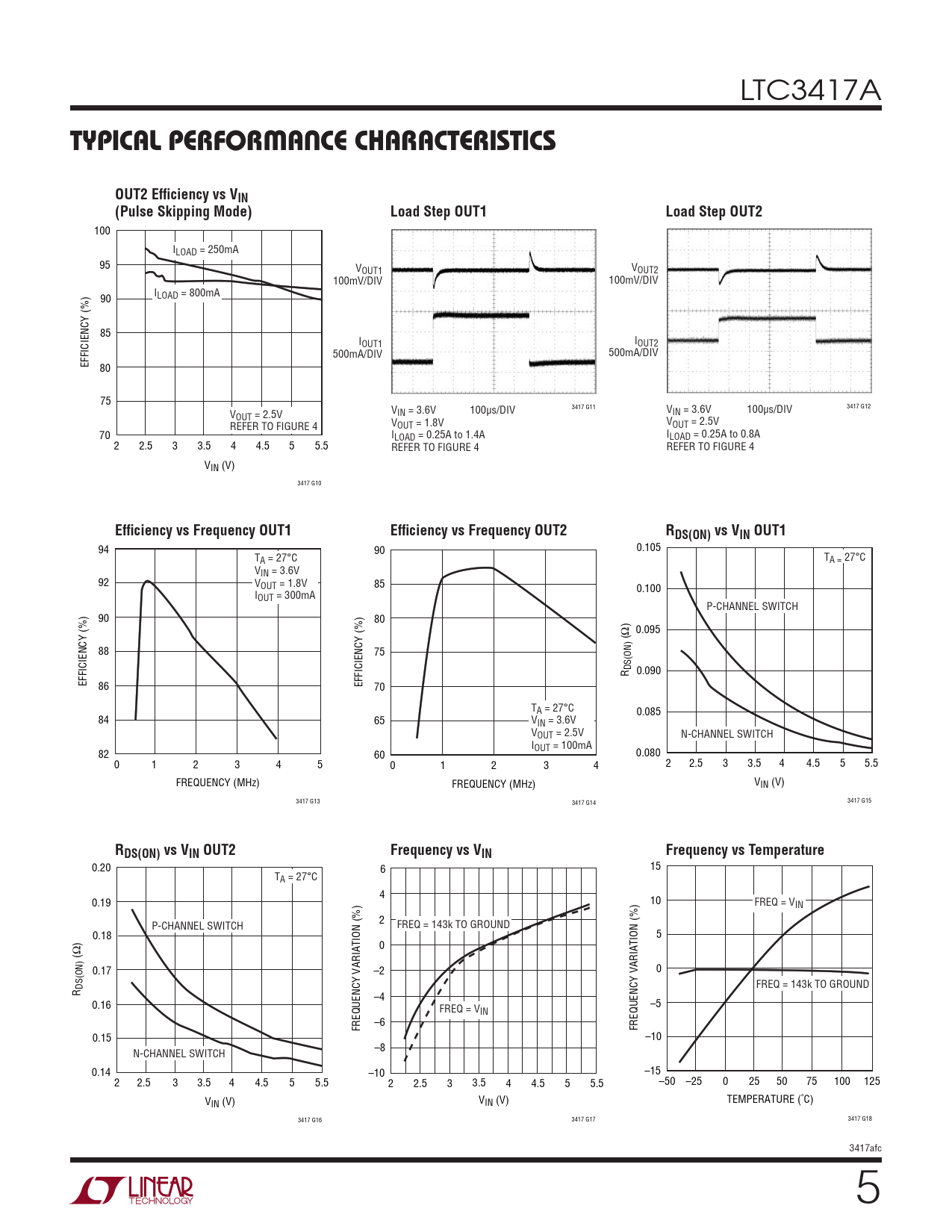 100 ILOAD = 250mA 95 VOUT1 VOUT2 100mV/DIV 100mV/DIV 90 ILOAD = 800mA 85 IOUT1 IOUT2 500mA/DIV 500mA/DIV EFFICIENCY (%) 80 75 3417 G11 3417 G12 V V 100µs/DIV V 100µs/DIV OUT = 2.5V IN = 3.6V IN = 3.6V REFER TO FIGURE 4 VOUT = 1.8V VOUT = 2.5V 70 ILOAD = 0.25A to 1.4A ILOAD = 0.25A to 0.8A 2 2.5 3 3.5 4 4.5 5 5.5 REFER TO FIGURE 4 REFER TO FIGURE 4 VIN (V) 3417 G10