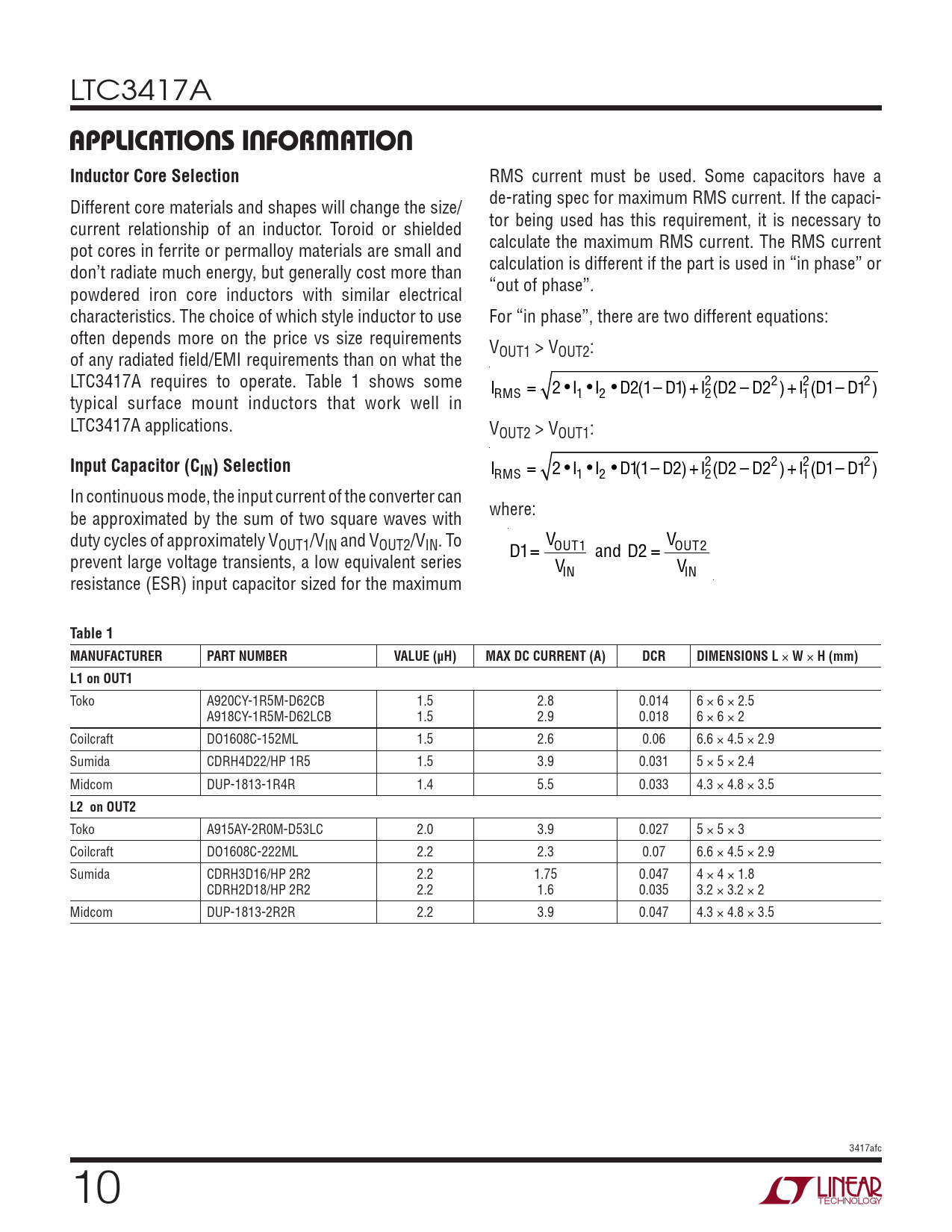 LTC3417A applicaTions inForMaTionInductor Core Selection RMS current must be used. Some capacitors have a Different core materials and shapes will change the size/ de-rating spec for maximum RMS current. If the capaci- current relationship of an inductor. Toroid or shielded tor being used has this requirement, it is necessary to pot cores in ferrite or permalloy materials are small and calculate the maximum RMS current. The RMS current don’t radiate much energy, but generally cost more than calculation is different if the part is used in “in phase” or powdered iron core inductors with similar electrical “out of phase”. characteristics. The choice of which style inductor to use For “in phase”, there are two different equations: often depends more on the price vs size requirements V of any radiated field/EMI requirements than on what the OUT1 > VOUT2: LTC3417A requires to operate. Table 1 shows some 2(D2 – D22)+I2(D1– D12) typical surface mount inductors that work well in IRMS = 2 •I1 •I2 • D2(1– D1)+I2 1 LTC3417A applications. VOUT2 > VOUT1: Input Capacitor (CIN) Selection 2 2 IRMS = 2 • I1 • I2 • D1(1– D2)+I2(D2 – D22)+I1(D1– D12) In continuous mode, the input current of the converter can be approximated by the sum of two square waves with where: duty cycles of approximately VOUT1/VIN and VOUT2/VIN. To VOUT1 VOUT2 prevent large voltage transients, a low equivalent series D1= and D2 = VIN VIN resistance (ESR) input capacitor sized for the maximum Table 1 MANUFACTURERPART NUMBERVALUE (µH)MAX DC CURRENT (A)DCRDIMENSIONS L × W × H (mm)L1 on OUT1 Toko A920CY-1R5M-D62CB 1.5 2.8 0.014 6 × 6 × 2.5 A918CY-1R5M-D62LCB 1.5 2.9 0.018 6 × 6 × 2 Coilcraft DO1608C-152ML 1.5 2.6 0.06 6.6 × 4.5 × 2.9 Sumida CDRH4D22/HP 1R5 1.5 3.9 0.031 5 × 5 × 2.4 Midcom DUP-1813-1R4R 1.4 5.5 0.033 4.3 × 4.8 × 3.5 L2 on OUT2 Toko A915AY-2R0M-D53LC 2.0 3.9 0.027 5 × 5 × 3 Coilcraft DO1608C-222ML 2.2 2.3 0.07 6.6 × 4.5 × 2.9 Sumida CDRH3D16/HP 2R2 2.2 1.75 0.047 4 × 4 × 1.8 CDRH2D18/HP 2R2 2.2 1.6 0.035 3.2 × 3.2 × 2 Midcom DUP-1813-2R2R 2.2 3.9 0.047 4.3 × 4.8 × 3.5 3417afc 10 Document Outline Features Description Applications Typical Application Absolute Maximum Ratings Pin Configuration Electrical Characteristics Typical Performance Characteristics Pin Functions Functional Diagram Operation Applications Information Package Description Revision History Related Parts