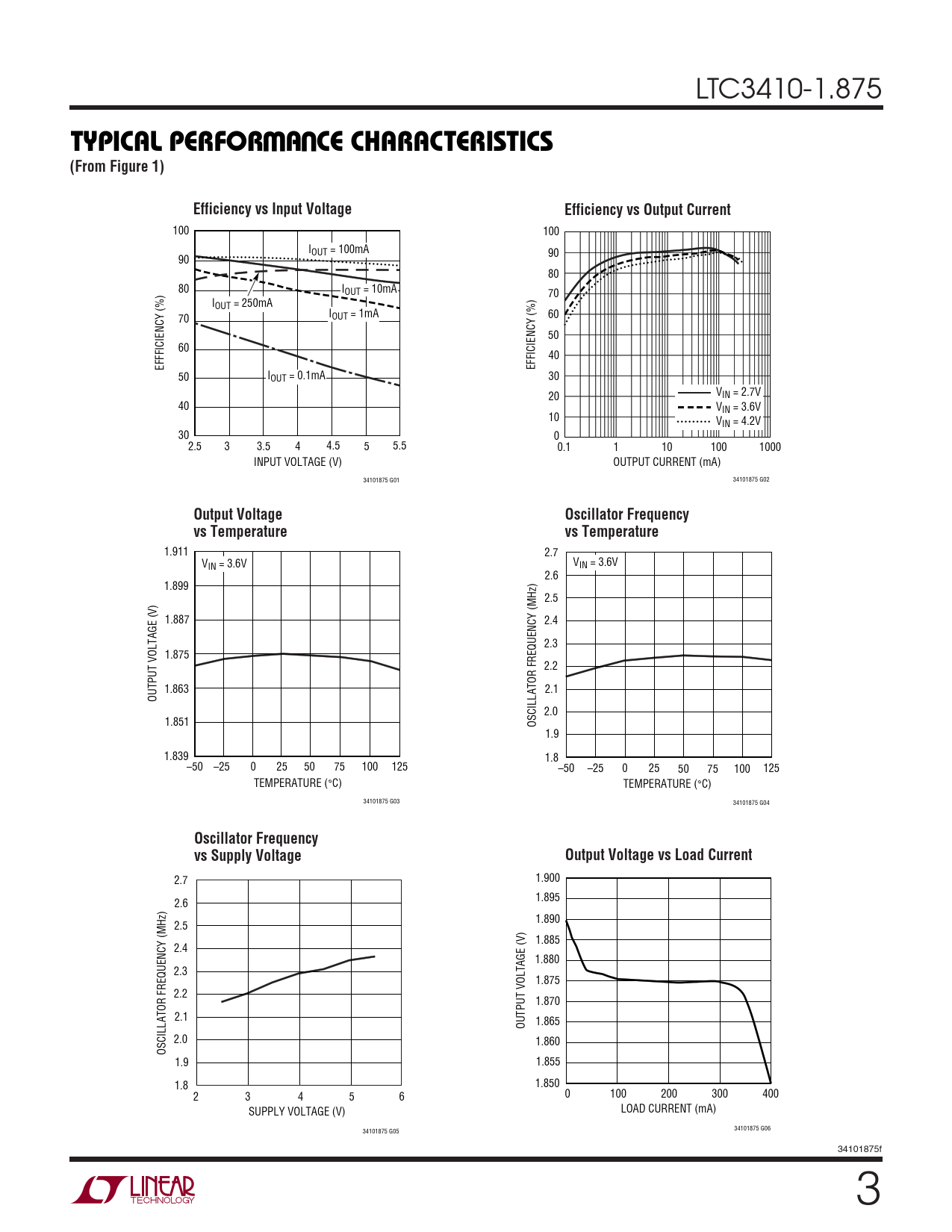 2.7 1.900 1.895 2.6 1.890 2.5 1.885 2.4 1.880 2.3 1.875 2.2 1.870 2.1 OUTPUT VOLTAGE (V) 1.865 2.0 1.860 OSCILLATOR FREQUENCY (MHz) 1.9 1.855 1.8 1.850 2 3 4 5 6 0 100 200 300 400 SUPPLY VOLTAGE (V) LOAD CURRENT (mA) 34101875 G05 34101875 G06 34101875f 3