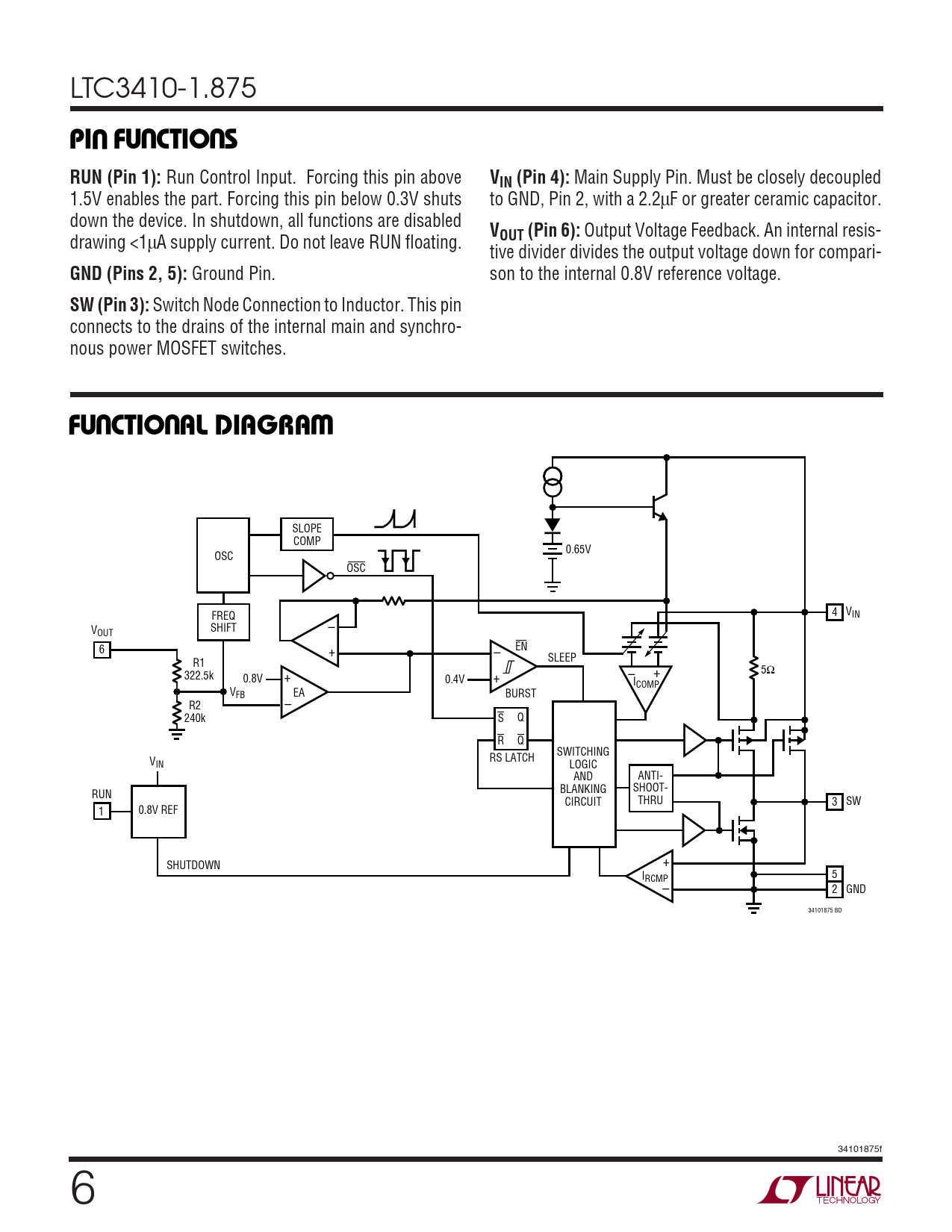 LTC3410-1.875 UUUPI FU CTIO SRUN (Pin 1): Run Control Input. Forcing this pin above VIN (Pin 4): Main Supply Pin. Must be closely decoupled 1.5V enables the part. Forcing this pin below 0.3V shuts to GND, Pin 2, with a 2.2µF or greater ceramic capacitor. down the device. In shutdown, all functions are disabled V drawing <1µA supply current. Do not leave RUN floating. OUT (Pin 6): Output Voltage Feedback. An internal resis- tive divider divides the output voltage down for compari- GND (Pins 2, 5): Ground Pin. son to the internal 0.8V reference voltage. SW (Pin 3): Switch Node Connection to Inductor. This pin connects to the drains of the internal main and synchro- nous power MOSFET switches. UUWFU CTIO AL DIAGRA SLOPE COMP 0.65V OSC OSC FREQ 4 VIN SHIFT – VOUT 6 + – EN SLEEP R1 + 5Ω 322.5k 0.8V 0.4V + – + ICOMP VFB – EA BURST R2 240k S Q R Q SWITCHING V RS LATCH IN LOGIC AND ANTI- SHOOT- RUN BLANKING CIRCUIT THRU 3 SW 1 0.8V REF + SHUTDOWN I 5 RCMP – 2 GND 34101875 BD 34101875f 6