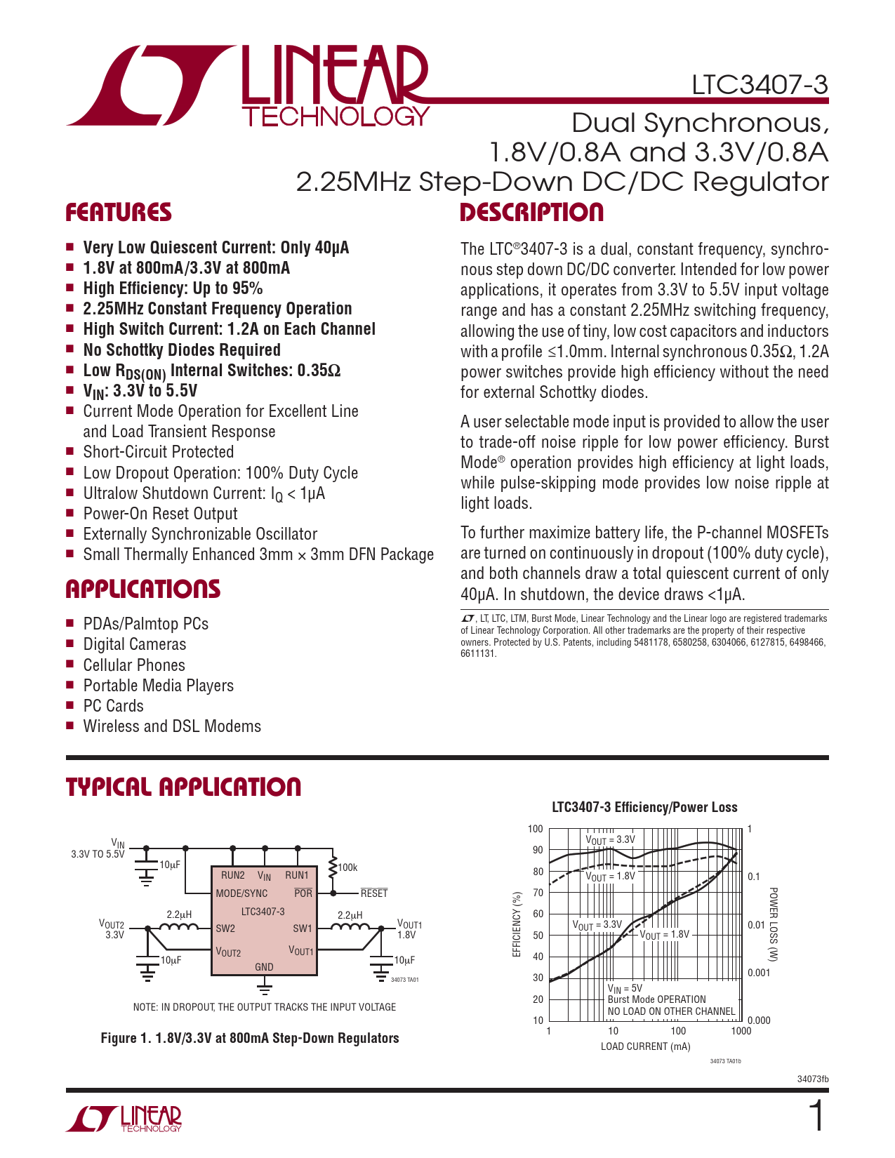 LTC3407-3 Dual Synchronous, 1.8V/0.8A and 3.3V/0.8A 2.25MHz Step-Down DC/DC Regulator FEATURESDESCRIPTION n Very Low Quiescent Current: Only 40μA The LTC®3407-3 is a dual, constant frequency, synchro- n 1.8V at 800mA/3.3V at 800mA nous step down DC/DC converter. Intended for low power n High Effi ciency: Up to 95% applications, it operates from 3.3V to 5.5V input voltage n 2.25MHz Constant Frequency Operation range and has a constant 2.25MHz switching frequency, n High Switch Current: 1.2A on Each Channel allowing the use of tiny, low cost capacitors and inductors n No Schottky Diodes Required with a profi le ≤1.0mm. Internal synchronous 0.35Ω, 1.2A n Low RDS(ON) Internal Switches: 0.35Ω power switches provide high effi ciency without the need n VIN: 3.3V to 5.5V for external Schottky diodes. n Current Mode Operation for Excellent Line A user selectable mode input is provided to allow the user and Load Transient Response to trade-off noise ripple for low power effi ciency. Burst n Short-Circuit Protected Mode® operation provides high effi ciency at light loads, n Low Dropout Operation: 100% Duty Cycle while pulse-skipping mode provides low noise ripple at n Ultralow Shutdown Current: IQ < 1μA light loads. n Power-On Reset Output n Externally Synchronizable Oscillator To further maximize battery life, the P-channel MOSFETs n Small Thermally Enhanced 3mm × 3mm DFN Package are turned on continuously in dropout (100% duty cycle), and both channels draw a total quiescent current of only APPLICATIONS 40μA. In shutdown, the device draws <1μA. n PDAs/Palmtop PCs L, LT, LTC, LTM, Burst Mode, Linear Technology and the Linear logo are registered trademarks of Linear Technology Corporation. All other trademarks are the property of their respective n Digital Cameras owners. Protected by U.S. Patents, including 5481178, 6580258, 6304066, 6127815, 6498466, 6611131. n Cellular Phones n Portable Media Players n PC Cards n Wireless and DSL Modems TYPICAL APPLICATIONLTC3407-3 Effi ciency/Power Loss 100 1 V V IN OUT = 3.3V 3.3V TO 5.5V 90 10μF 100k RUN2 V 80 IN RUN1 VOUT = 1.8V 0.1 POWER LOSS (W) MODE/SYNC POR RESET 70 LTC3407-3 2.2μH 2.2μH 60 VOUT2 VOUT1 SW2 SW1 V 0.01 OUT = 3.3V 3.3V 1.8V 50 VOUT = 1.8V V V OUT2 OUT1 EFFICIENCY (%) 10μF 10μF 40 GND 0.001 34073 TA01 30 VIN = 5V 20 Burst Mode OPERATION NOTE: IN DROPOUT, THE OUTPUT TRACKS THE INPUT VOLTAGE NO LOAD ON OTHER CHANNEL 10 0.000 1 10 100 1000 Figure 1. 1.8V/3.3V at 800mA Step-Down Regulators LOAD CURRENT (mA) 34073 TA01b 34073fb 1