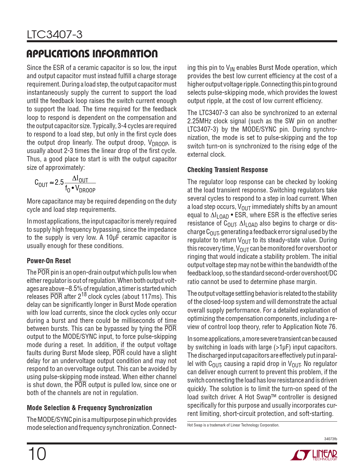 specifi cally for this purpose and usually incorporates cur- rent limiting, short-circuit protection, and soft-starting. The MODE/SYNC pin is a multipurpose pin which provides mode selection and frequency synchronization. Connect- Hot Swap is a trademark of Linear Technology Corporation. 34073fb 10