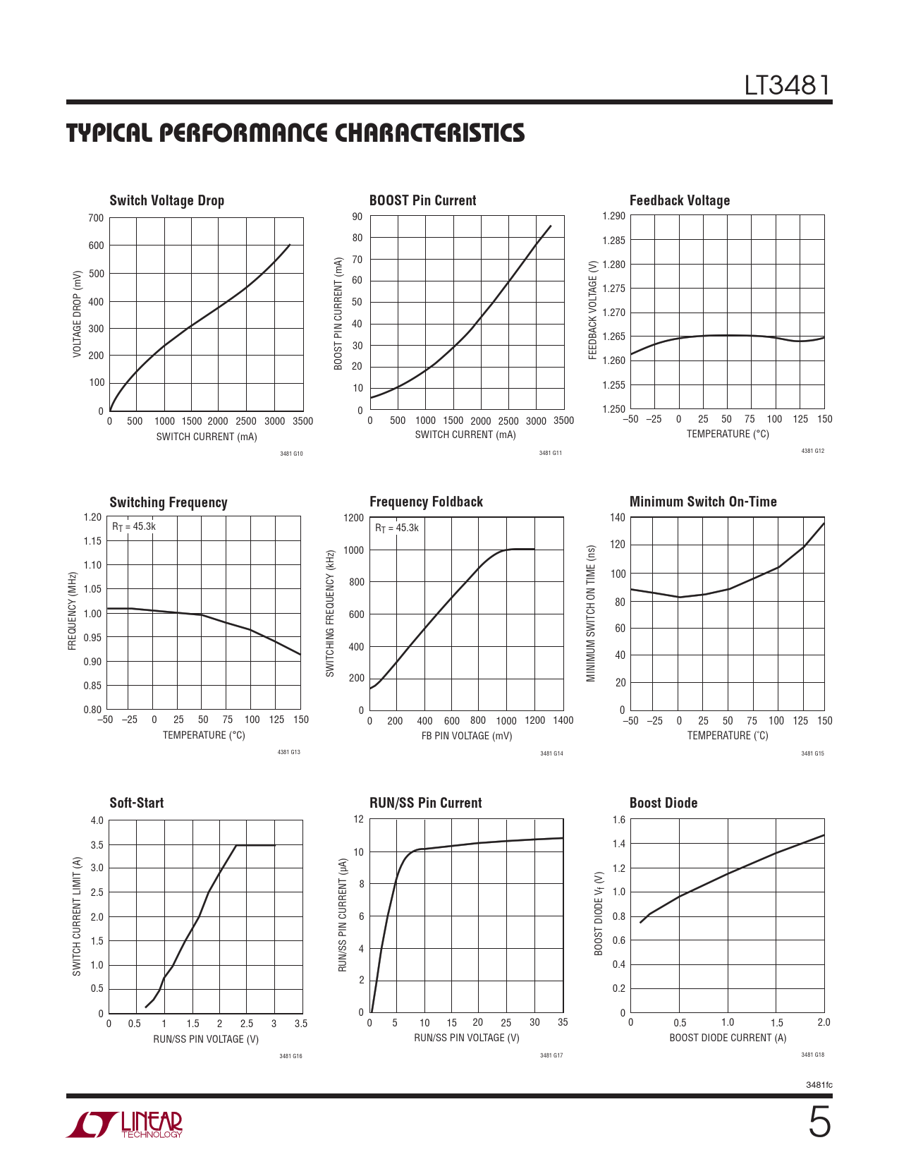 1.20 1200 140 RT = 45.3k RT = 45.3k 1.15 120 1000 1.10 100 800 1.05 80 1.00 600 60 0.95 FREQUENCY (MHz) 400 40 0.90 SWITCHING FREQUENCY (kHz) 200 MINIMUM SWITCH ON TIME (ns) 0.85 20 0.80 0 0 –50 –25 0 25 50 75 100 125 150 0 200 400 600 800 1000 1200 1400 –50 –25 0 25 50 75 100 125 150 TEMPERATURE (°C) FB PIN VOLTAGE (mV) TEMPERATURE (˚C) 4381 G13 3481 G14 3481 G15