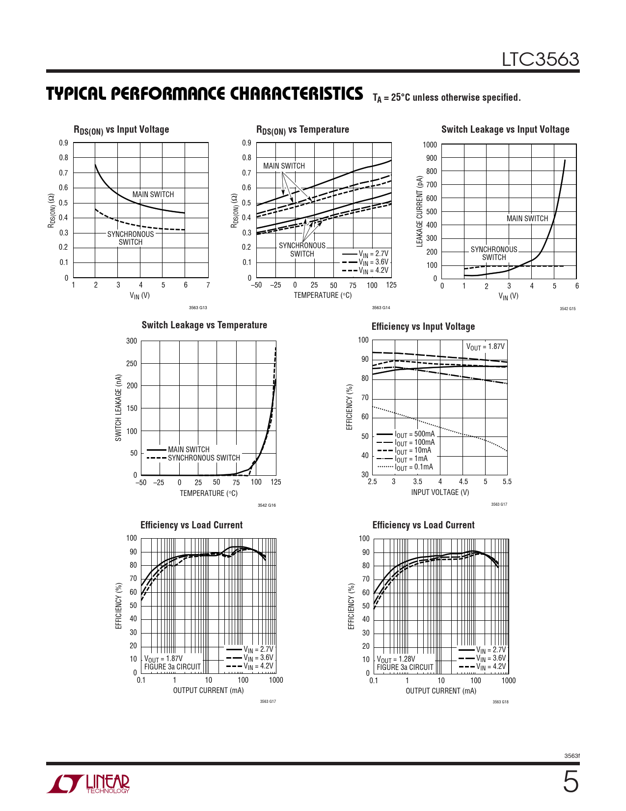 0.9 0.9 1000 0.8 0.8 900 MAIN SWITCH 0.7 0.7 800 0.6 0.6 700 ) Ω MAIN SWITCH Ω 600 ( 0.5 ( 0.5 500 0.4 0.4 MAIN SWITCH DS(ON) DS(ON) R R 400 0.3 SYNCHRONOUS 0.3 300 SWITCH 0.2 0.2 SYNCHRONOUS LEAKAGE CURRENT (pA) SYNCHRONOUS SWITCH V 200 IN = 2.7V SWITCH 0.1 0.1 VIN = 3.6V 100 VIN = 4.2V 0 0 0 1 2 3 4 5 6 7 –50 –25 0 25 50 75 100 125 0 1 2 3 4 5 6 VIN (V) TEMPERATURE (°C) VIN (V) 3563 G13 3563 G14 3542 G15
