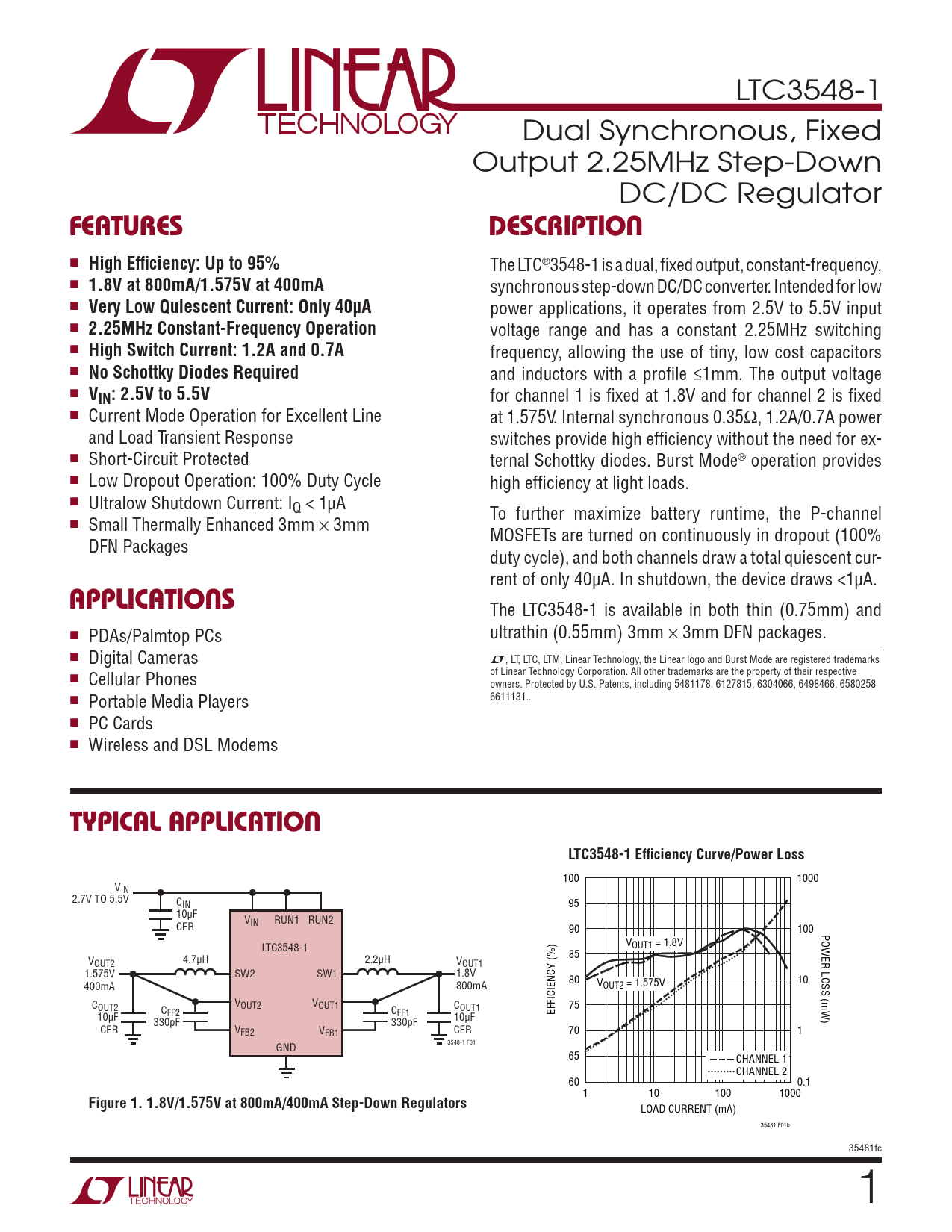 LTC3548-1 Dual Synchronous, Fixed Output 2.25MHz Step-Down DC/DC Regulator FEATURESDESCRIPTION n High Effi ciency: Up to 95% The LTC®3548-1 is a dual, fi xed output, constant-frequency, n 1.8V at 800mA/1.575V at 400mA synchronous step-down DC/DC converter. Intended for low n Very Low Quiescent Current: Only 40μA power applications, it operates from 2.5V to 5.5V input n 2.25MHz Constant-Frequency Operation voltage range and has a constant 2.25MHz switching n High Switch Current: 1.2A and 0.7A frequency, allowing the use of tiny, low cost capacitors n No Schottky Diodes Required and inductors with a profi le ≤1mm. The output voltage n VIN: 2.5V to 5.5V for channel 1 is fi xed at 1.8V and for channel 2 is fi xed n Current Mode Operation for Excellent Line at 1.575V. Internal synchronous 0.35Ω, 1.2A/0.7A power and Load Transient Response switches provide high effi ciency without the need for ex- n Short-Circuit Protected ternal Schottky diodes. Burst Mode® operation provides n Low Dropout Operation: 100% Duty Cycle high effi ciency at light loads. n Ultralow Shutdown Current: IQ < 1μA To further maximize battery runtime, the P-channel n Small Thermally Enhanced 3mm × 3mm MOSFETs are turned on continuously in dropout (100% DFN Packages duty cycle), and both channels draw a total quiescent cur- rent of only 40μA. In shutdown, the device draws <1μA. APPLICATIONS The LTC3548-1 is available in both thin (0.75mm) and n ultrathin (0.55mm) 3mm PDAs/Palmtop PCs × 3mm DFN packages. n Digital Cameras L, LT, LTC, LTM, Linear Technology, the Linear logo and Burst Mode are registered trademarks n Cellular Phones of Linear Technology Corporation. All other trademarks are the property of their respective owners. Protected by U.S. Patents, including 5481178, 6127815, 6304066, 6498466, 6580258 n Portable Media Players 6611131.. n PC Cards n Wireless and DSL Modems TYPICAL APPLICATIONLTC3548-1 Effi ciency Curve/Power Loss 100 1000 VIN 2.7V TO 5.5V CIN 95 10μF V RUN1 RUN2 IN CER 90 100 POWER LOSS (mW) V LTC3548-1 OUT1 = 1.8V 85 V 4.7μH 2.2μH OUT2 VOUT1 1.575V SW2 SW1 1.8V 80 10 400mA 800mA VOUT2 = 1.575V V V C OUT2 OUT1 C OUT2 OUT1 C C 75 EFFICIENCY (%) 10μF FF2 FF1 10μF 330pF 330pF CER V V FB2 FB1 CER 70 1 GND 3548-1 F01 65 CHANNEL 1 CHANNEL 2 60 0.1 1 10 100 1000 Figure 1. 1.8V/1.575V at 800mA/400mA Step-Down Regulators LOAD CURRENT (mA) 35481 F01b 35481fc 1