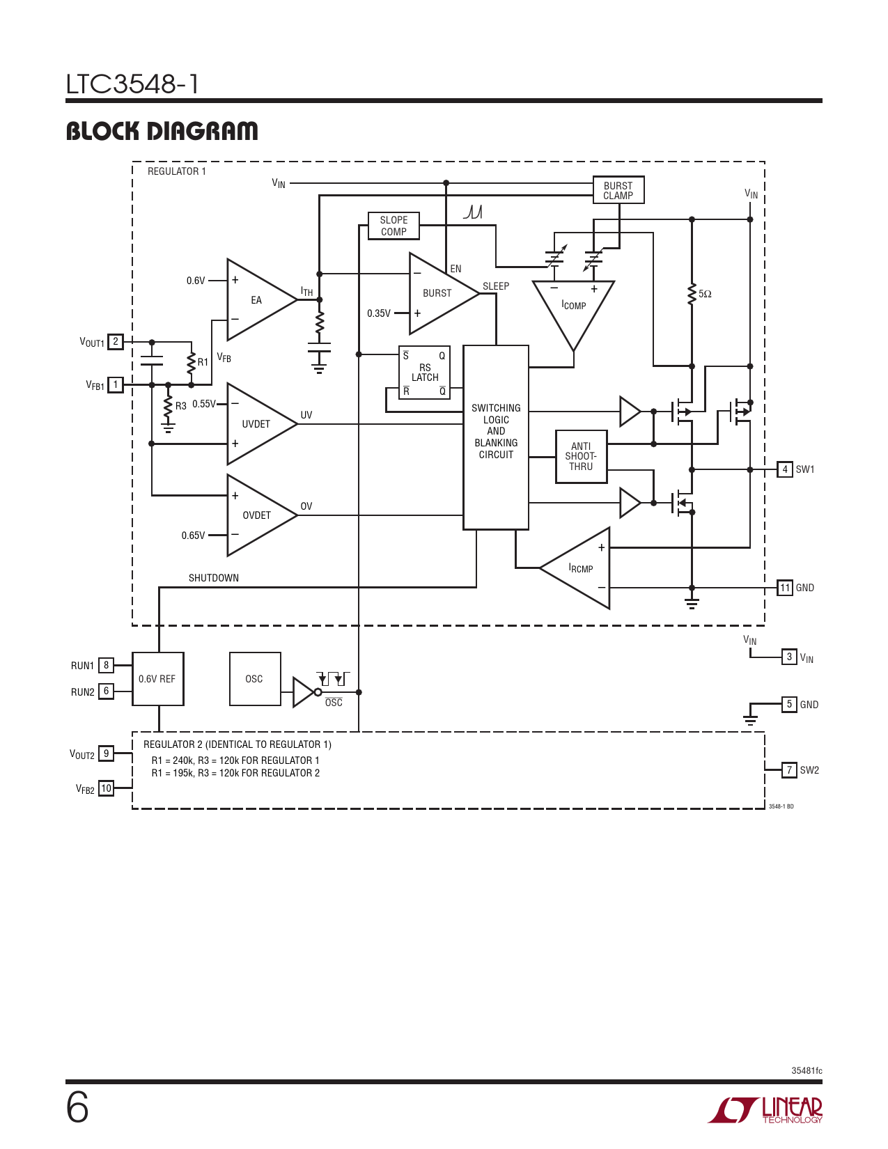 REGULATOR 1 VIN BURST CLAMP VIN SLOPE COMP – EN 0.6V + I SLEEP – + TH BURST 5Ω EA ICOMP – 0.35V + V 2 OUT1 V S Q R1 FB RS LATCH VFB1 1 R Q R3 0.55V – SWITCHING UV UVDET LOGIC AND + BLANKING ANTI CIRCUIT SHOOT- THRU 4 SW1 + OV OVDET 0.65V – + IRCMP SHUTDOWN – 11 GND VIN 3 VIN RUN1 8 0.6V REF OSC RUN2 6 OSC 5 GND REGULATOR 2 (IDENTICAL TO REGULATOR 1) V 9 OUT2 R1 = 240k, R3 = 120k FOR REGULATOR 1 7 R1 = 195k, R3 = 120k FOR REGULATOR 2 SW2 V 10 FB2 3548-1 BD 35481fc 6