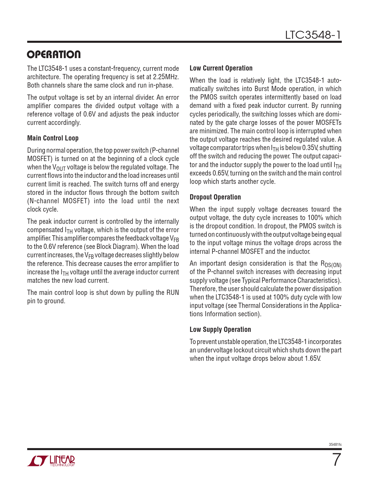 LTC3548-1 OPERATION The LTC3548-1 uses a constant-frequency, current mode Low Current Operation architecture. The operating frequency is set at 2.25MHz. When the load is relatively light, the LTC3548-1 auto- Both channels share the same clock and run in-phase. matically switches into Burst Mode operation, in which The output voltage is set by an internal divider. An error the PMOS switch operates intermittently based on load amplifi er compares the divided output voltage with a demand with a fi xed peak inductor current. By running reference voltage of 0.6V and adjusts the peak inductor cycles periodically, the switching losses which are domi- current accordingly. nated by the gate charge losses of the power MOSFETs are minimized. The main control loop is interrupted when Main Control Loop the output voltage reaches the desired regulated value. A During normal operation, the top power switch (P-channel voltage comparator trips when ITH is below 0.35V, shutting MOSFET) is turned on at the beginning of a clock cycle off the switch and reducing the power. The output capaci- when the V tor and the inductor supply the power to the load until I OUT voltage is below the regulated voltage. The TH current fl ows into the inductor and the load increases until exceeds 0.65V, turning on the switch and the main control current limit is reached. The switch turns off and energy loop which starts another cycle. stored in the inductor fl ows through the bottom switch Dropout Operation (N-channel MOSFET) into the load until the next clock cycle. When the input supply voltage decreases toward the output voltage, the duty cycle increases to 100% which The peak inductor current is controlled by the internally is the dropout condition. In dropout, the PMOS switch is compensated ITH voltage, which is the output of the error turned on continuously with the output voltage being equal amplifi er. This amplifi er compares the feedback voltage VFB to the input voltage minus the voltage drops across the to the 0.6V reference (see Block Diagram). When the load internal P-channel MOSFET and the inductor. current increases, the VFB voltage decreases slightly below the reference. This decrease causes the error amplifi er to An important design consideration is that the RDS(ON) increase the ITH voltage until the average inductor current of the P-channel switch increases with decreasing input matches the new load current. supply voltage (see Typical Performance Characteristics). Therefore, the user should calculate the power dissipation The main control loop is shut down by pulling the RUN when the LTC3548-1 is used at 100% duty cycle with low pin to ground. input voltage (see Thermal Considerations in the Applica- tions Information section). Low Supply Operation To prevent unstable operation, the LTC3548-1 incorporates an undervoltage lockout circuit which shuts down the part when the input voltage drops below about 1.65V. 35481fc 7