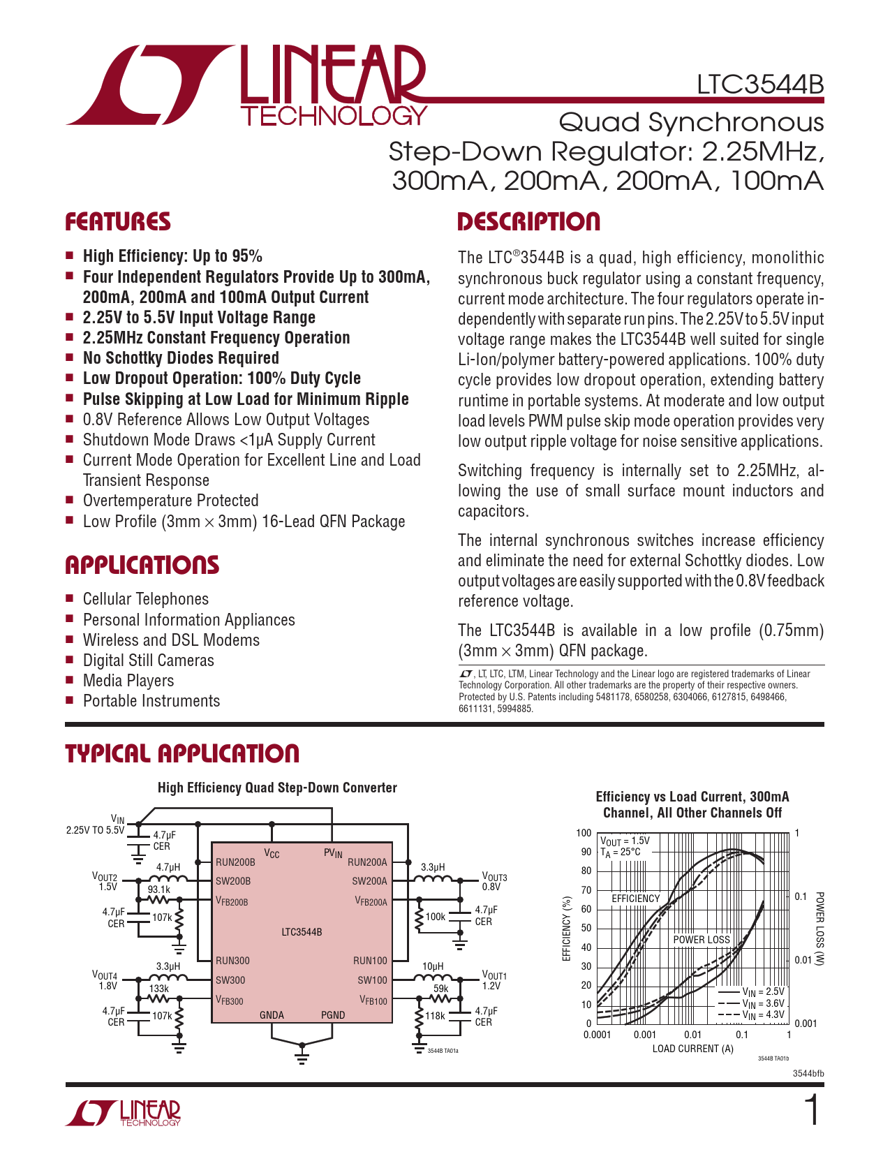 LTC3544B Quad Synchronous Step-Down Regulator: 2.25MHz, 300mA, 200mA, 200mA, 100mA FeaTures DescripTion ■ High Efficiency: Up to 95% The LTC®3544B is a quad, high efficiency, monolithic ■ Four Independent Regulators Provide Up to 300mA, synchronous buck regulator using a constant frequency, 200mA, 200mA and 100mA Output Current current mode architecture. The four regulators operate in- ■ 2.25V to 5.5V Input Voltage Range dependently with separate run pins. The 2.25V to 5.5V input ■ 2.25MHz Constant Frequency Operation voltage range makes the LTC3544B well suited for single ■ No Schottky Diodes Required Li-Ion/polymer battery-powered applications. 100% duty ■ Low Dropout Operation: 100% Duty Cycle cycle provides low dropout operation, extending battery ■ Pulse Skipping at Low Load for Minimum Ripple runtime in portable systems. At moderate and low output ■ 0.8V Reference Allows Low Output Voltages load levels PWM pulse skip mode operation provides very ■ Shutdown Mode Draws <1µA Supply Current low output ripple voltage for noise sensitive applications. ■ Current Mode Operation for Excellent Line and Load Switching frequency is internally set to 2.25MHz, al- Transient Response lowing the use of small surface mount inductors and ■ Overtemperature Protected capacitors. ■ Low Profile (3mm × 3mm) 16-Lead QFN Package The internal synchronous switches increase efficiency applicaTions and eliminate the need for external Schottky diodes. Low output voltages are easily supported with the 0.8V feedback ■ Cellular Telephones reference voltage. ■ Personal Information Appliances The LTC3544B is available in a low profile (0.75mm) ■ Wireless and DSL Modems (3mm × 3mm) QFN package. ■ Digital Still Cameras L, LT, LTC, LTM, Linear Technology and the Linear logo are registered trademarks of Linear ■ Media Players Technology Corporation. All other trademarks are the property of their respective owners. ■ Portable Instruments Protected by U.S. Patents including 5481178, 6580258, 6304066, 6127815, 6498466, 6611131, 5994885. Typical applicaTion High Efficiency Quad Step-Down ConverterEfficiency vs Load Current, 300mA V Channel, All Other Channels Off IN 2.25V TO 5.5V 4.7µF 100 1 CER VOUT = 1.5V VCC PVIN 90 TA = 25°C 4.7µH RUN200B RUN200A 3.3µH V 80 OUT2 VOUT3 1.5V SW200B SW200A 93.1k 0.8V 70 POWER LOSS (W) V EFFICIENCY 0.1 FB200B VFB200A 4.7µF 4.7µF 60 107k 100k CER CER LTC3544B 50 POWER LOSS 40 EFFICIENCY (%) 3.3µH RUN300 RUN100 10µH 0.01 30 VOUT4 VOUT1 1.8V SW300 SW100 133k 59k 1.2V 20 V V IN = 2.5V FB300 VFB100 V 4.7µF 10 IN = 3.6V 107k GNDA PGND 118k 4.7µF V CER CER 0 IN = 4.3V 0.001 0.0001 0.001 0.01 0.1 1 3544B TA01a LOAD CURRENT (A) 3544B TA01b 3544bfb Document Outline Features Applications Description Typical Application Absolute Maximum Ratings Pin Configuration Order Information Electrical Characteristics Typical Performance Characteristics Pin Functions Functional Diagrams Operation Applications Information Package Description Revision History Related Parts
