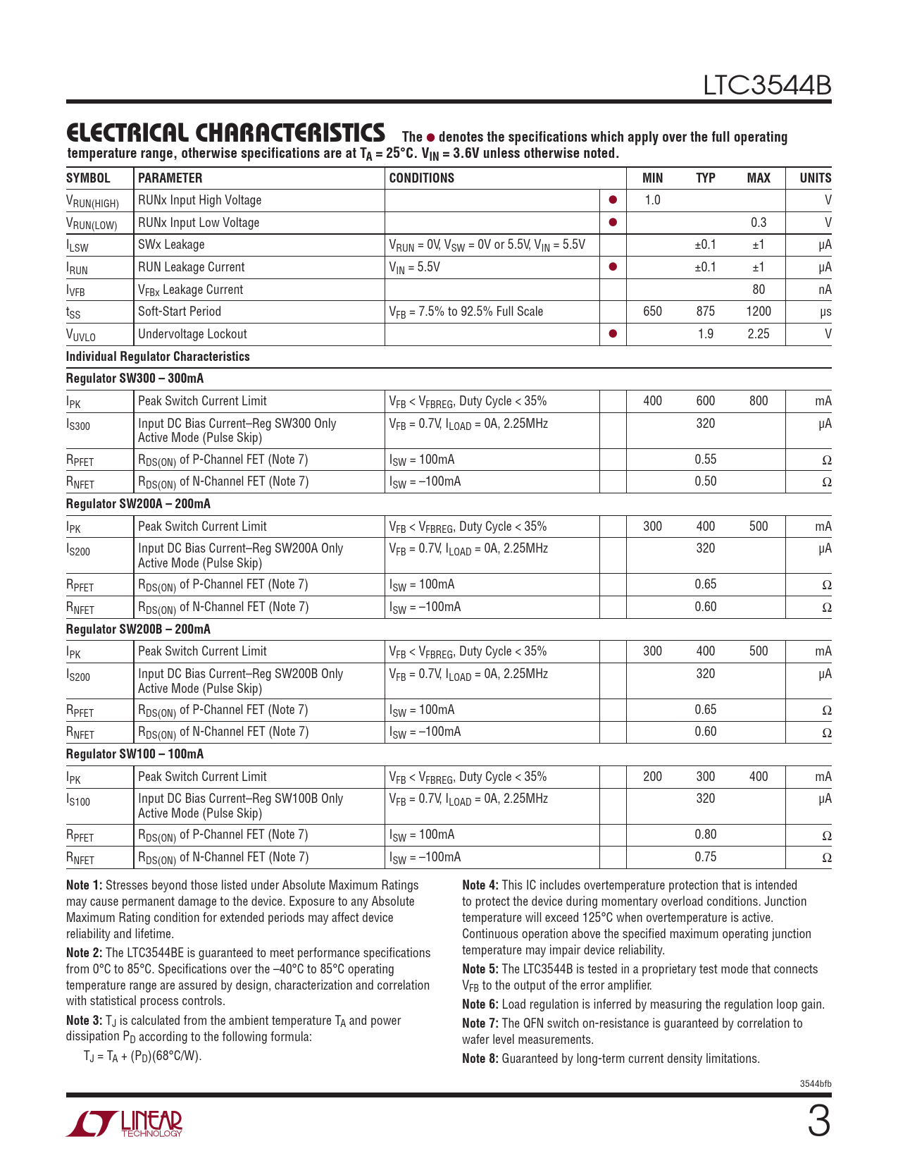 LTC3544B e lecTrical characTerisTics The l denotes the specifications which apply over the full operatingtemperature range, otherwise specifications are at TA = 25°C. VIN = 3.6V unless otherwise noted.SYMBOLPARAMETERCONDITIONSMINTYPMAXUNITS VRUN(HIGH) RUNx Input High Voltage l 1.0 V VRUN(LOW) RUNx Input Low Voltage l 0.3 V ILSW SWx Leakage VRUN = 0V, VSW = 0V or 5.5V, VIN = 5.5V ±0.1 ±1 µA IRUN RUN Leakage Current VIN = 5.5V l ±0.1 ±1 µA IVFB VFBx Leakage Current 80 nA tSS Soft-Start Period VFB = 7.5% to 92.5% Full Scale 650 875 1200 µs VUVLO Undervoltage Lockout l 1.9 2.25 V Individual Regulator Characteristics Regulator SW300 – 300mA IPK Peak Switch Current Limit VFB < VFBREG, Duty Cycle < 35% 400 600 800 mA IS300 Input DC Bias Current–Reg SW300 Only VFB = 0.7V, ILOAD = 0A, 2.25MHz 320 µA Active Mode (Pulse Skip) RPFET RDS(ON) of P-Channel FET (Note 7) ISW = 100mA 0.55 Ω RNFET RDS(ON) of N-Channel FET (Note 7) ISW = –100mA 0.50 Ω Regulator SW200A – 200mA IPK Peak Switch Current Limit VFB < VFBREG, Duty Cycle < 35% 300 400 500 mA IS200 Input DC Bias Current–Reg SW200A Only VFB = 0.7V, ILOAD = 0A, 2.25MHz 320 µA Active Mode (Pulse Skip) RPFET RDS(ON) of P-Channel FET (Note 7) ISW = 100mA 0.65 Ω RNFET RDS(ON) of N-Channel FET (Note 7) ISW = –100mA 0.60 Ω Regulator SW200B – 200mA IPK Peak Switch Current Limit VFB < VFBREG, Duty Cycle < 35% 300 400 500 mA IS200 Input DC Bias Current–Reg SW200B Only VFB = 0.7V, ILOAD = 0A, 2.25MHz 320 µA Active Mode (Pulse Skip) RPFET RDS(ON) of P-Channel FET (Note 7) ISW = 100mA 0.65 Ω RNFET RDS(ON) of N-Channel FET (Note 7) ISW = –100mA 0.60 Ω Regulator SW100 – 100mA IPK Peak Switch Current Limit VFB < VFBREG, Duty Cycle < 35% 200 300 400 mA IS100 Input DC Bias Current–Reg SW100B Only VFB = 0.7V, ILOAD = 0A, 2.25MHz 320 µA Active Mode (Pulse Skip) RPFET RDS(ON) of P-Channel FET (Note 7) ISW = 100mA 0.80 Ω RNFET RDS(ON) of N-Channel FET (Note 7) ISW = –100mA 0.75 Ω Note 1: Stresses beyond those listed under Absolute Maximum Ratings Note 4: This IC includes overtemperature protection that is intended may cause permanent damage to the device. Exposure to any Absolute to protect the device during momentary overload conditions. Junction Maximum Rating condition for extended periods may affect device temperature will exceed 125°C when overtemperature is active. reliability and lifetime. Continuous operation above the specified maximum operating junction Note 2: The LTC3544BE is guaranteed to meet performance specifications temperature may impair device reliability. from 0°C to 85°C. Specifications over the –40°C to 85°C operating Note 5: The LTC3544B is tested in a proprietary test mode that connects temperature range are assured by design, characterization and correlation VFB to the output of the error amplifier. with statistical process controls. Note 6: Load regulation is inferred by measuring the regulation loop gain. Note 3: TJ is calculated from the ambient temperature TA and power Note 7: The QFN switch on-resistance is guaranteed by correlation to dissipation PD according to the following formula: wafer level measurements. TJ = TA + (PD)(68°C/W). Note 8: Guaranteed by long-term current density limitations. 3544bfb Document Outline Features Applications Description Typical Application Absolute Maximum Ratings Pin Configuration Order Information Electrical Characteristics Typical Performance Characteristics Pin Functions Functional Diagrams Operation Applications Information Package Description Revision History Related Parts