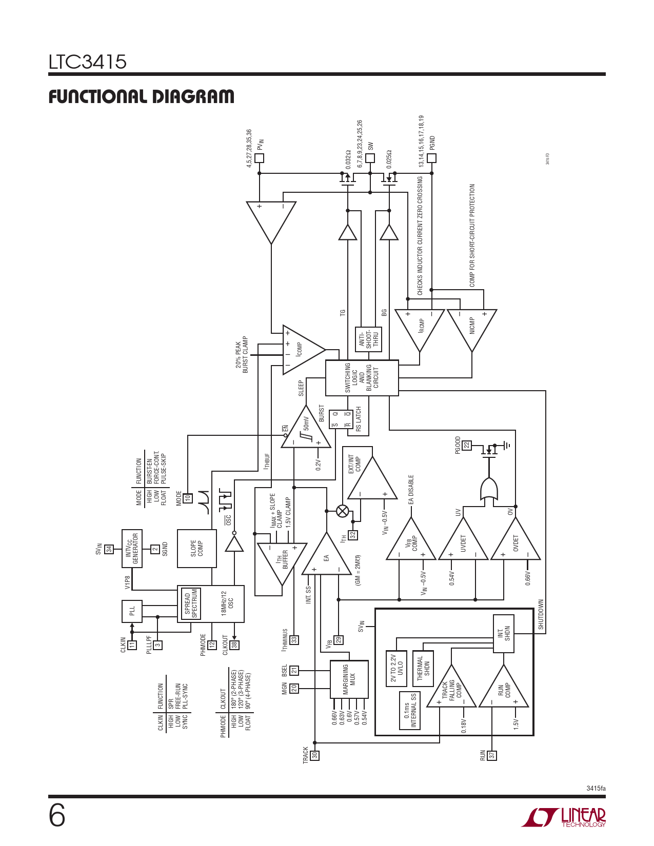 IN PV SW PGND 4,5,27,28,35,36 3415 FD 0.032Ω 6,7,8,9,23,24,25,26 0.025Ω 13,14,15,16,17,18,19 + – T-CIRCUIT PROTECTION COMP FOR SHOR CHECKS INDUCTOR CURRENT ZERO CROSSING + – – + TG BG + - I RCMP NICMP + ANTI- SHOOT THRU – I COMP – 20% PEAK BURST CLAMP LOGIC AND SWITCHING BLANKING CIRCUIT SLEEP Q TCH BURST S RQ EN 50mV RS LA – + 22 . PGOOD -EN I THBUF 0.2V EXT/INT COMP FUNCTION BURST FORCE-CONT PULSE-SKIP T – + 10 MODE HIGH LOW FLOA MODE EA DISABLE + SLOPE UV OV OSC –0.5V I MAX CLAMP 1.5V CLAMP INV 32 I TH CC TOR – + FB IN V V 34 2 COMP UVDET OVDET SV INT SGND SLOPE COMP Ω ) – + + – + – GENERA EA I TH BUFFER + – (GM = 2M 0.54V 0.66V V1P8 –0.5V IN . SS V INT OSC PLL SPREAD 18MHz/12 SPECTRUM IN . SHUTDOWN SV INT 33 29 SHDN 3 11 12 38 FB CLKIN I THMINUS V PLLLPF PHMODE CLKOUT 21 UVLO BSEL SHDN THERMAL 2V TO 2.2V MUX 20 MGN MARGINING LLING RUN ° (2-PHASE) ° (3-PHASE) TRACK COMP COMP ° (4-PHASE) + FA – – + FUNCTION SPR FREE-RUN PLL-SYNC CLKOUT 180 120 90 T 0.1ms 0.6V 0.66V 0.63V 0.57V 0.54V CLKIN HIGH LOW SYNC HIGH LOW INTERNAL SS FLOA 1.5V 0.18V PHMODE 30 37 TRACK RUN 3415fa 6