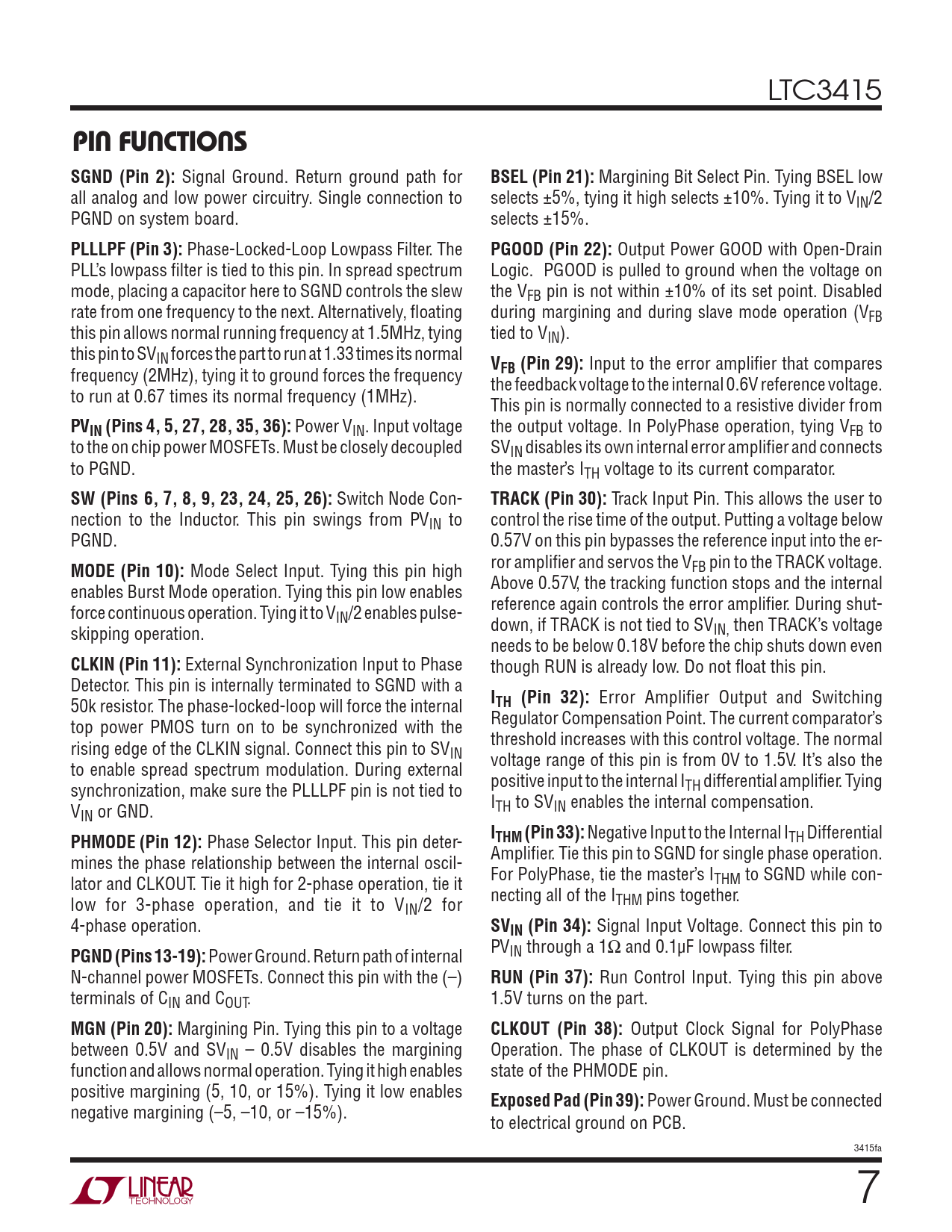 Power Ground. Must be connected negative margining (–5, –10, or –15%). to electrical ground on PCB. 3415fa 7