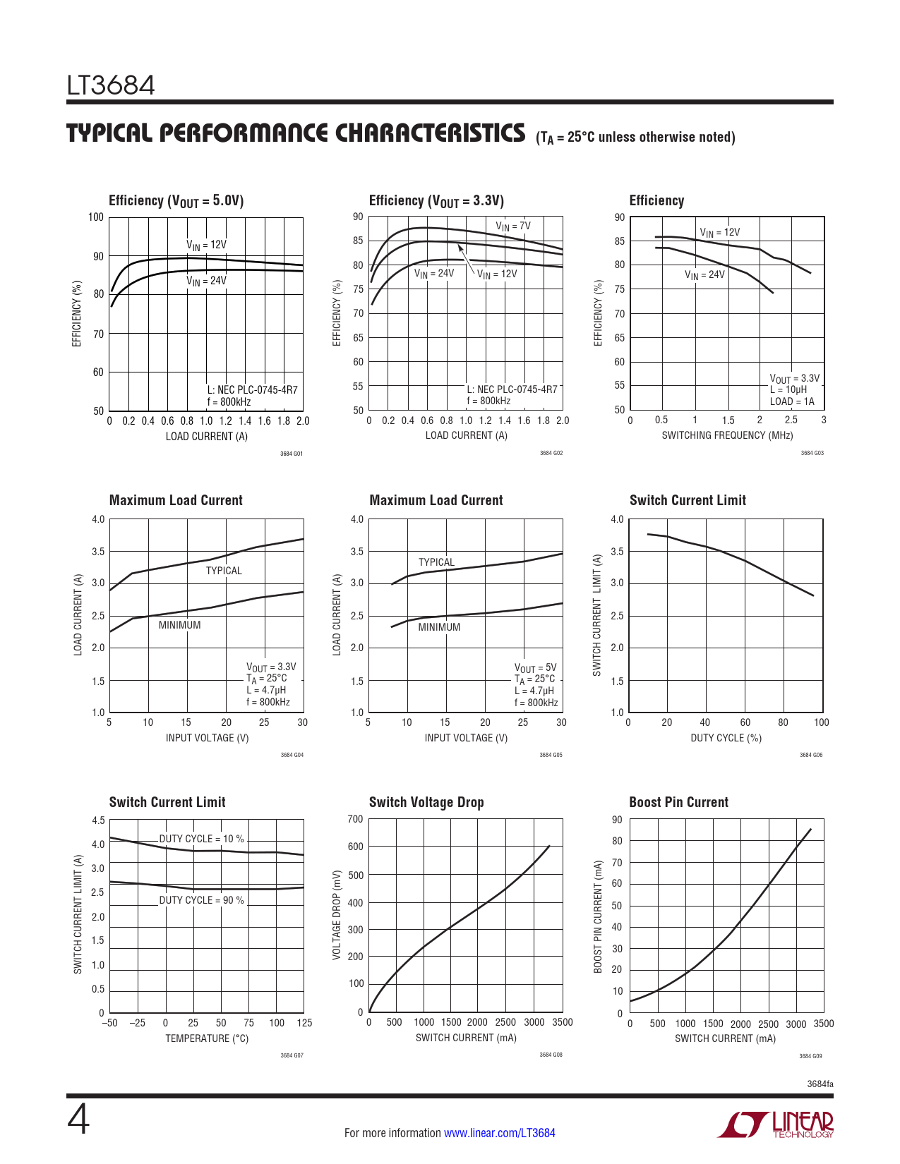 100 90 90 VIN = 7V VIN = 12V V 85 85 IN = 12V 90 80 80 VIN = 24V V V IN = 12V VIN = 24V IN = 24V 80 75 75 70 70 70 EFFICIENCY (%) EFFICIENCY (%) 65 EFFICIENCY (%) 65 60 60 60 VOUT = 3.3V L: NEC PLC-0745-4R7 55 L: NEC PLC-0745-4R7 55 L = 10µH f = 800kHz f = 800kHz LOAD = 1A 50 50 50 0 0.2 0.4 0.6 0.8 1.0 1.2 1.4 1.6 1.8 2.0 0 0.2 0.4 0.6 0.8 1.0 1.2 1.4 1.6 1.8 2.0 0 0.5 1 1.5 2 2.5 3 LOAD CURRENT (A) LOAD CURRENT (A) SWITCHING FREQUENCY (MHz) 3684 G01 3684 G02 3684 G03
