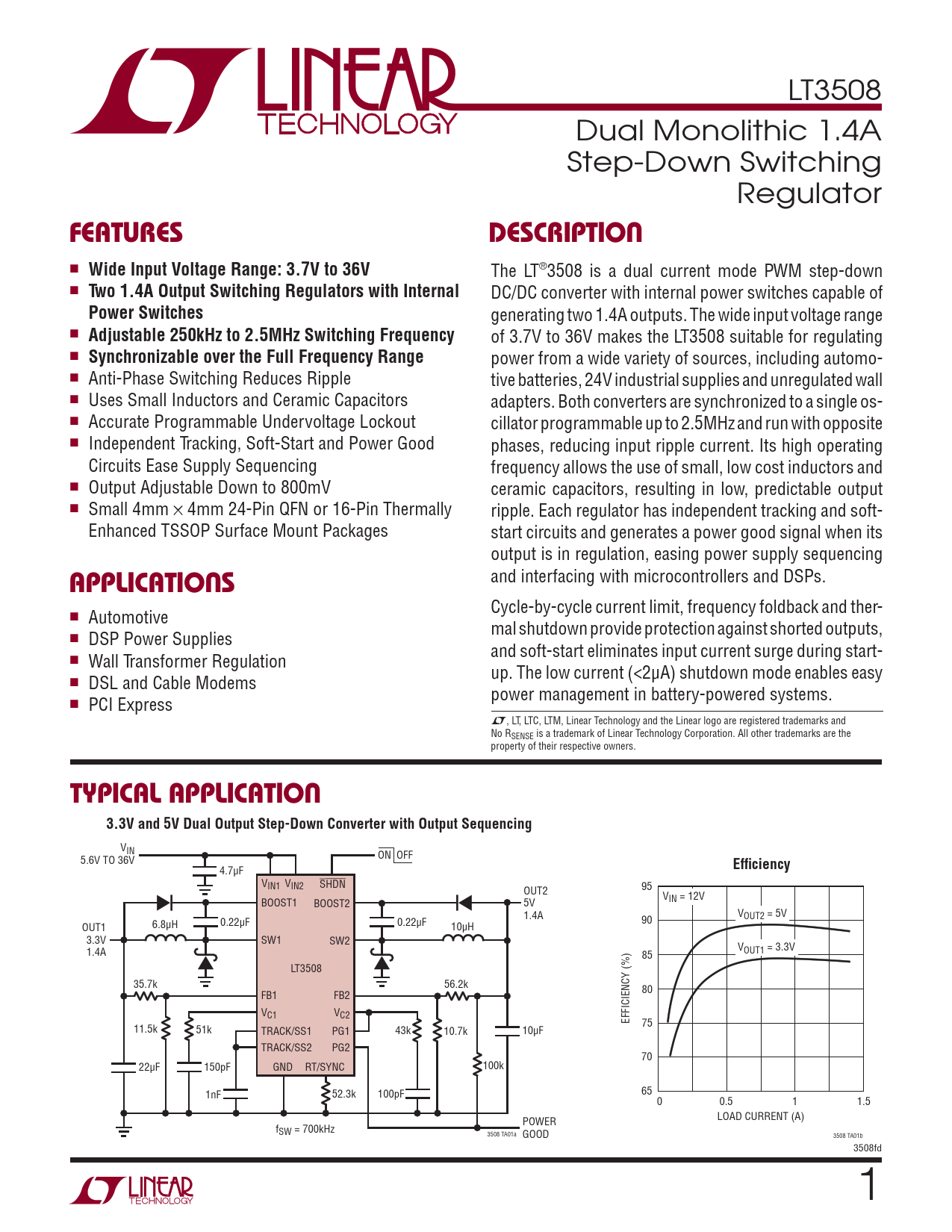 LT3508 Dual Monolithic 1.4A Step-Down Switching Regulator FEATURESDESCRIPTION n Wide Input Voltage Range: 3.7V to 36V The LT®3508 is a dual current mode PWM step-down n Two 1.4A Output Switching Regulators with Internal DC/DC converter with internal power switches capable of Power Switches generating two 1.4A outputs. The wide input voltage range n Adjustable 250kHz to 2.5MHz Switching Frequency of 3.7V to 36V makes the LT3508 suitable for regulating n Synchronizable over the Full Frequency Range power from a wide variety of sources, including automo- n Anti-Phase Switching Reduces Ripple tive batteries, 24V industrial supplies and unregulated wall n Uses Small Inductors and Ceramic Capacitors adapters. Both converters are synchronized to a single os- n Accurate Programmable Undervoltage Lockout cillator programmable up to 2.5MHz and run with opposite n Independent Tracking, Soft-Start and Power Good phases, reducing input ripple current. Its high operating Circuits Ease Supply Sequencing frequency allows the use of small, low cost inductors and n Output Adjustable Down to 800mV ceramic capacitors, resulting in low, predictable output n Small 4mm × 4mm 24-Pin QFN or 16-Pin Thermally ripple. Each regulator has independent tracking and soft- Enhanced TSSOP Surface Mount Packages start circuits and generates a power good signal when its output is in regulation, easing power supply sequencing APPLICATIONS and interfacing with microcontrollers and DSPs. Cycle-by-cycle current limit, frequency foldback and ther- n Automotive mal shutdown provide protection against shorted outputs, n DSP Power Supplies and soft-start eliminates input current surge during start- n Wall Transformer Regulation up. The low current (<2μA) shutdown mode enables easy n DSL and Cable Modems power management in battery-powered systems. n PCI Express L, LT, LTC, LTM, Linear Technology and the Linear logo are registered trademarks and No RSENSE is a trademark of Linear Technology Corporation. All other trademarks are the property of their respective owners. TYPICAL APPLICATION3.3V and 5V Dual Output Step-Down Converter with Output Sequencing VIN ON OFF 5.6V TO 36V Effi ciency 4.7μF VIN1 VIN2 SHDN 95 OUT2 VIN = 12V BOOST1 BOOST2 5V V 1.4A 90 OUT2 = 5V 0.22μF 0.22μF 6.8μH OUT1 10μH 3.3V SW1 SW2 V 1.4A 85 OUT1 = 3.3V LT3508 35.7k 56.2k 80 FB1 FB2 VC1 VC2 EFFICIENCY (%) 75 11.5k 51k TRACK/SS1 PG1 43k 10.7k 10μF TRACK/SS2 PG2 70 22μF 150pF GND RT/SYNC 100k 65 1nF 52.3k 100pF 0 0.5 1 1.5 LOAD CURRENT (A) POWER fSW = 700kHz 3508 TA01a GOOD 3508 TA01b 3508fd 1 Document Outline FEATURES DESCRIPTION APPLICATIONS TYPICAL APPLICATION ABSOLUTE MAXIMUM RATINGS PIN CONFIGURATION ORDER INFORMATION ELECTRICAL CHARACTERISTICS TYPICAL PERFORMANCE CHARACTERISTICS PIN FUNCTIONS BLOCK DIAGRAM OPERATION APPLICATIONS INFORMATION TYPICAL APPLICATIONS PACKAGE DESCRIPTION REVISION HISTORY TYPICAL APPLICATION RELATED PARTS