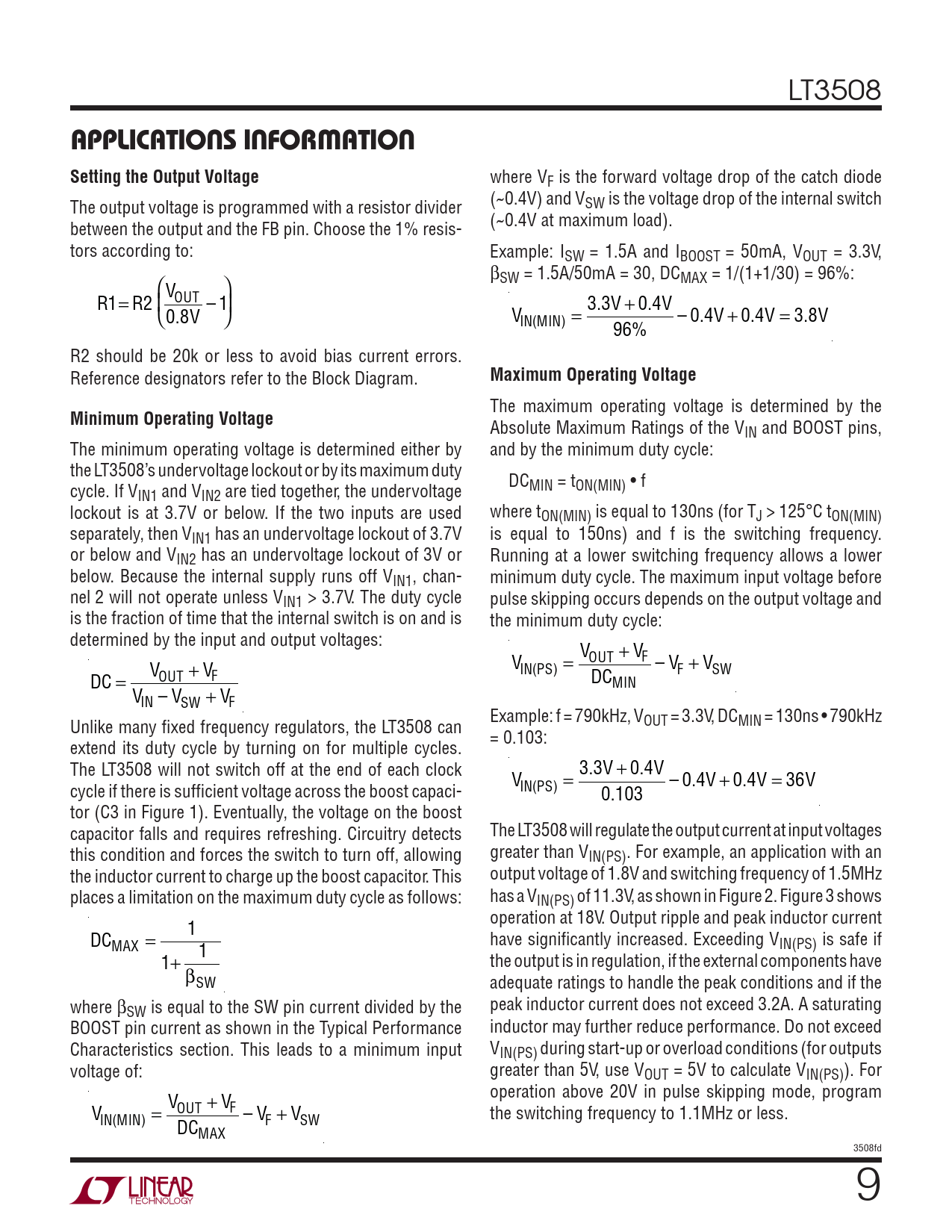 LT3508 APPLICATIONS INFORMATIONSetting the Output Voltage where VF is the forward voltage drop of the catch diode (~0.4V) and V The output voltage is programmed with a resistor divider SW is the voltage drop of the internal switch between the output and the FB pin. Choose the 1% resis- (~0.4V at maximum load). tors according to: Example: ISW = 1.5A and IBOOST = 50mA, VOUT = 3.3V, β ⎛ SW = 1.5A/50mA = 30, DCMAX = 1/(1+1/30) = 96%: V ⎞ R1= R2 OUT ⎜ – 1⎟ ⎝0.8V ⎠ V – 0.4V + 0.4V = 3.8V IN(MIN) = 3.3V + 0.4V 96% R2 should be 20k or less to avoid bias current errors. Reference designators refer to the Block Diagram. Maximum Operating Voltage The maximum operating voltage is determined by the Minimum Operating Voltage Absolute Maximum Ratings of the VIN and BOOST pins, The minimum operating voltage is determined either by and by the minimum duty cycle: the LT3508’s undervoltage lockout or by its maximum duty DC cycle. If V MIN = tON(MIN) • f IN1 and VIN2 are tied together, the undervoltage lockout is at 3.7V or below. If the two inputs are used where tON(MIN) is equal to 130ns (for TJ > 125°C tON(MIN) separately, then VIN1 has an undervoltage lockout of 3.7V is equal to 150ns) and f is the switching frequency. or below and VIN2 has an undervoltage lockout of 3V or Running at a lower switching frequency allows a lower below. Because the internal supply runs off VIN1 , chan- minimum duty cycle. The maximum input voltage before nel 2 will not operate unless VIN1 > 3.7V. The duty cycle pulse skipping occurs depends on the output voltage and is the fraction of time that the internal switch is on and is the minimum duty cycle: determined by the input and output voltages: + VF + V V = VOUT IN(PS) – VF + VSW DC = VOUT F DCMIN V + V IN – VSW F Example: f = 790kHz, V Unlike many fi xed frequency regulators, the LT3508 can OUT = 3.3V, DCMIN = 130ns • 790kHz = 0.103: extend its duty cycle by turning on for multiple cycles. The LT3508 will not switch off at the end of each clock V = 3.3V + 0.4V – 0.4V + 0.4V = 36V cycle if there is suffi cient voltage across the boost capaci- IN(PS) 0.103 tor (C3 in Figure 1). Eventually, the voltage on the boost capacitor falls and requires refreshing. Circuitry detects The LT3508 will regulate the output current at input voltages this condition and forces the switch to turn off, allowing greater than VIN(PS). For example, an application with an the inductor current to charge up the boost capacitor. This output voltage of 1.8V and switching frequency of 1.5MHz places a limitation on the maximum duty cycle as follows: has a VIN(PS) of 11.3V, as shown in Figure 2. Figure 3 shows operation at 18V. Output ripple and peak inductor current DCMAX = 1 have signifi cantly increased. Exceeding VIN(PS) is safe if 1+ 1 the output is in regulation, if the external components have β SW adequate ratings to handle the peak conditions and if the where βSW is equal to the SW pin current divided by the peak inductor current does not exceed 3.2A. A saturating BOOST pin current as shown in the Typical Performance inductor may further reduce performance. Do not exceed Characteristics section. This leads to a minimum input VIN(PS) during start-up or overload conditions (for outputs voltage of: greater than 5V, use VOUT = 5V to calculate VIN(PS)). For + operation above 20V in pulse skipping mode, program V V F IN(MIN) = VOUT – VF + VSW the switching frequency to 1.1MHz or less. DCMAX 3508fd 9 Document Outline FEATURES DESCRIPTION APPLICATIONS TYPICAL APPLICATION ABSOLUTE MAXIMUM RATINGS PIN CONFIGURATION ORDER INFORMATION ELECTRICAL CHARACTERISTICS TYPICAL PERFORMANCE CHARACTERISTICS PIN FUNCTIONS BLOCK DIAGRAM OPERATION APPLICATIONS INFORMATION TYPICAL APPLICATIONS PACKAGE DESCRIPTION REVISION HISTORY TYPICAL APPLICATION RELATED PARTS