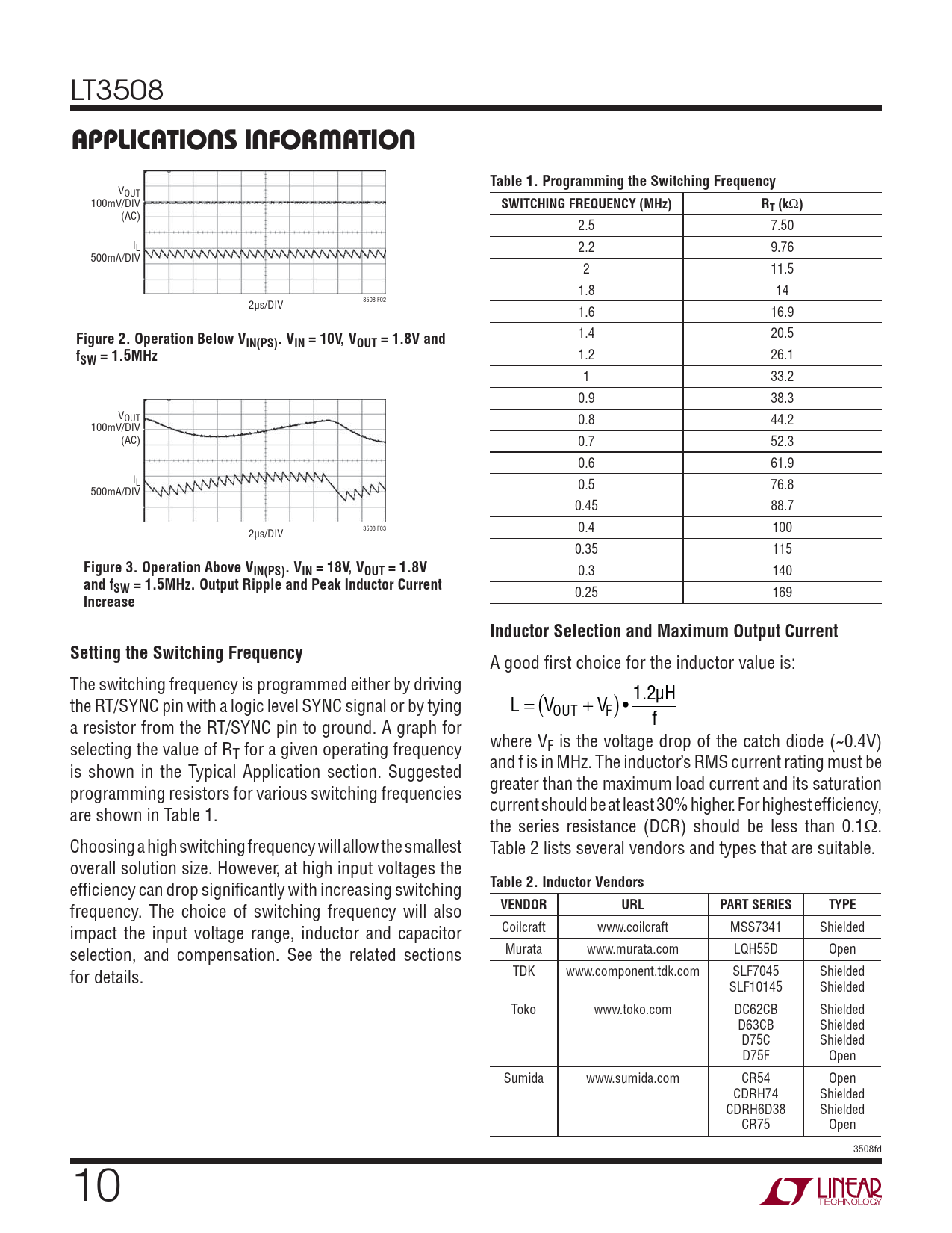 LT3508 APPLICATIONS INFORMATIONTable 1. Programming the Switching Frequency VOUT 100mV/DIV SWITCHING FREQUENCY (MHz)RT (k Ω ) (AC) 2.5 7.50 IL 2.2 9.76 500mA/DIV 2 11.5 1.8 14 3508 F02 2μs/DIV 1.6 16.9 1.4 20.5 Figure 2. Operation Below VIN(PS). VIN = 10V, VOUT = 1.8V andf 1.2 26.1 SW = 1.5MHz 1 33.2 0.9 38.3 VOUT 0.8 44.2 100mV/DIV (AC) 0.7 52.3 0.6 61.9 IL 0.5 76.8 500mA/DIV 0.45 88.7 3508 F03 0.4 100 2μs/DIV 0.35 115 Figure 3. Operation Above VIN(PS). VIN = 18V, VOUT = 1.8V 0.3 140 and fSW = 1.5MHz. Output Ripple and Peak Inductor Current 0.25 169 IncreaseInductor Selection and Maximum Output CurrentSetting the Switching Frequency A good fi rst choice for the inductor value is: The switching frequency is programmed either by driving 1.2µH the RT/SYNC pin with a logic level SYNC signal or by tying L = V ( + ) OUT VF • f a resistor from the RT/SYNC pin to ground. A graph for where VF is the voltage drop of the catch diode (~0.4V) selecting the value of RT for a given operating frequency and f is in MHz. The inductor’s RMS current rating must be is shown in the Typical Application section. Suggested greater than the maximum load current and its saturation programming resistors for various switching frequencies current should be at least 30% higher. For highest effi ciency, are shown in Table 1. the series resistance (DCR) should be less than 0.1Ω. Choosing a high switching frequency will allow the smallest Table 2 lists several vendors and types that are suitable. overall solution size. However, at high input voltages the Table 2. Inductor Vendors effi ciency can drop signifi cantly with increasing switching VENDORURLPART SERIESTYPE frequency. The choice of switching frequency will also Coilcraft www.coilcraft MSS7341 Shielded impact the input voltage range, inductor and capacitor Murata www.murata.com LQH55D Open selection, and compensation. See the related sections TDK www.component.tdk.com SLF7045 Shielded for details. SLF10145 Shielded Toko www.toko.com DC62CB Shielded D63CB Shielded D75C Shielded D75F Open Sumida www.sumida.com CR54 Open CDRH74 Shielded CDRH6D38 Shielded CR75 Open 3508fd 10 Document Outline FEATURES DESCRIPTION APPLICATIONS TYPICAL APPLICATION ABSOLUTE MAXIMUM RATINGS PIN CONFIGURATION ORDER INFORMATION ELECTRICAL CHARACTERISTICS TYPICAL PERFORMANCE CHARACTERISTICS PIN FUNCTIONS BLOCK DIAGRAM OPERATION APPLICATIONS INFORMATION TYPICAL APPLICATIONS PACKAGE DESCRIPTION REVISION HISTORY TYPICAL APPLICATION RELATED PARTS