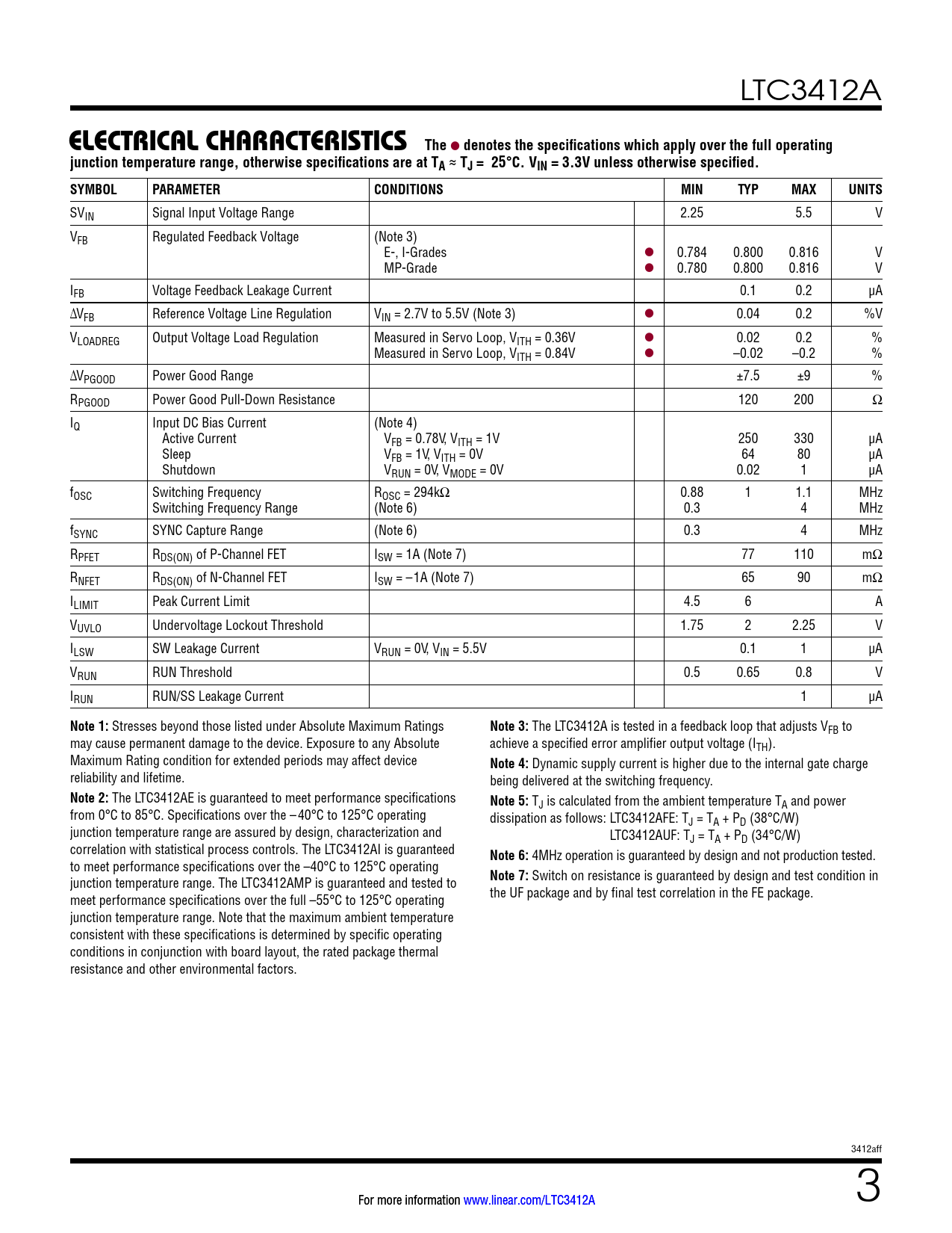 4MHz operation is guaranteed by design and not production tested. to meet performance specifications over the –40°C to 125°C operating junction temperature range. The LTC3412AMP is guaranteed and tested to