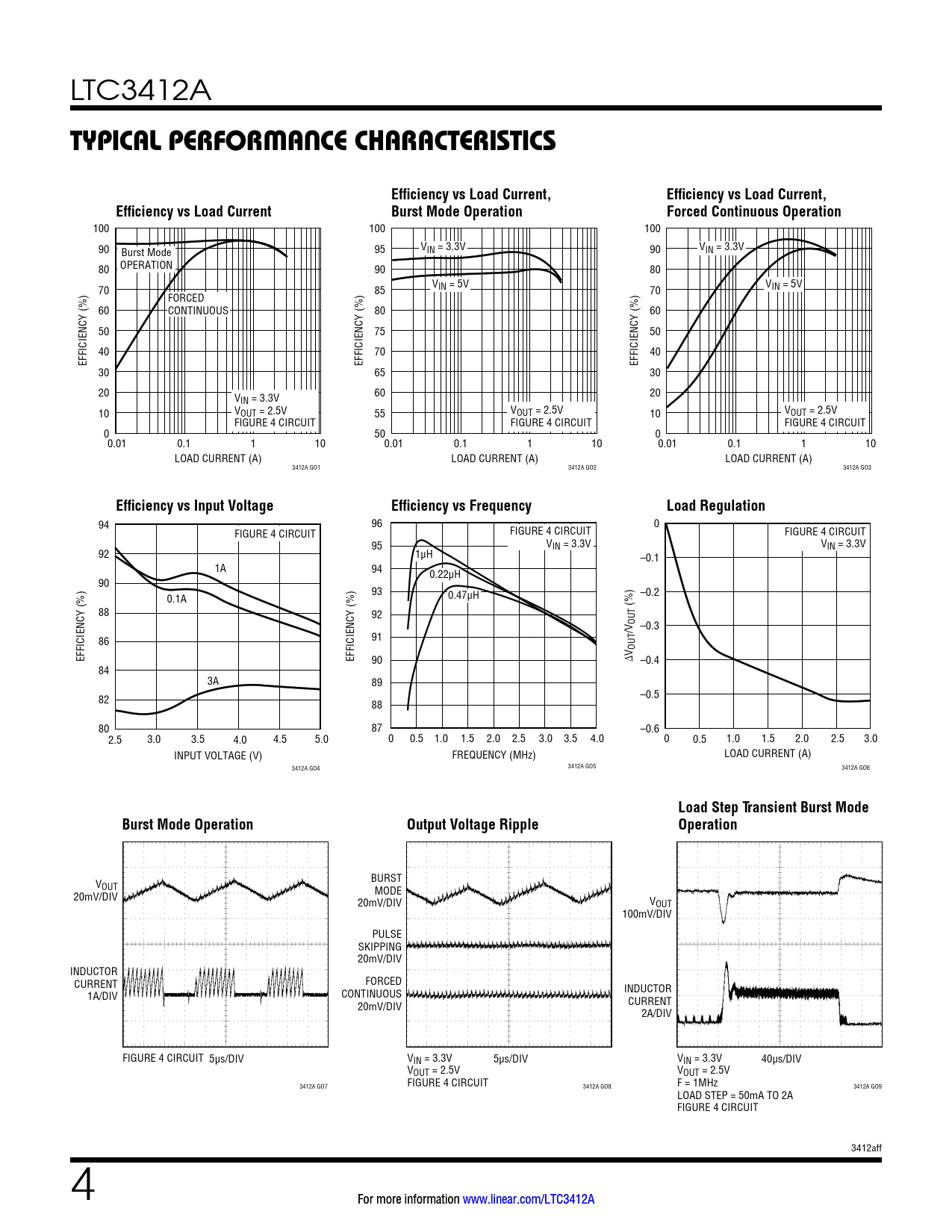 V BURST OUT 20mV/DIV MODE 20mV/DIV VOUT 100mV/DIV PULSE SKIPPING 20mV/DIV INDUCTOR CURRENT FORCED INDUCTOR 1A/DIV CONTINUOUS 20mV/DIV CURRENT 2A/DIV FIGURE 4 CIRCUIT 5µs/DIV VIN = 3.3V 5µs/DIV VIN = 3.3V 40µs/DIV VOUT = 2.5V VOUT = 2.5V FIGURE 4 CIRCUIT F = 1MHz 3412A GO7 3412A GO8 3412A GO9 LOAD STEP = 50mA TO 2A FIGURE 4 CIRCUIT 3412aff 4 Fo F r o rmo m r o e r e inf n o f r o m r a m t a iton o n ww w w w . w line n a e r a .rco c m o / m L / T L C T 3 C 4 3 1 4 2 1 A 2 Document Outline Features Applications Description Typical Application Absolute Maximum Ratings Pin Configuration Order Information Electrical Characteristics Typical Performance Characteristics Pin Functions Block Diagram Operation Applications Information Typical Applications Package Description Revision History Related Parts