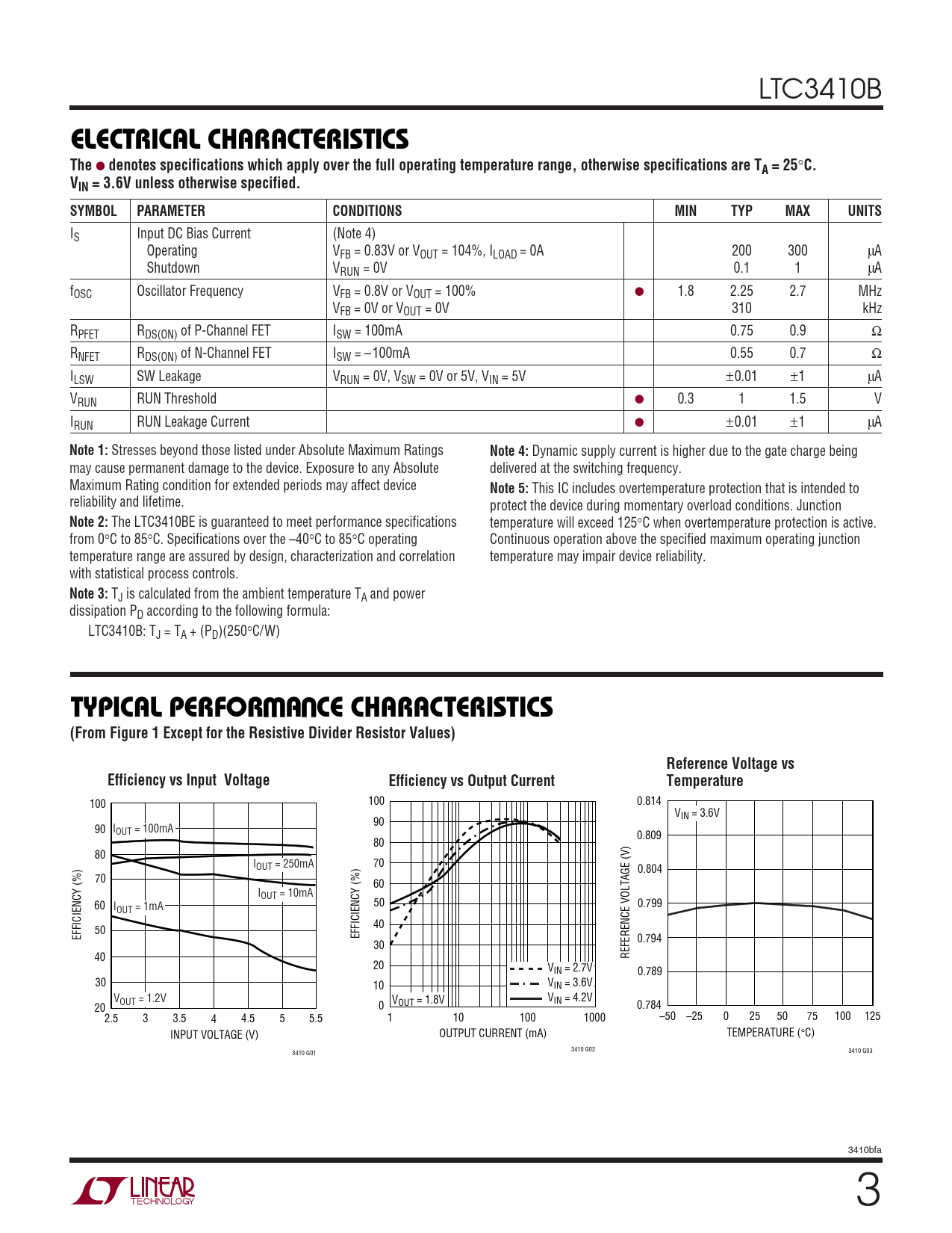 LTC3410B ELECTRICAL CHARACTERISTICSThe ● denotes specifications which apply over the full operating temperature range, otherwise specifications are TA = 25 ° C. VIN = 3.6V unless otherwise specified.SYMBOLPARAMETERCONDITIONSMINTYPMAXUNITS IS Input DC Bias Current (Note 4) Operating VFB = 0.83V or VOUT = 104%, ILOAD = 0A 200 300 µA Shutdown VRUN = 0V 0.1 1 µA fOSC Oscillator Frequency VFB = 0.8V or VOUT = 100% ● 1.8 2.25 2.7 MHz VFB = 0V or VOUT = 0V 310 kHz RPFET RDS(ON) of P-Channel FET ISW = 100mA 0.75 0.9 Ω RNFET RDS(ON) of N-Channel FET ISW = –100mA 0.55 0.7 Ω ILSW SW Leakage VRUN = 0V, VSW = 0V or 5V, VIN = 5V ±0.01 ±1 µA VRUN RUN Threshold ● 0.3 1 1.5 V IRUN RUN Leakage Current ● ±0.01 ±1 µA Note 1: Stresses beyond those listed under Absolute Maximum Ratings Note 4: Dynamic supply current is higher due to the gate charge being may cause permanent damage to the device. Exposure to any Absolute delivered at the switching frequency. Maximum Rating condition for extended periods may affect device Note 5: This IC includes overtemperature protection that is intended to reliability and lifetime. protect the device during momentary overload conditions. Junction Note 2: The LTC3410BE is guaranteed to meet performance specifications temperature will exceed 125°C when overtemperature protection is active. from 0°C to 85°C. Specifications over the –40°C to 85°C operating Continuous operation above the specified maximum operating junction temperature range are assured by design, characterization and correlation temperature may impair device reliability. with statistical process controls. Note 3: TJ is calculated from the ambient temperature TA and power dissipation PD according to the following formula: LTC3410B: TJ = TA + (PD)(250°C/W) WUTYPICAL PERFOR A CE CHARACTERISTICS(From Figure 1 Except for the Resistive Divider Resistor Values)Reference Voltage vsEfficiency vs Input VoltageEfficiency vs Output CurrentTemperature 100 100 0.814 VIN = 3.6V 90 90 IOUT = 100mA 0.809 80 80 IOUT = 250mA 70 0.804 70 60 IOUT = 10mA 60 I 50 0.799 OUT = 1mA 40 50 EFFICIENCY (%) EFFICIENCY (%) 0.794 30 40 REFERENCE VOLTAGE (V) 20 VIN = 2.7V 0.789 30 10 VIN = 3.6V VOUT = 1.2V V V OUT = 1.8V IN = 4.2V 20 0 0.784 2.5 3 3.5 4 4.5 5 5.5 1 10 100 1000 –50 –25 0 25 50 75 100 125 INPUT VOLTAGE (V) OUTPUT CURRENT (mA) TEMPERATURE (°C) 3410 G02 3410 G01 3410 G03 3410bfa 3
