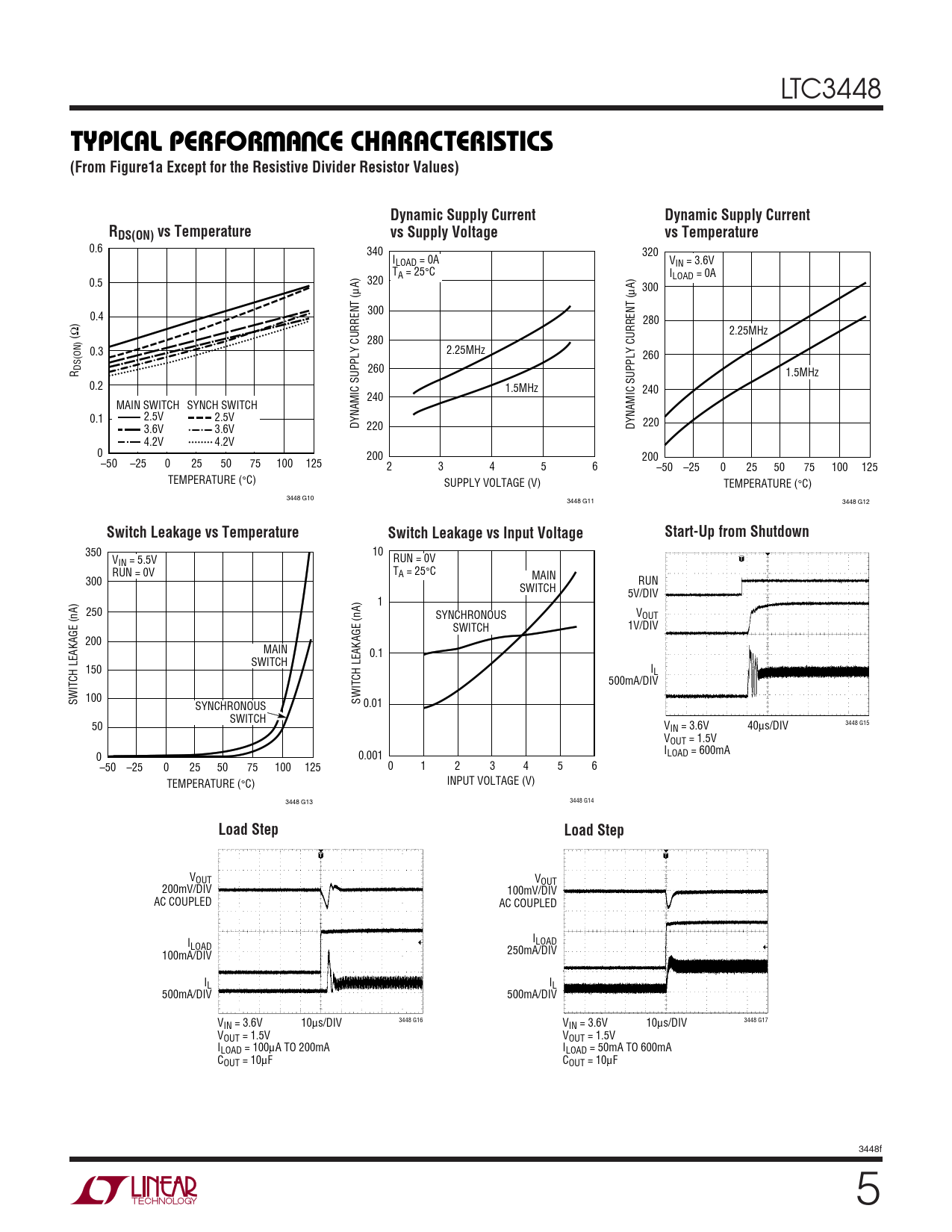0.6 340 320 ILOAD = 0A VIN = 3.6V TA = 25°C ILOAD = 0A 0.5 320 µA) µA) 300 300 0.4 ) 280 Ω 2.25MHz ( 280 0.3 2.25MHz 260 DS(ON)R 260 1.5MHz 0.2 1.5MHz 240 240 MAIN SWITCH SYNCH SWITCH 0.1 2.5V 2.5V 220 3.6V 3.6V DYNAMIC SUPPLY CURRENT ( 220 DYNAMIC SUPPLY CURRENT ( 4.2V 4.2V 0 200 200 –50 –25 0 25 50 75 100 125 2 3 4 5 6 –50 –25 0 25 50 75 100 125 TEMPERATURE (°C) SUPPLY VOLTAGE (V) TEMPERATURE (°C) 3448 G10 3448 G11 3448 G12