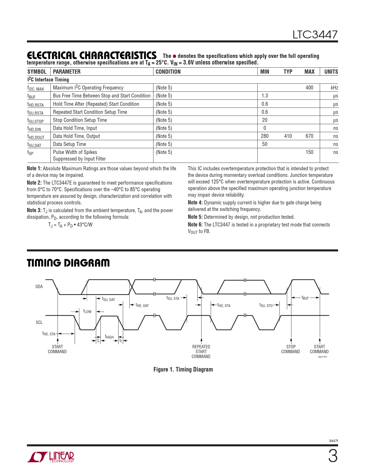 SDA t t t SU, DAT SU, STA BUF tHD, DAT tHD, STA tSU, STO tLOW SCL tHD, STA tHIGH tr tf START REPEATED STOP START COMMAND START COMMAND COMMAND COMMAND 3447 F01