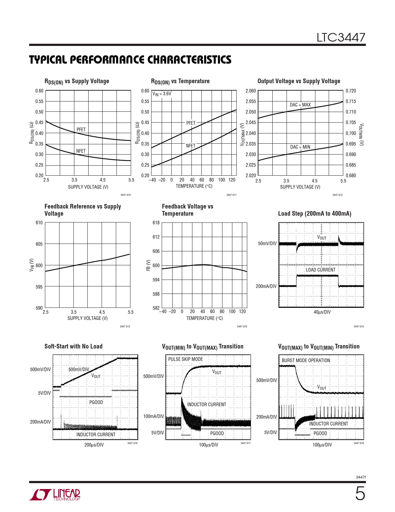 0.60 0.60 2.060 0.720 VIN = 3.6V 0.55 0.55 2.055 0.715 DAC = MAX 0.50 0.50 2.050 0.710 ) V Ω 0.45 Ω 0.45 PFET 2.045 0.705 OUTMIN ( (V) PFET 0.40 0.40 2.040 0.700 (V) DS(ON) DS(ON) R 0.35 R 0.35 OUTMAXV 2.035 0.695 NFET DAC = MIN NFET 0.30 0.30 2.030 0.690 0.25 0.25 2.025 0.685 0.20 0.20 2.020 0.680 2.5 3.5 4.5 5.5 – 40 –20 0 20 40 60 80 100 120 2.5 3.5 4.5 5.5 SUPPLY VOLTAGE (V) TEMPERATURE (°C) SUPPLY VOLTAGE (V) 3447 G10 3447 G11 3447 G12