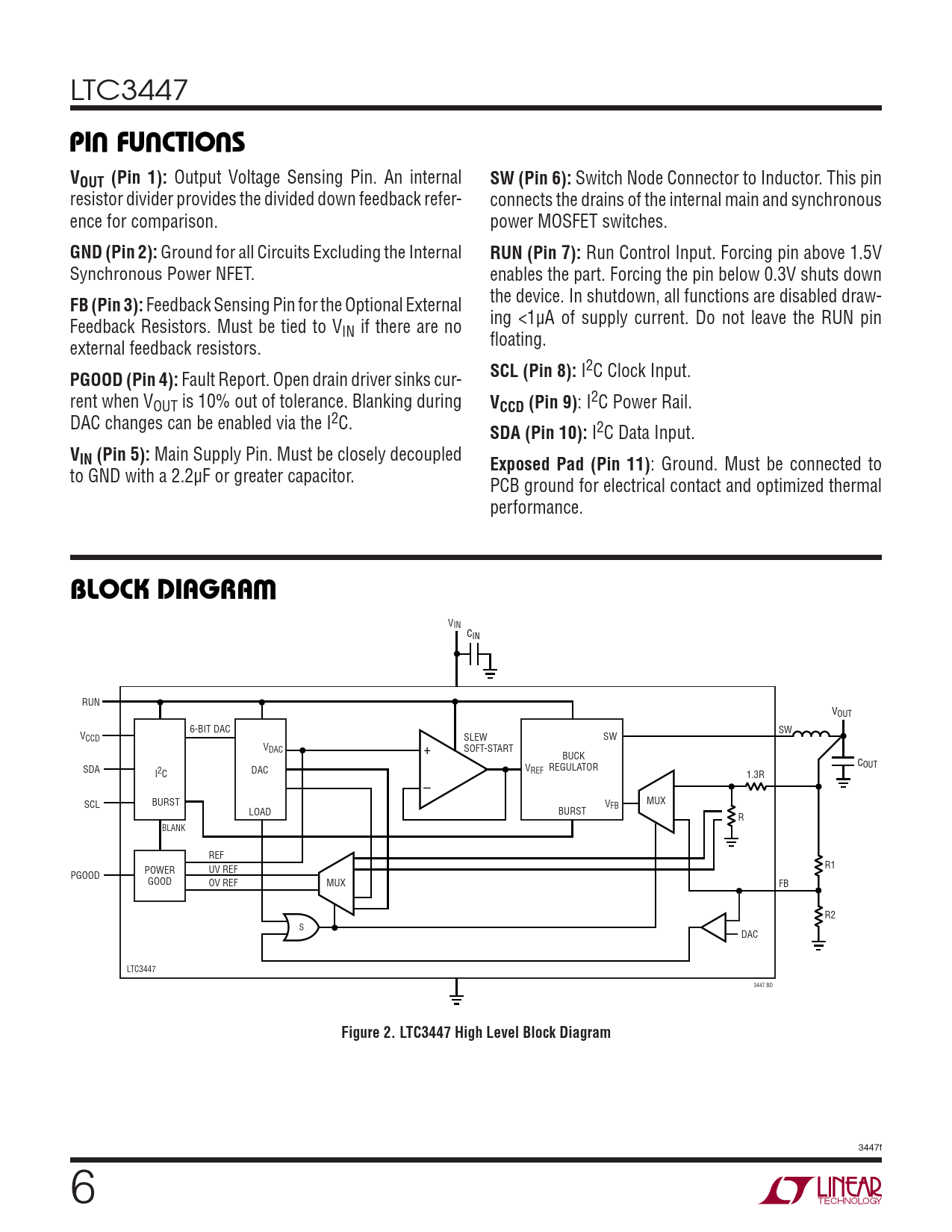 VIN CIN RUN VOUT 6-BIT DAC SW VCCD SLEW SW VDAC + SOFT-START BUCK C SDA V REGULATOR OUT DAC REF I2C 1.3R – BURST SCL V MUX FB LOAD BURST R BLANK REF R1 POWER UV REF PGOOD GOOD OV REF MUX FB R2 S DAC LTC3447 3447 BD