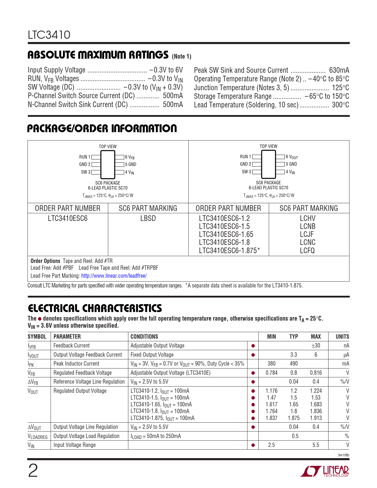 LTC3410 WWWUABSOLUTE AXI U RATI GS (Note 1) Input Supply Voltage .. – 0.3V to 6V Peak SW Sink and Source Current .. 630mA RUN, VFB Voltages ... – 0.3V to VIN Operating Temperature Range (Note 2) .. – 40°C to 85°C SW Voltage (DC) ... – 0.3V to (VIN + 0.3V) Junction Temperature (Notes 3, 5) .. 125°C P-Channel Switch Source Current (DC) ... 500mA Storage Temperature Range .. – 65°C to 150°C N-Channel Switch Sink Current (DC) ... 500mA Lead Temperature (Soldering, 10 sec)... 300°C UWUPACKAGE/ORDER I FOR ATIO TOP VIEW TOP VIEW RUN 1 6 VFB RUN 1 6 VOUT GND 2 5 GND GND 2 5 GND SW 3 4 VIN SW 3 4 VIN SC6 PACKAGE SC6 PACKAGE 6-LEAD PLASTIC SC70 6-LEAD PLASTIC SC70 TJMAX = 125°C, θJA = 250°C/ W TJMAX = 125°C, θJA = 250°C/ W ORDER PART NUMBER SC6 PART MARKING ORDER PART NUMBER SC6 PART MARKING LTC3410ESC6 LBSD LTC3410ESC6-1.2 LCHV LTC3410ESC6-1.5 LCNB LTC3410ESC6-1.65 LCJF LTC3410ESC6-1.8 LCNC LTC3410ESC6-1.875* LCFQ Order Options Tape and Reel: Add #TR Lead Free: Add #PBF Lead Free Tape and Reel: Add #TRPBF Lead Free Part Marking: http://www.linear.com/leadfree/ Consult LTC Marketing for parts specified with wider operating temperature ranges. *A separate data sheet is available for the LT3410-1.875. ELECTRICAL CHARACTERISTICSThe ● denotes specifications which apply over the full operating temperature range, otherwise specifications are TA = 25 ° C. VIN = 3.6V unless otherwise specified.SYMBOLPARAMETERCONDITIONSMINTYPMAXUNITS IVFB Feedback Current Adjustable Output Voltage ● ±30 nA IVOUT Output Voltage Feedback Current Fixed Output Voltage ● 3.3 6 µA IPK Peak Inductor Current VIN = 3V, VFB = 0.7V or VOUT = 90%, Duty Cycle < 35% 380 490 mA VFB Regulated Feedback Voltage Adjustable Output Voltage (LTC3410E) ● 0.784 0.8 0.816 V ∆VFB Reference Voltage Line Regulation VIN = 2.5V to 5.5V ● 0.04 0.4 %/V VOUT Regulated Output Voltage LTC3410-1.2, IOUT = 100mA ● 1.176 1.2 1.224 V LTC3410-1.5, IOUT = 100mA ● 1.47 1.5 1.53 V LTC3410-1.65, IOUT = 100mA ● 1.617 1.65 1.683 V LTC3410-1.8, IOUT = 100mA ● 1.764 1.8 1.836 V LTC3410-1.875, IOUT = 100mA ● 1.837 1.875 1.913 V ∆VOUT Output Voltage Line Regulation VIN = 2.5V to 5.5V ● 0.04 0.4 %/V VLOADREG Output Voltage Load Regulation ILOAD = 50mA to 250mA 0.5 % VIN Input Voltage Range ● 2.5 5.5 V 3410fb 2