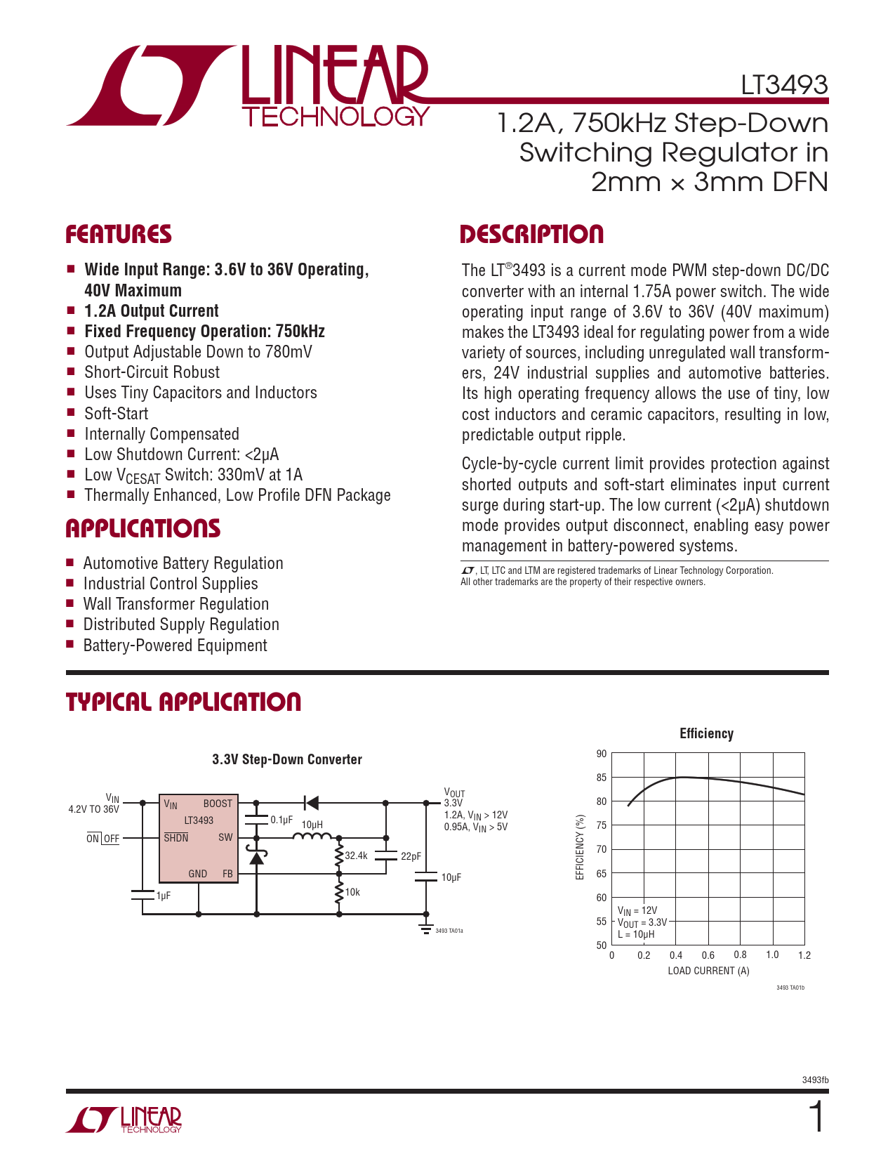 LT3493 1.2A, 750kHz Step-Down Switching Regulator in 2mm × 3mm DFN