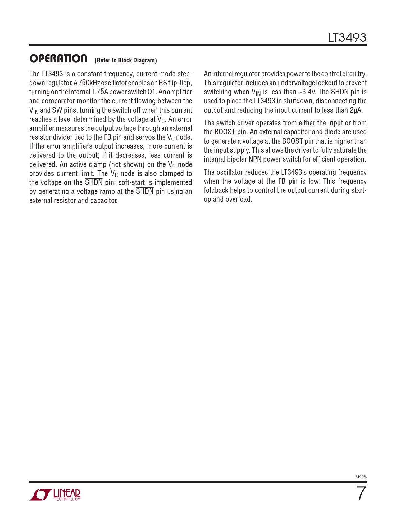 The LT3493 is a constant frequency, current mode step- An internal regulator provides power to the control circuitry. down regulator. A 750kHz oscillator enables an RS fl ip-fl op, This regulator includes an undervoltage lockout to prevent turning on the internal 1.75A power switch Q1. An amplifi er switching when VIN is less than ~3.4V. The SHDN pin is and comparator monitor the current fl owing between the used to place the LT3493 in shutdown, disconnecting the VIN and SW pins, turning the switch off when this current output and reducing the input current to less than 2μA. reaches a level determined by the voltage at VC. An error The switch driver operates from either the input or from amplifi er measures the output voltage through an external the BOOST pin. An external capacitor and diode are used resistor divider tied to the FB pin and servos the VC node. to generate a voltage at the BOOST pin that is higher than If the error amplifi er’s output increases, more current is the input supply. This allows the driver to fully saturate the delivered to the output; if it decreases, less current is internal bipolar NPN power switch for effi cient operation. delivered. An active clamp (not shown) on the VC node provides current limit. The V The oscillator reduces the LT3493’s operating frequency C node is also clamped to the voltage on the SHDN pin; soft-start is implemented when the voltage at the FB pin is low. This frequency by generating a voltage ramp at the SHDN pin using an foldback helps to control the output current during start- external resistor and capacitor. up and overload. 3493fb 7