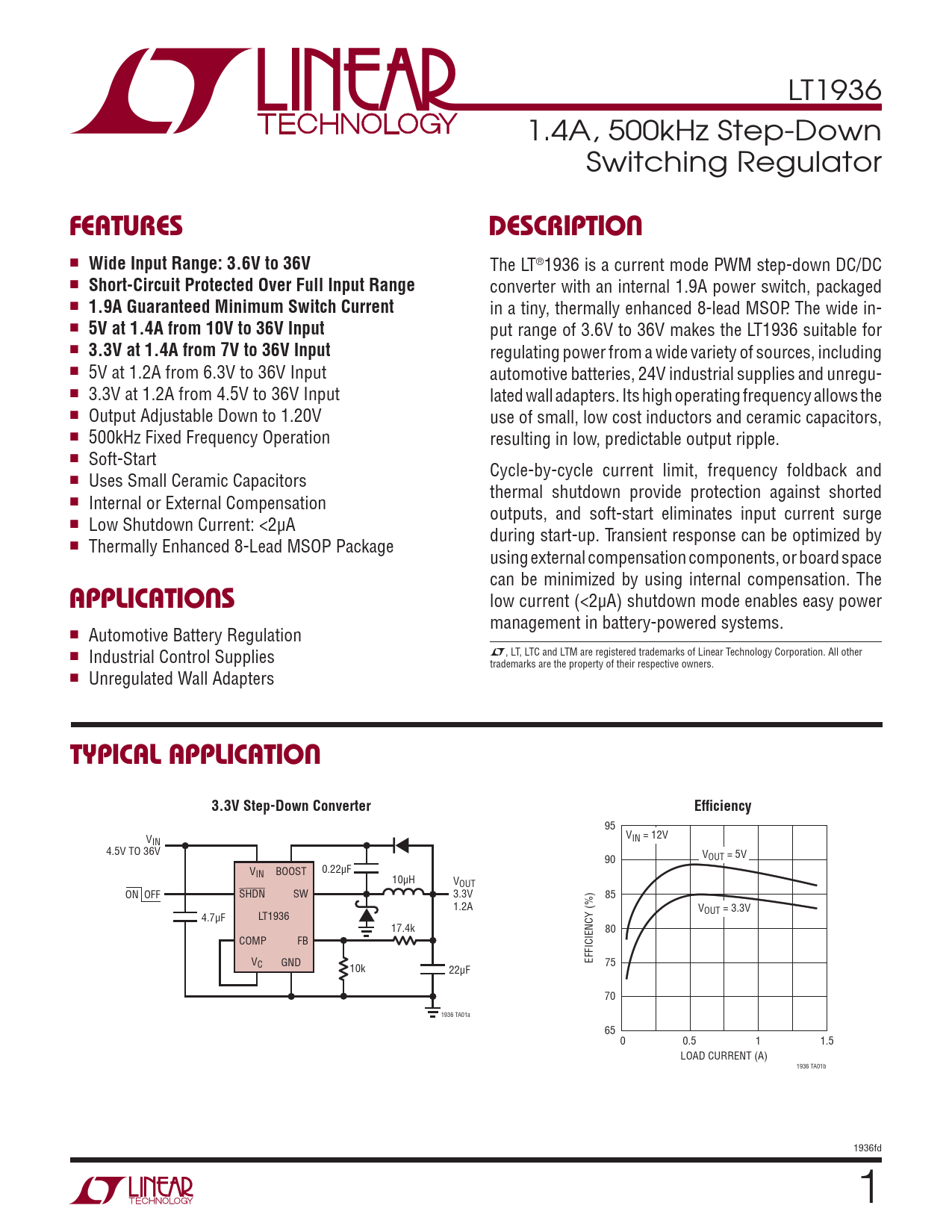 95 V V IN IN = 12V 4.5V TO 36V 90 VOUT = 5V 0.22μF VIN BOOST 10μH VOUT ON OFF SHDN SW 3.3V 85 1.2A VOUT = 3.3V 4.7μF LT1936 17.4k 80 COMP FB V EFFICIENCY (%) C GND 75 10k 22μF 70 1936 TA01a 65 0 0.5 1 1.5 LOAD CURRENT (A) 1936 TA01b 1936fd 1