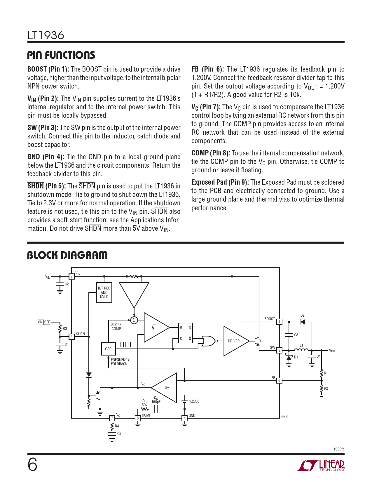 Pages / Page20 / 6 — PIN FUNCTIONS. BOOST (Pin 1):. FB (Pin 6):. VIN (Pin 2):. VC (Pin 7):. SW …