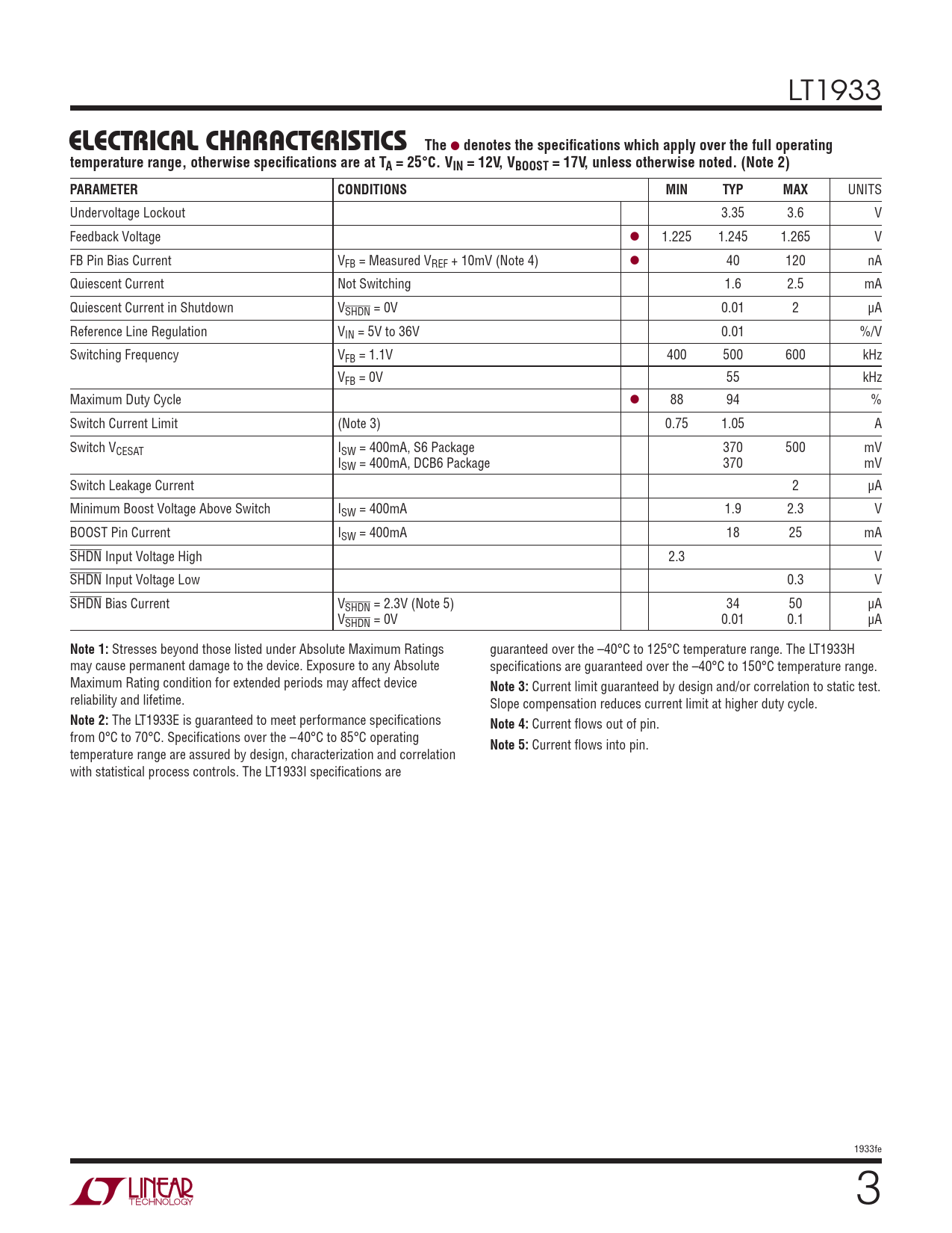 LT1933 ELECTRICAL CHARACTERISTICSThe l denotes the specifi cations which apply over the full operatingtemperature range, otherwise specifi cations are at TA = 25°C. VIN = 12V, VBOOST = 17V, unless otherwise noted. (Note 2)PARAMETERCONDITIONSMINTYPMAX UNITS Undervoltage Lockout 3.35 3.6 V Feedback Voltage l 1.225 1.245 1.265 V FB Pin Bias Current VFB = Measured VREF + 10mV (Note 4) l 40 120 nA Quiescent Current Not Switching 1.6 2.5 mA Quiescent Current in Shutdown VSHDN = 0V 0.01 2 μA Reference Line Regulation VIN = 5V to 36V 0.01 %/V Switching Frequency VFB = 1.1V 400 500 600 kHz VFB = 0V 55 kHz Maximum Duty Cycle l 88 94 % Switch Current Limit (Note 3) 0.75 1.05 A Switch VCESAT ISW = 400mA, S6 Package 370 500 mV ISW = 400mA, DCB6 Package 370 mV Switch Leakage Current 2 μA Minimum Boost Voltage Above Switch ISW = 400mA 1.9 2.3 V BOOST Pin Current ISW = 400mA 18 25 mA SHDN Input Voltage High 2.3 V SHDN Input Voltage Low 0.3 V SHDN Bias Current VSHDN = 2.3V (Note 5) 34 50 μA VSHDN = 0V 0.01 0.1 μA Note 1: Stresses beyond those listed under Absolute Maximum Ratings guaranteed over the –40°C to 125°C temperature range. The LT1933H may cause permanent damage to the device. Exposure to any Absolute specifi cations are guaranteed over the –40°C to 150°C temperature range. Maximum Rating condition for extended periods may affect device Note 3: Current limit guaranteed by design and/or correlation to static test. reliability and lifetime. Slope compensation reduces current limit at higher duty cycle. Note 2: The LT1933E is guaranteed to meet performance specifi cations Note 4: Current fl ows out of pin. from 0°C to 70°C. Specifi cations over the –40°C to 85°C operating Note 5: Current fl ows into pin. temperature range are assured by design, characterization and correlation with statistical process controls. The LT1933I specifi cations are 1933fe 3