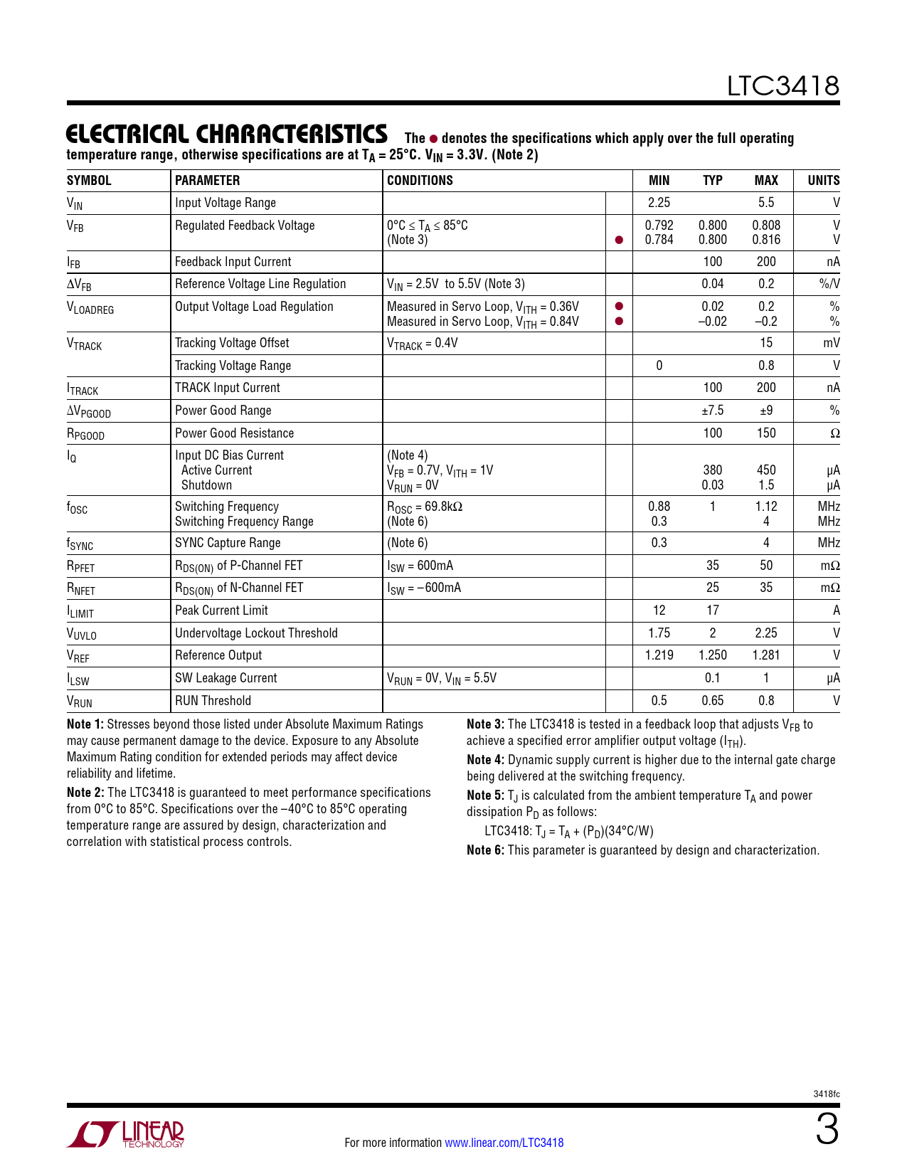 LTC3418 elecTrical characTerisTicsThe l denotes the specifications which apply over the full operatingtemperature range, otherwise specifications are at TA = 25°C. VIN = 3.3V. (Note 2) SYMBOLPARAMETERCONDITIONSMINTYPMAXUNITS VIN Input Voltage Range 2.25 5.5 V VFB Regulated Feedback Voltage 0°C ≤ TA ≤ 85°C 0.792 0.800 0.808 V (Note 3) l 0.784 0.800 0.816 V IFB Feedback Input Current 100 200 nA ∆VFB Reference Voltage Line Regulation VIN = 2.5V to 5.5V (Note 3) 0.04 0.2 %/V VLOADREG Output Voltage Load Regulation Measured in Servo Loop, VITH = 0.36V l 0.02 0.2 % Measured in Servo Loop, VITH = 0.84V l –0.02 –0.2 % VTRACK Tracking Voltage Offset VTRACK = 0.4V 15 mV Tracking Voltage Range 0 0.8 V ITRACK TRACK Input Current 100 200 nA ∆VPGOOD Power Good Range ±7.5 ±9 % RPGOOD Power Good Resistance 100 150 Ω IQ Input DC Bias Current (Note 4) Active Current VFB = 0.7V, VITH = 1V 380 450 µA Shutdown VRUN = 0V 0.03 1.5 µA fOSC Switching Frequency ROSC = 69.8kΩ 0.88 1 1.12 MHz Switching Frequency Range (Note 6) 0.3 4 MHz fSYNC SYNC Capture Range (Note 6) 0.3 4 MHz RPFET RDS(ON) of P-Channel FET ISW = 600mA 35 50 mΩ RNFET RDS(ON) of N-Channel FET ISW = –600mA 25 35 mΩ ILIMIT Peak Current Limit 12 17 A VUVLO Undervoltage Lockout Threshold 1.75 2 2.25 V VREF Reference Output 1.219 1.250 1.281 V ILSW SW Leakage Current VRUN = 0V, VIN = 5.5V 0.1 1 µA VRUN RUN Threshold 0.5 0.65 0.8 V Note 1: Stresses beyond those listed under Absolute Maximum Ratings Note 3: The LTC3418 is tested in a feedback loop that adjusts VFB to may cause permanent damage to the device. Exposure to any Absolute achieve a specified error amplifier output voltage (ITH). Maximum Rating condition for extended periods may affect device Note 4: Dynamic supply current is higher due to the internal gate charge reliability and lifetime. being delivered at the switching frequency. Note 2: The LTC3418 is guaranteed to meet performance specifications Note 5: TJ is calculated from the ambient temperature TA and power from 0°C to 85°C. Specifications over the –40°C to 85°C operating dissipation PD as follows: temperature range are assured by design, characterization and LTC3418: T correlation with statistical process controls. J = TA + (PD)(34°C/W) Note 6: This parameter is guaranteed by design and characterization. 3418fc For more information www.linear.com/LTC3418 3 Document Outline Description Typical Application Absolute Maximum Ratings Pin Configuration Electrical Characteristics Typical Performance Characteristics Pin Functions Block Diagram Operation Applications Information Package Description Typical Application Related Parts