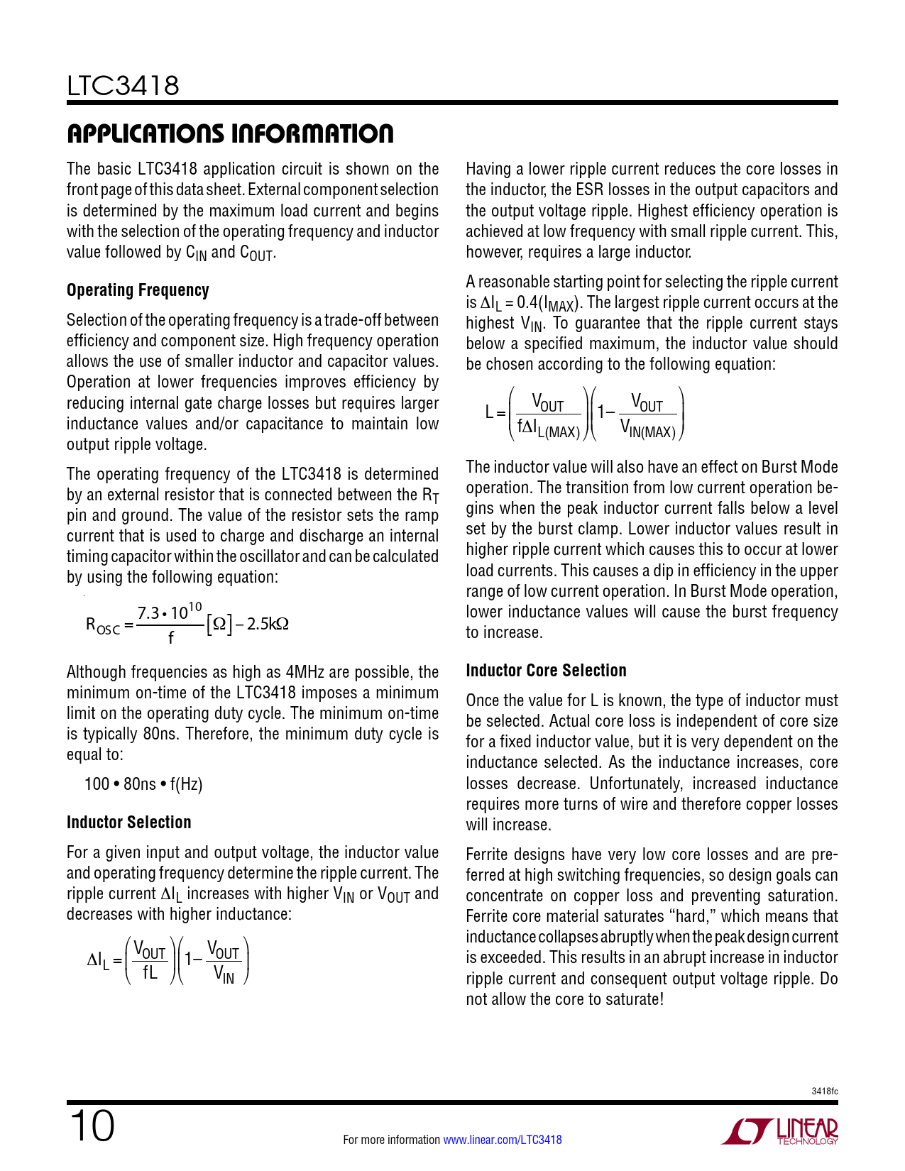 LTC3418 applicaTions inForMaTion The basic LTC3418 application circuit is shown on the Having a lower ripple current reduces the core losses in front page of this data sheet. External component selection the inductor, the ESR losses in the output capacitors and is determined by the maximum load current and begins the output voltage ripple. Highest efficiency operation is with the selection of the operating frequency and inductor achieved at low frequency with small ripple current. This, value followed by CIN and COUT. however, requires a large inductor. Operating Frequency A reasonable starting point for selecting the ripple current is ∆IL = 0.4(IMAX). The largest ripple current occurs at the Selection of the operating frequency is a trade-off between highest VIN. To guarantee that the ripple current stays efficiency and component size. High frequency operation below a specified maximum, the inductor value should allows the use of smaller inductor and capacitor values. be chosen according to the following equation: Operation at lower frequencies improves efficiency by reducing internal gate charge losses but requires larger V V L OUT 1– OUT inductance values and/or capacitance to maintain low = fΔI L(MAX) V IN(MAX) output ripple voltage. The operating frequency of the LTC3418 is determined The inductor value will also have an effect on Burst Mode by an external resistor that is connected between the R operation. The transition from low current operation be- T pin and ground. The value of the resistor sets the ramp gins when the peak inductor current falls below a level current that is used to charge and discharge an internal set by the burst clamp. Lower inductor values result in timing capacitor within the oscillator and can be calculated higher ripple current which causes this to occur at lower by using the following equation: load currents. This causes a dip in efficiency in the upper range of low current operation. In Burst Mode operation, lower inductance values will cause the burst frequency R 7.3 • 1010 OSC = Ω ⎡⎣ ⎤⎦– 2.5kΩ f to increase. Although frequencies as high as 4MHz are possible, the Inductor Core Selection minimum on-time of the LTC3418 imposes a minimum Once the value for L is known, the type of inductor must limit on the operating duty cycle. The minimum on-time be selected. Actual core loss is independent of core size is typically 80ns. Therefore, the minimum duty cycle is for a fixed inductor value, but it is very dependent on the equal to: inductance selected. As the inductance increases, core 100 • 80ns • f(Hz) losses decrease. Unfortunately, increased inductance requires more turns of wire and therefore copper losses Inductor Selection will increase. For a given input and output voltage, the inductor value Ferrite designs have very low core losses and are pre- and operating frequency determine the ripple current. The ferred at high switching frequencies, so design goals can ripple current ∆IL increases with higher VIN or VOUT and concentrate on copper loss and preventing saturation. decreases with higher inductance: Ferrite core material saturates “hard,” which means that V V inductance collapses abruptly when the peak design current ΔI OUT OUT L = 1– is exceeded. This results in an abrupt increase in inductor fL VIN ripple current and consequent output voltage ripple. Do not allow the core to saturate! 3418fc 10 For more information www.linear.com/LTC3418 Document Outline Description Typical Application Absolute Maximum Ratings Pin Configuration Electrical Characteristics Typical Performance Characteristics Pin Functions Block Diagram Operation Applications Information Package Description Typical Application Related Parts