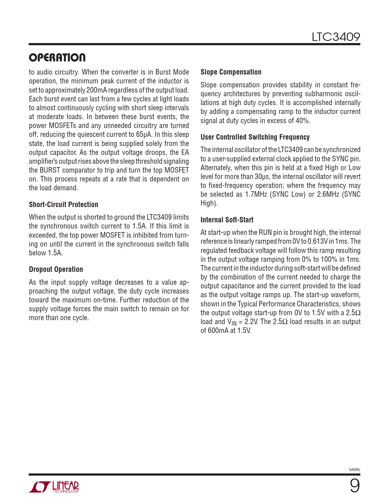 LTC3409 OPERATION to audio circuitry. When the converter is in Burst Mode Slope Compensation operation, the minimum peak current of the inductor is Slope compensation provides stability in constant fre- set to approximately 200mA regardless of the output load. quency architectures by preventing subharmonic oscil- Each burst event can last from a few cycles at light loads lations at high duty cycles. It is accomplished internally to almost continuously cycling with short sleep intervals by adding a compensating ramp to the inductor current at moderate loads. In between these burst events, the signal at duty cycles in excess of 40%. power MOSFETs and any unneeded circuitry are turned off, reducing the quiescent current to 65μA. In this sleep User Controlled Switching Frequency state, the load current is being supplied solely from the output capacitor. As the output voltage droops, the EA The internal oscillator of the LTC3409 can be synchronized amplifi er’s output rises above the sleep threshold signaling to a user-supplied external clock applied to the SYNC pin. the BURST comparator to trip and turn the top MOSFET Alternately, when this pin is held at a fi xed High or Low on. This process repeats at a rate that is dependent on level for more than 30μs, the internal oscillator will revert the load demand. to fi xed-frequency operation; where the frequency may be selected as 1.7MHz (SYNC Low) or 2.6MHz (SYNC Short-Circuit Protection High). When the output is shorted to ground the LTC3409 limits Internal Soft-Start the synchronous switch current to 1.5A. If this limit is exceeded, the top power MOSFET is inhibited from turn- At start-up when the RUN pin is brought high, the internal ing on until the current in the synchronous switch falls reference is linearly ramped from 0V to 0.613V in 1ms. The below 1.5A. regulated feedback voltage will follow this ramp resulting in the output voltage ramping from 0% to 100% in 1ms. Dropout Operation The current in the inductor during soft-start will be defi ned by the combination of the current needed to charge the As the input supply voltage decreases to a value ap- output capacitance and the current provided to the load proaching the output voltage, the duty cycle increases as the output voltage ramps up. The start-up waveform, toward the maximum on-time. Further reduction of the shown in the Typical Performance Characteristics, shows supply voltage forces the main switch to remain on for the output voltage start-up from 0V to 1.5V with a 2.5Ω more than one cycle. load and VIN = 2.2V. The 2.5Ω load results in an output of 600mA at 1.5V. 3409fc 9