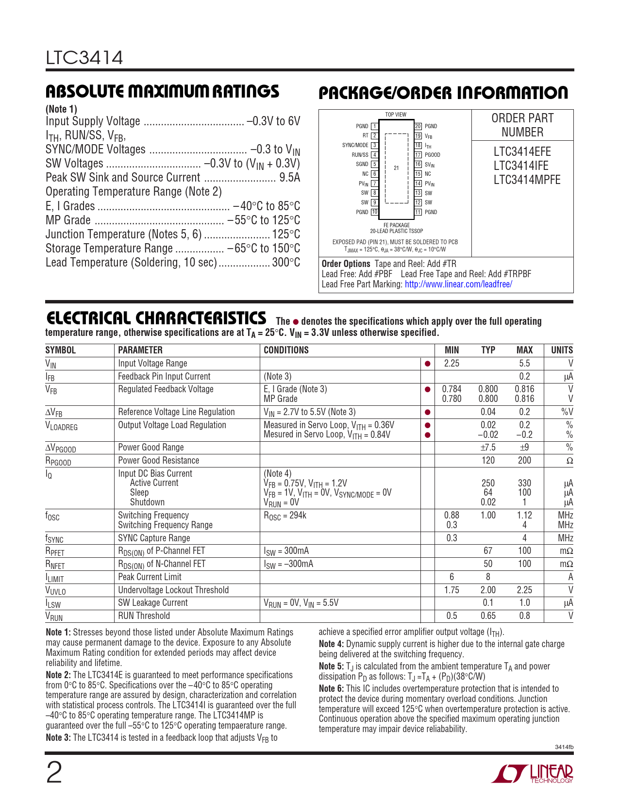 LTC3414 WWWUUWUABSOLUTE AXI URATI GSPACKAGE/ORDER I FOR ATIO(Note 1) TOP VIEW Input Supply Voltage ... –0.3V to 6V ORDER PART PGND 1 20 PGND I RT 2 19 VFB NUMBER TH, RUN/SS, VFB, SYNC/MODE Voltages .. –0.3 to V SYNC/MODE 3 18 ITH IN RUN/SS 4 17 PGOOD LTC3414EFE SW Voltages ... –0.3V to (VIN + 0.3V) SGND 5 16 SVIN 21 LTC3414IFE Peak SW Sink and Source Current ... 9.5A NC 6 15 NC PV 7 14 IN PVIN LTC3414MPFE Operating Temperature Range (Note 2) SW 8 13 SW E, I Grades .. – 40°C to 85°C SW 9 12 SW PGND 10 11 PGND MP Grade ... – 55°C to 125°C FE PACKAGE Junction Temperature (Notes 5, 6) ... 125°C 20-LEAD PLASTIC TSSOP EXPOSED PAD (PIN 21), MUST BE SOLDERED TO PCB Storage Temperature Range ... – 65°C to 150°C TJMAX = 125°C, θJA = 38°C/W, θJC = 10°C/W Lead Temperature (Soldering, 10 sec).. 300°C Order Options Tape and Reel: Add #TR Lead Free: Add #PBF Lead Free Tape and Reel: Add #TRPBF Lead Free Part Marking: http://www.linear.com/leadfree/ ELECTRICAL CHARACTERISTICS The ● denotes the specifications which apply over the full operatingtemperature range, otherwise specifications are at TA = 25 ° C. VIN = 3.3V unless otherwise specified.SYMBOLPARAMETERCONDITIONSMINTYPMAXUNITS VIN Input Voltage Range ● 2.25 5.5 V IFB Feedback Pin Input Current (Note 3) 0.2 μA VFB Regulated Feedback Voltage E, I Grade (Note 3) ● 0.784 0.800 0.816 V MP Grade 0.780 0.800 0.816 V ΔVFB Reference Voltage Line Regulation VIN = 2.7V to 5.5V (Note 3) ● 0.04 0.2 %V VLOADREG Output Voltage Load Regulation Measured in Servo Loop, VITH = 0.36V ● 0.02 0.2 % Mesured in Servo Loop, VITH = 0.84V ● –0.02 –0.2 % ΔVPGOOD Power Good Range ±7.5 ±9 % RPGOOD Power Good Resistance 120 200 Ω IQ Input DC Bias Current (Note 4) Active Current VFB = 0.75V, VITH = 1.2V 250 330 μA Sleep VFB = 1V, VITH = 0V, VSYNC/MODE = 0V 64 100 μA Shutdown VRUN = 0V 0.02 1 μA fOSC Switching Frequency ROSC = 294k 0.88 1.00 1.12 MHz Switching Frequency Range 0.3 4 MHz fSYNC SYNC Capture Range 0.3 4 MHz RPFET RDS(ON) of P-Channel FET ISW = 300mA 67 100 mΩ RNFET RDS(ON) of N-Channel FET ISW = –300mA 50 100 mΩ ILIMIT Peak Current Limit 6 8 A VUVLO Undervoltage Lockout Threshold 1.75 2.00 2.25 V ILSW SW Leakage Current VRUN = 0V, VIN = 5.5V 0.1 1.0 μA VRUN RUN Threshold 0.5 0.65 0.8 V Note 1: Stresses beyond those listed under Absolute Maximum Ratings achieve a specified error amplifier output voltage (ITH). may cause permanent damage to the device. Exposure to any Absolute Note 4: Dynamic supply current is higher due to the internal gate charge Maximum Rating condition for extended periods may affect device being delivered at the switching frequency. reliability and lifetime. Note 5: TJ is calculated from the ambient temperature TA and power Note 2: The LTC3414E is guaranteed to meet performance specifications dissipation PD as follows: TJ =TA + (PD)(38°C/W) from 0°C to 85°C. Specifications over the –40°C to 85°C operating Note 6: This IC includes overtemperature protection that is intended to temperature range are assured by design, characterization and correlation protect the device during momentary overload conditions. Junction with statistical process controls. The LTC3414I is guaranteed over the full temperature will exceed 125°C when overtemperature protection is active. –40°C to 85°C operating temperature range. The LTC3414MP is Continuous operation above the specified maximum operating junction guaranteed over the full –55°C to 125°C operating tempaerature range. temperature may impair device reliabability. Note 3: The LTC3414 is tested in a feedback loop that adjusts VFB to 3414fb 2