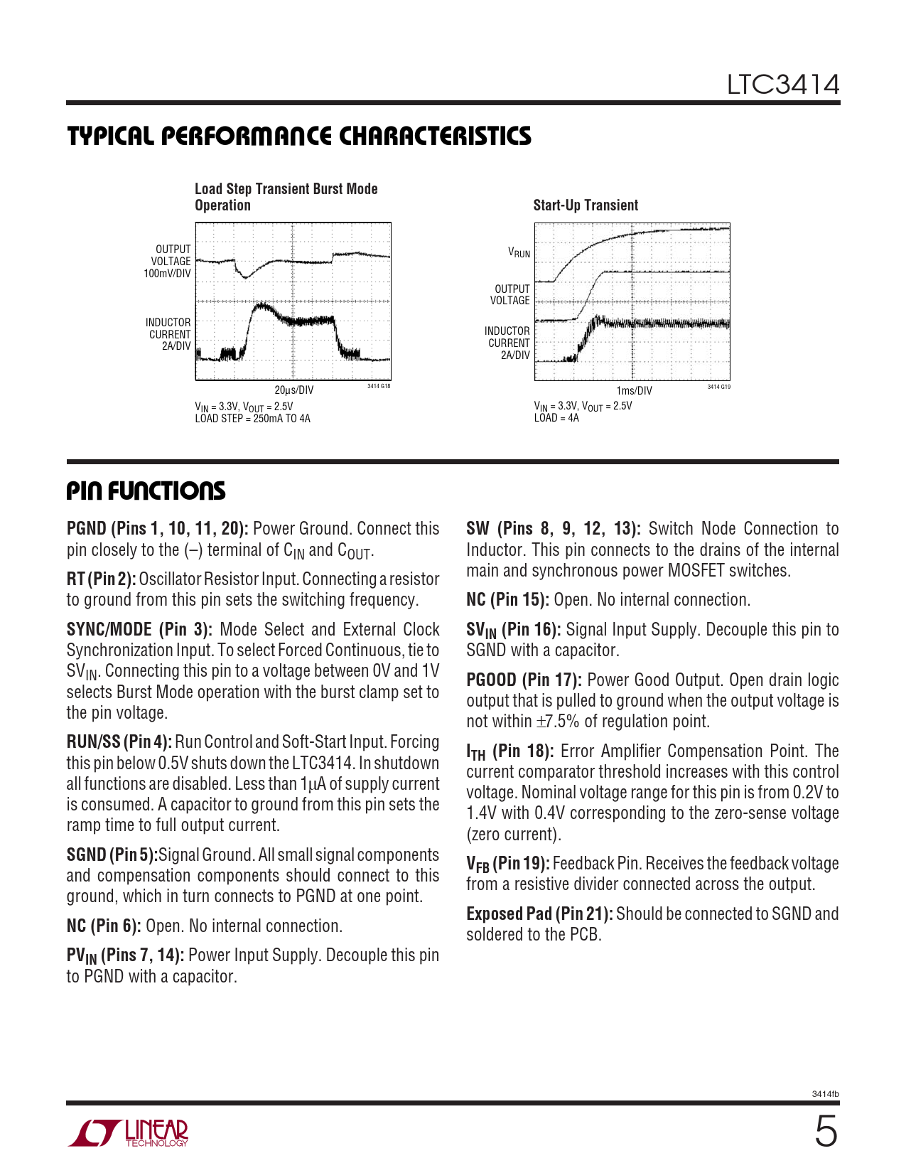 LTC3414 WUTYPICAL PERFOR A CE CHARACTERISTICSLoad Step Transient Burst Mode OperationStart-Up Transient OUTPUT VRUN VOLTAGE 100mV/DIV OUTPUT VOLTAGE INDUCTOR INDUCTOR CURRENT CURRENT 2A/DIV 2A/DIV 3414 G18 3414 G19 20μs/DIV 1ms/DIV V V IN = 3.3V, VOUT = 2.5V IN = 3.3V, VOUT = 2.5V LOAD STEP = 250mA TO 4A LOAD = 4A UUUPI FU CTIO SPGND (Pins 1, 10, 11, 20): Power Ground. Connect this SW (Pins 8, 9, 12, 13): Switch Node Connection to pin closely to the (–) terminal of CIN and COUT. Inductor. This pin connects to the drains of the internal main and synchronous power MOSFET switches. RT (Pin 2): Oscillator Resistor Input. Connecting a resistor to ground from this pin sets the switching frequency. NC (Pin 15): Open. No internal connection. SYNC/MODE (Pin 3): Mode Select and External Clock SVIN (Pin 16): Signal Input Supply. Decouple this pin to Synchronization Input. To select Forced Continuous, tie to SGND with a capacitor. SVIN. Connecting this pin to a voltage between 0V and 1V PGOOD (Pin 17): Power Good Output. Open drain logic selects Burst Mode operation with the burst clamp set to output that is pulled to ground when the output voltage is the pin voltage. not within ±7.5% of regulation point. RUN/SS (Pin 4): Run Control and Soft-Start Input. Forcing I this pin below 0.5V shuts down the LTC3414. In shutdown TH (Pin 18): Error Amplifier Compensation Point. The current comparator threshold increases with this control all functions are disabled. Less than 1μA of supply current voltage. Nominal voltage range for this pin is from 0.2V to is consumed. A capacitor to ground from this pin sets the 1.4V with 0.4V corresponding to the zero-sense voltage ramp time to full output current. (zero current). SGND (Pin 5): Signal Ground. All small signal components V and compensation components should connect to this FB (Pin 19): Feedback Pin. Receives the feedback voltage from a resistive divider connected across the output. ground, which in turn connects to PGND at one point. Exposed Pad (Pin 21): Should be connected to SGND and NC (Pin 6): Open. No internal connection. soldered to the PCB. PVIN (Pins 7, 14): Power Input Supply. Decouple this pin to PGND with a capacitor. 3414fb 5